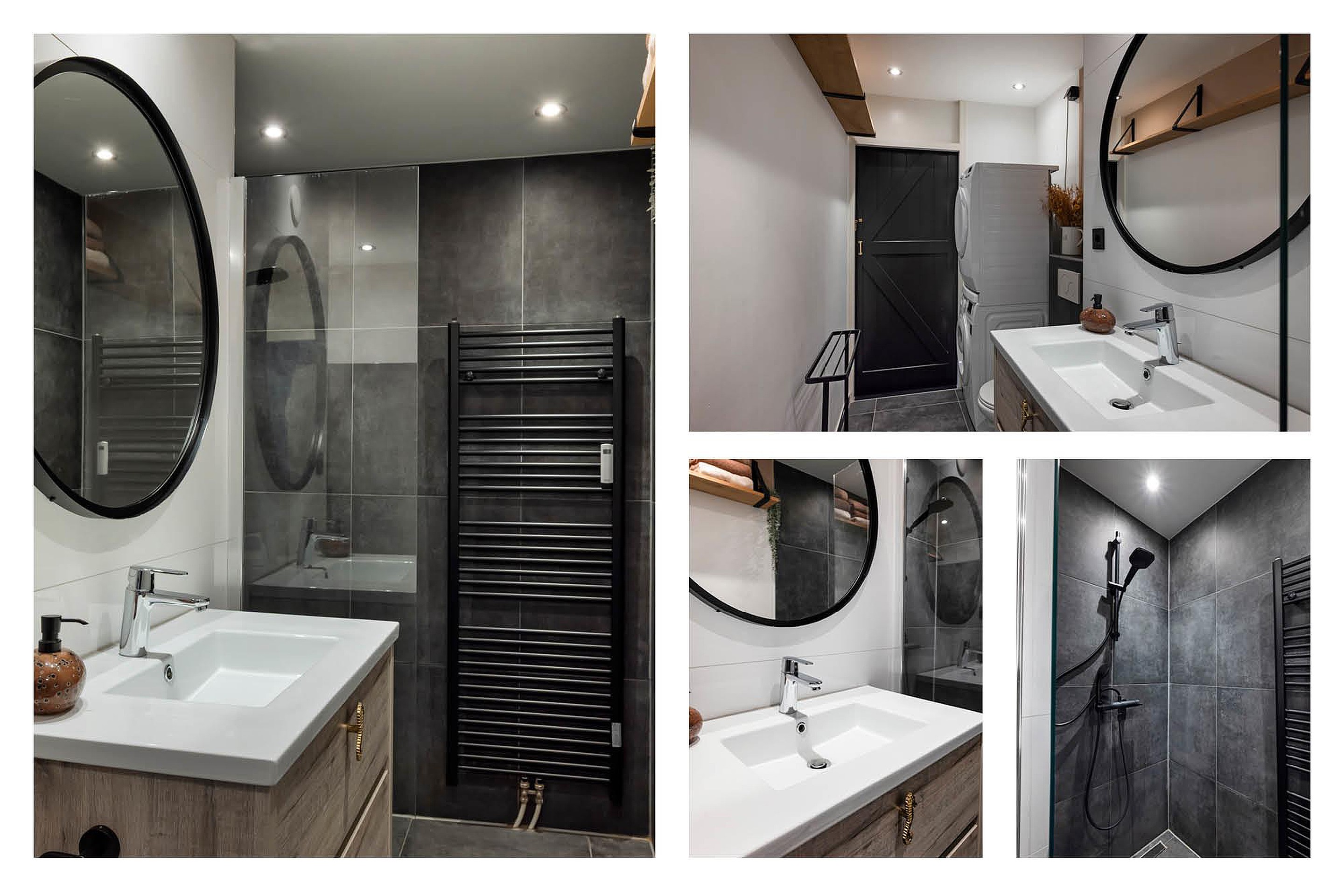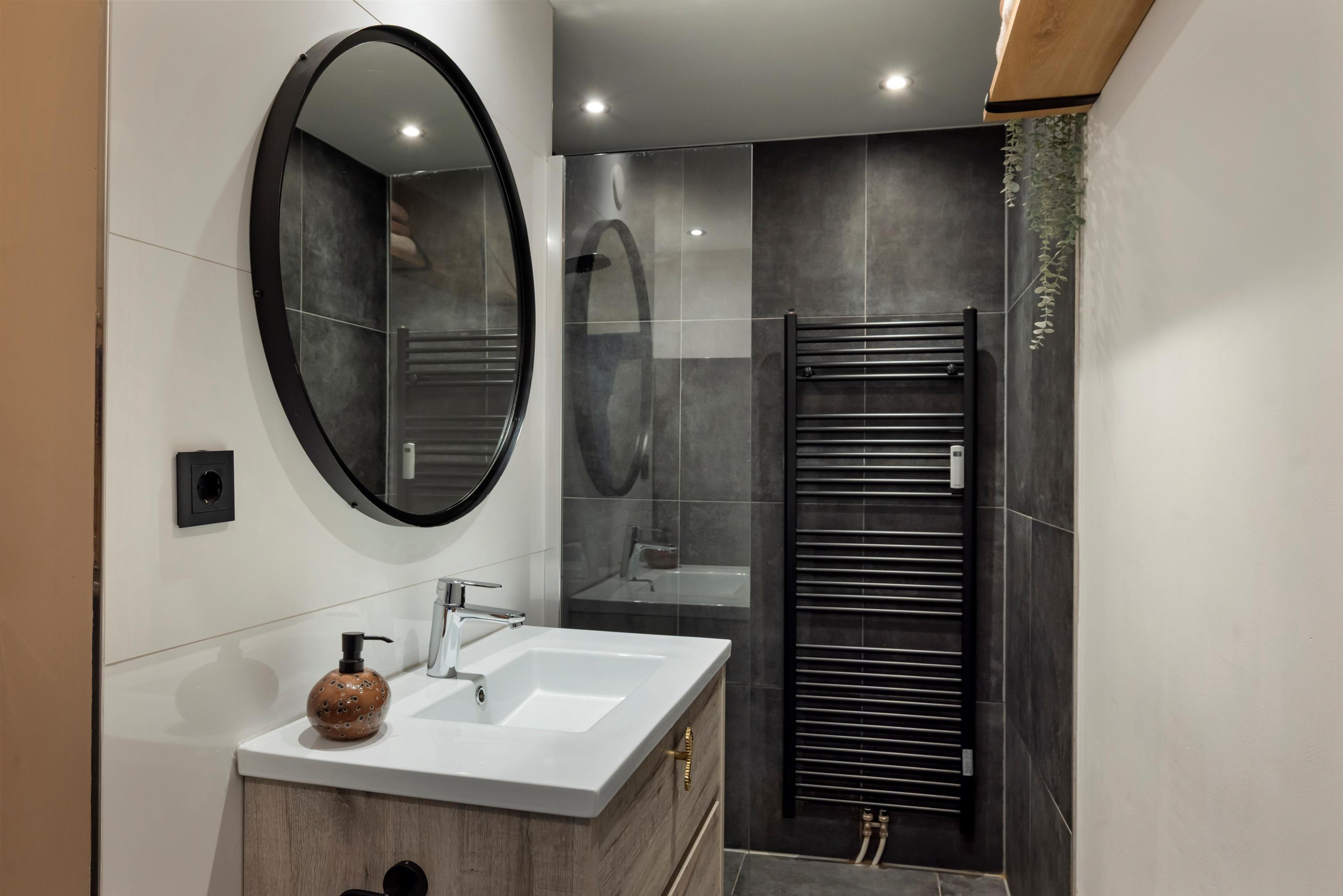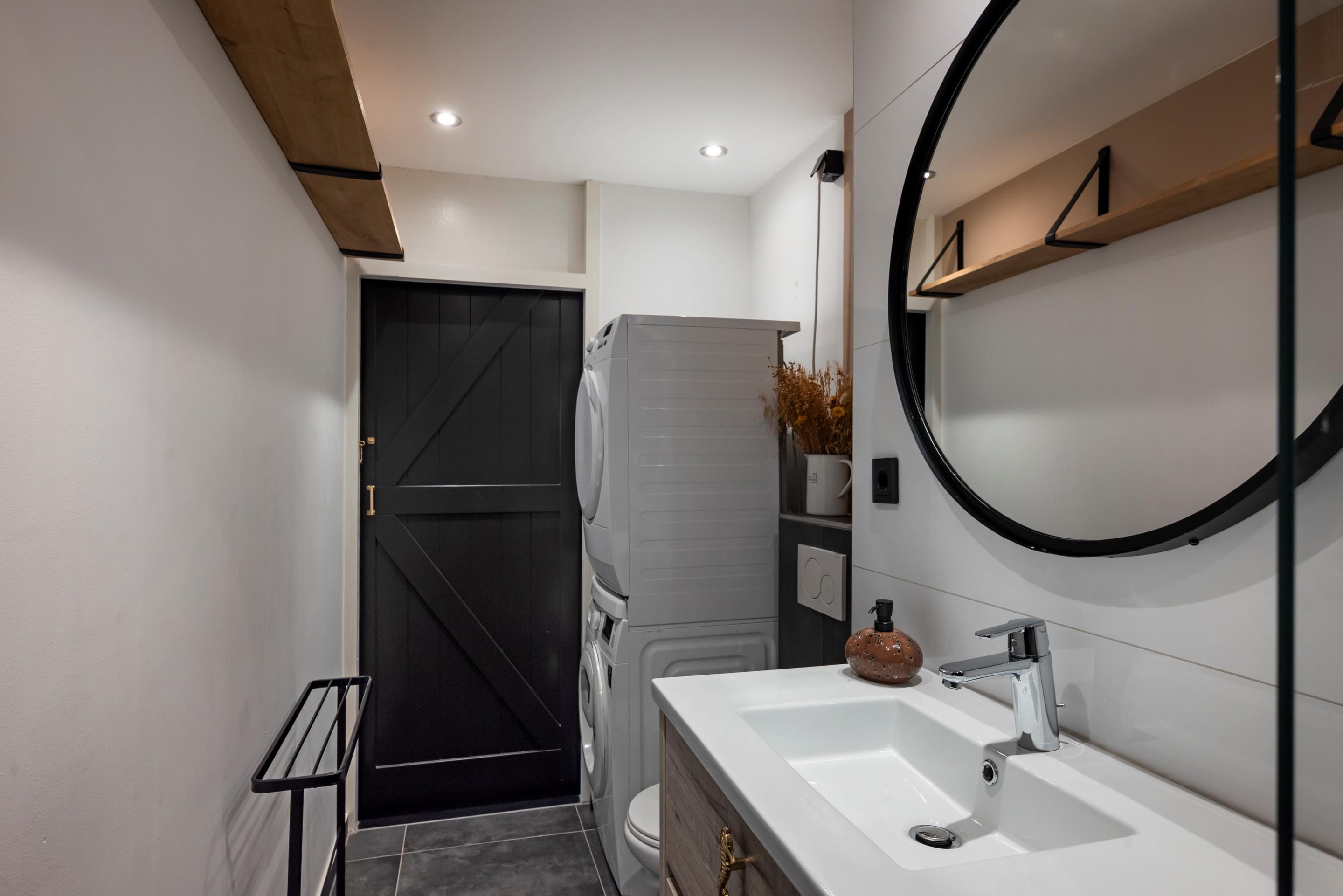 De badkamer met (loft)schuifdeur is modern en compleet uitgevoerd met een ruime inloopdouche, een strak wastafelmeubel, toilet, design radiator en de aansluitingen voor de wasmachine/ droger.