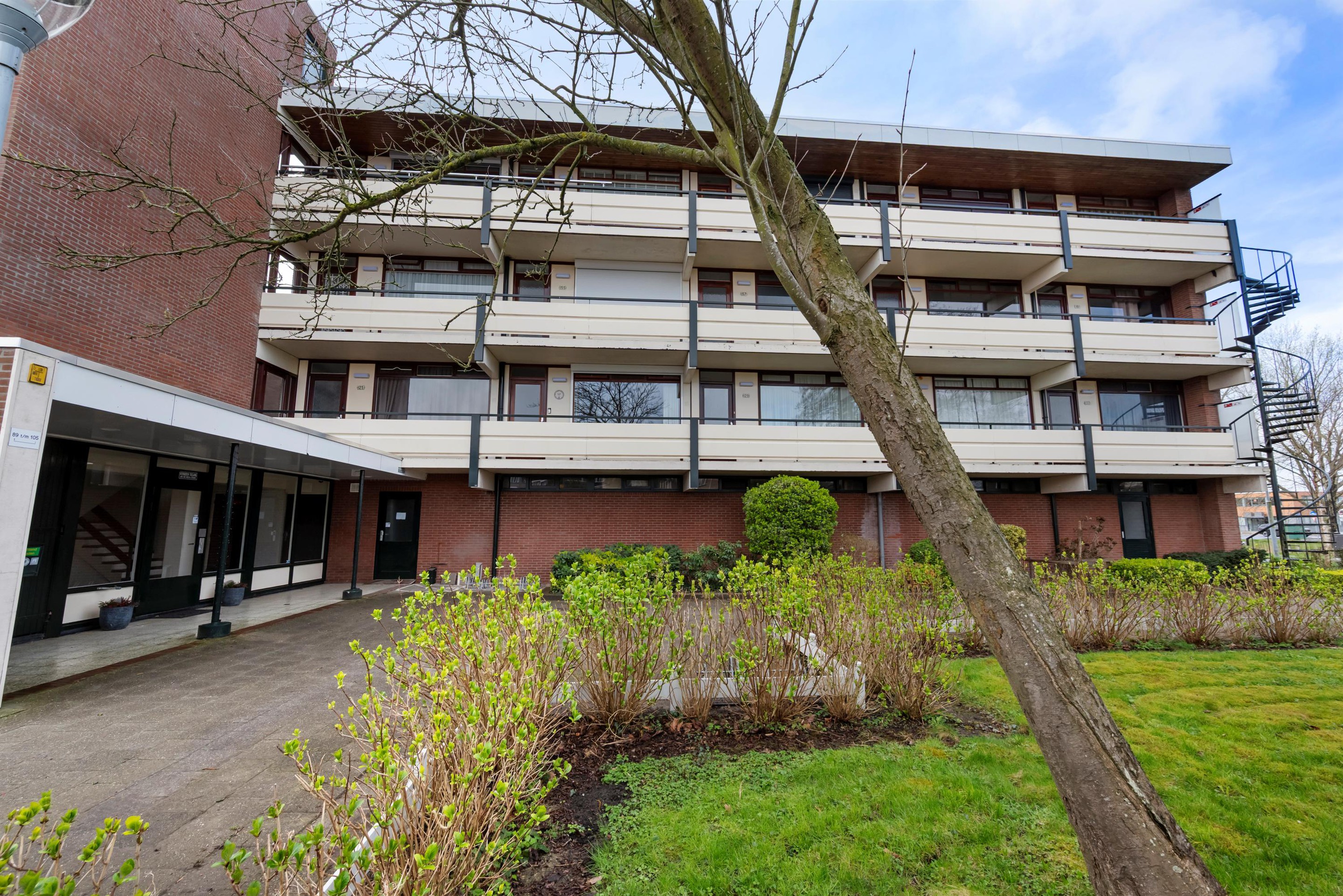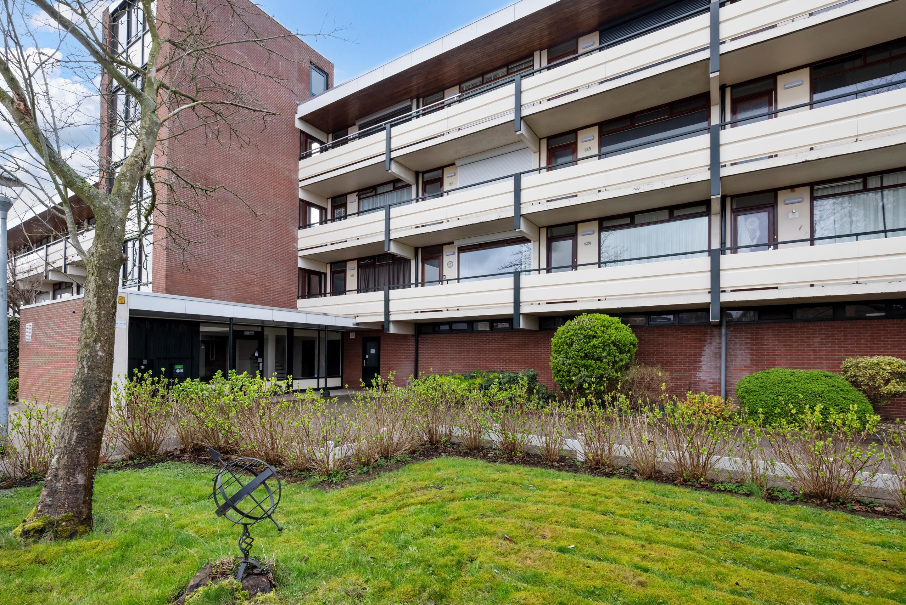 Centrale entree met brievenbussen, toegang tot de algemene fietsenberging en de eigen berging, het trappenhuis en de lift.