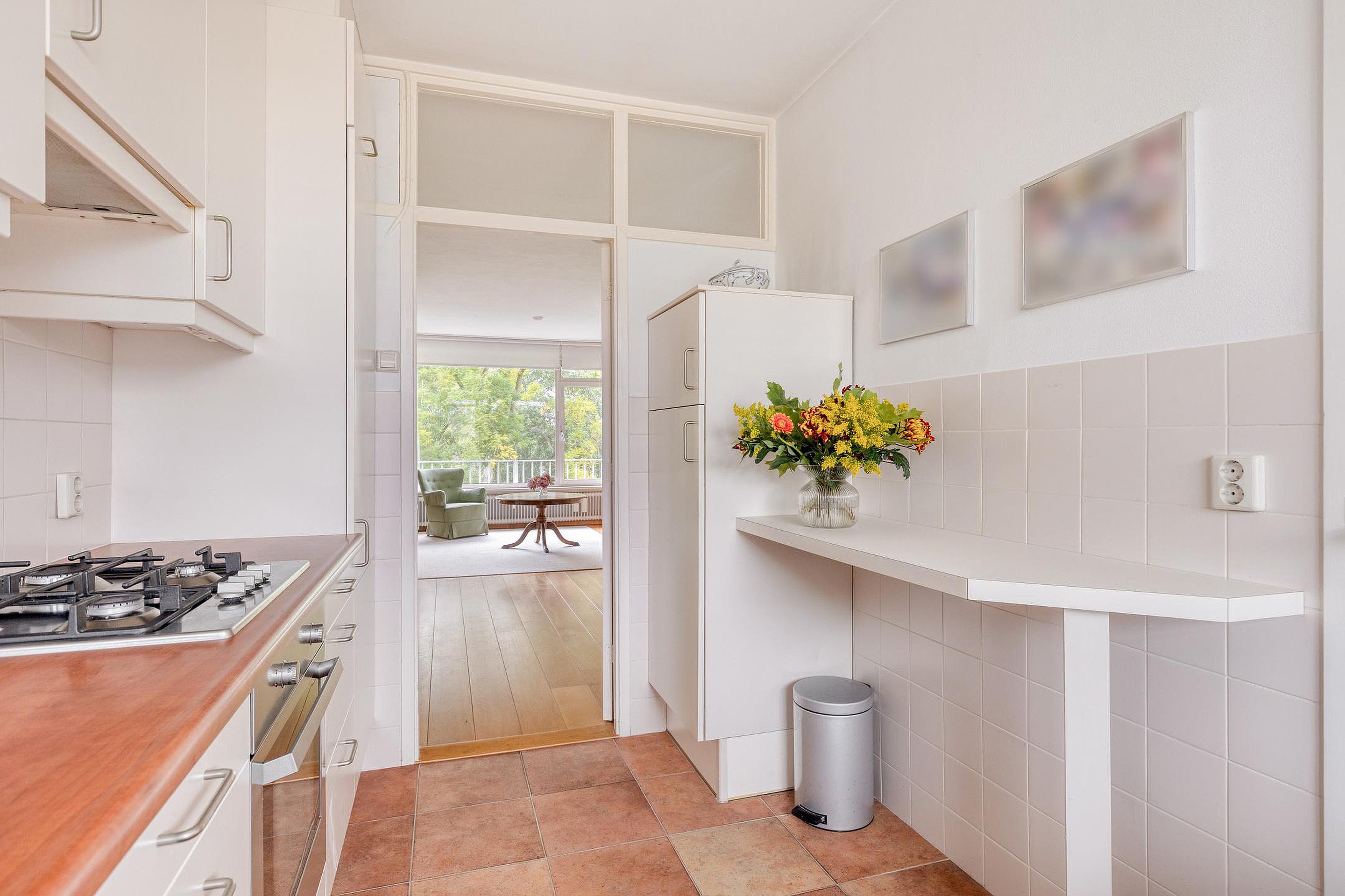 Aan de voorzijde van het appartement is de keuken met diverse apparatuur (o.a. oven, koel/vriescombinatie en aansluitpunt voor de wasmachine). Ook zit in de keuken (in een kast) de boiler. Via een tussenhal met toilet met fonteintje en een handige vaste kast bereikt u de beide slaapkamers. De ruime (hoofd)slaapkamer beschikt over een ingebouwde kast en vanuit deze slaapkamer is de badkamer met douche en wastafel te bereiken. De tweede slaapkamer is aan de balkon-/parkzijde.
