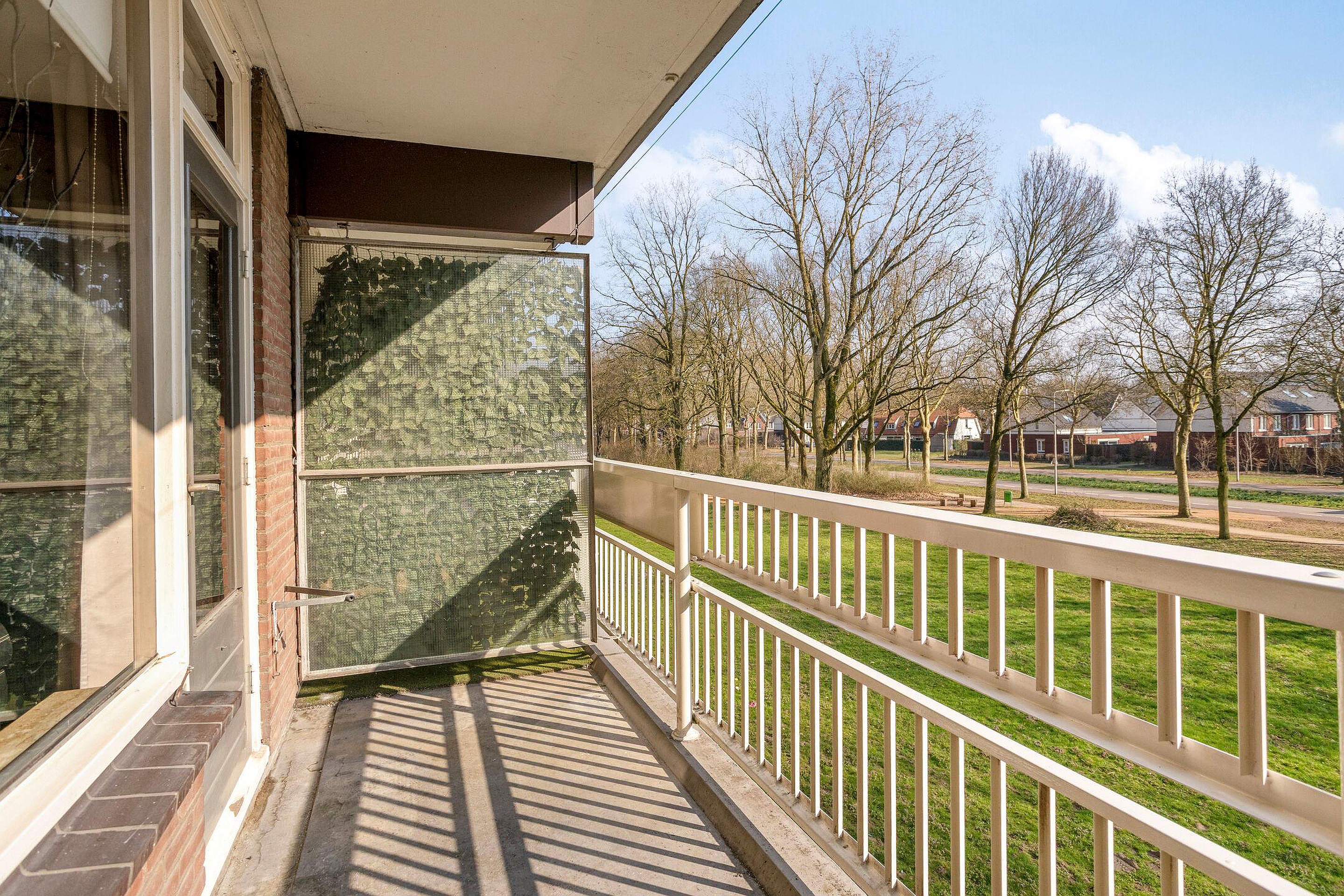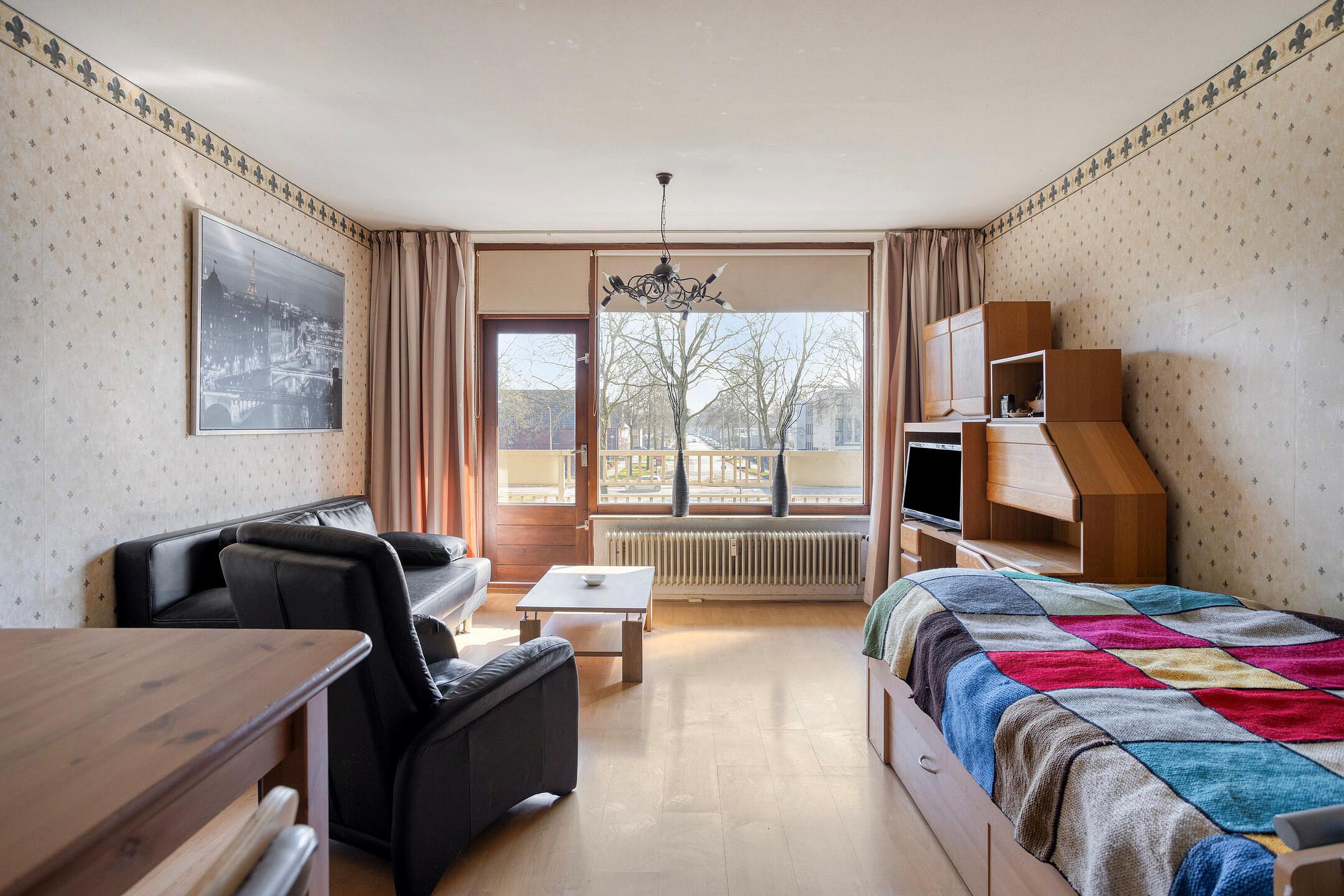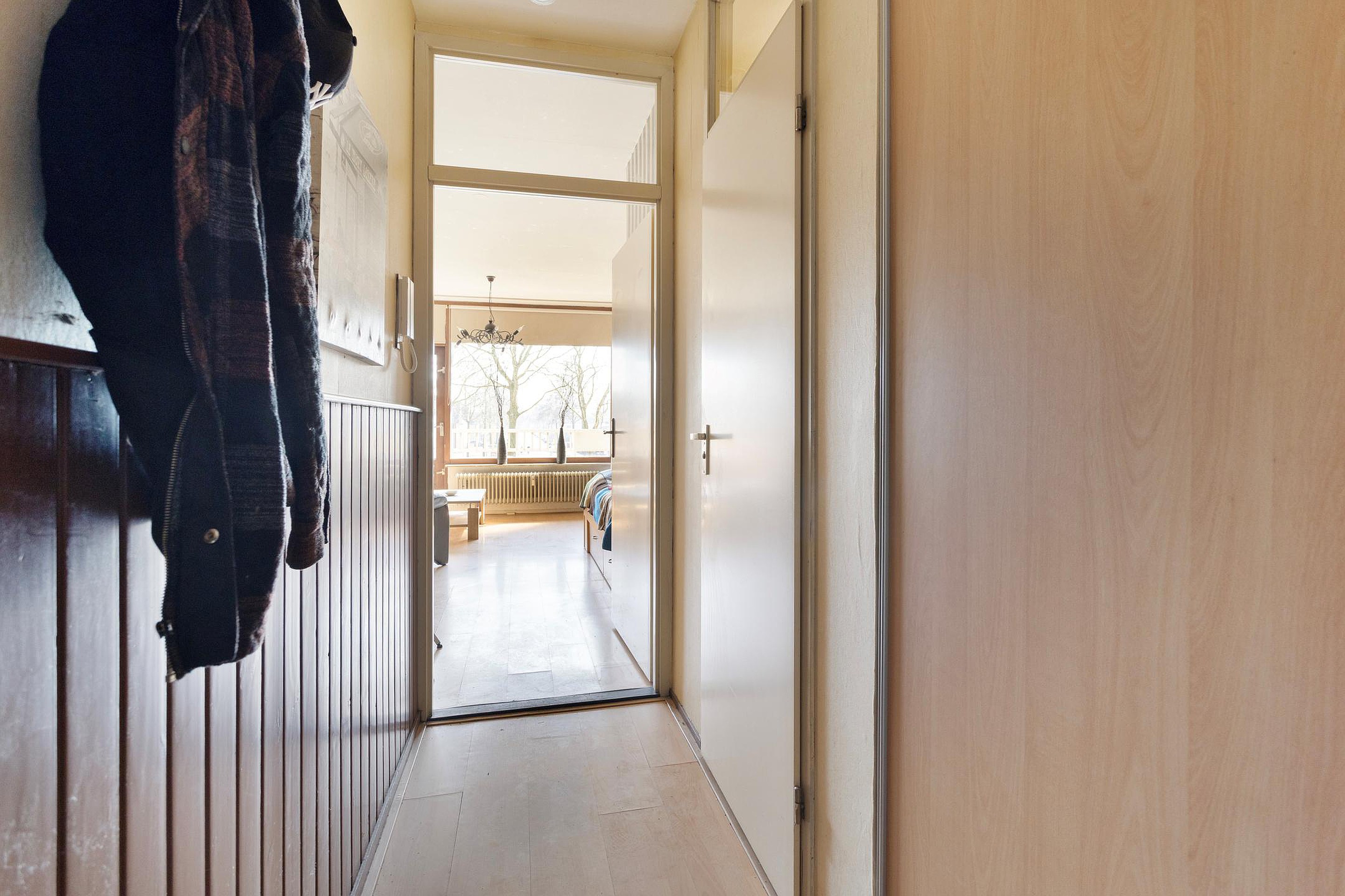 Begane grond Het appartementengebouw beschikt over een ruime centrale entree met moderne intercom. Hier bevinden zich ook de brievenbussen, de toegang tot de bergingen (waaronder de eigen berging) en de toegang naar het trappenhuis en de twee liften (één voor de even en één voor de oneven verdiepingen). Aangekomen op de 2e verdieping wordt het appartement vanuit de galerij overdekt betreden via de hal, waar zich de intercom-bediening, de kapstok en (in een praktische schuifkast) de meterkast/groepenkast bevinden. De hal is afgewerkt met een laminaatvloer, behangen/gelambriseerde wanden en geverfd plafond. Vanuit de hal zijn de badkamer en woonkamer bereikbaar. De badkamer -met tegelvloer, deels betegelde/deels geverfde wanden en geverfd plafond- is ingericht met een instapdouche, vaste wastafel en staand toilet. De woonkamer annex slaapkamer is evenals de hal afgewerkt met een laminaatvloer, behangen wanden en geverfd plafond en gelegen aan de voorzijde van het complex. De grote raampartijen zorgen er voor veel lichtinval en een vrij uitzicht op de groenstrook en de brede Joannes Zwijsenlaan. Vanaf het zonnige, op het zuidoosten gelegen balkon welke grenst aan de woonkamer kan men extra genieten van deze mooie ligging. De deels betegelde gesloten keuken is bereikbaar vanuit de woonkamer en is ingericht met een keukenblok inclusief enkele boven- en onderkastjes en keukenapparatuur (elektrische kookplaat en afzuigkap). Ook de wasmachine staat hier opgesteld. De vloer in de keuken is afgewerkt met zeil, terwijl het plafond is geschilderd.