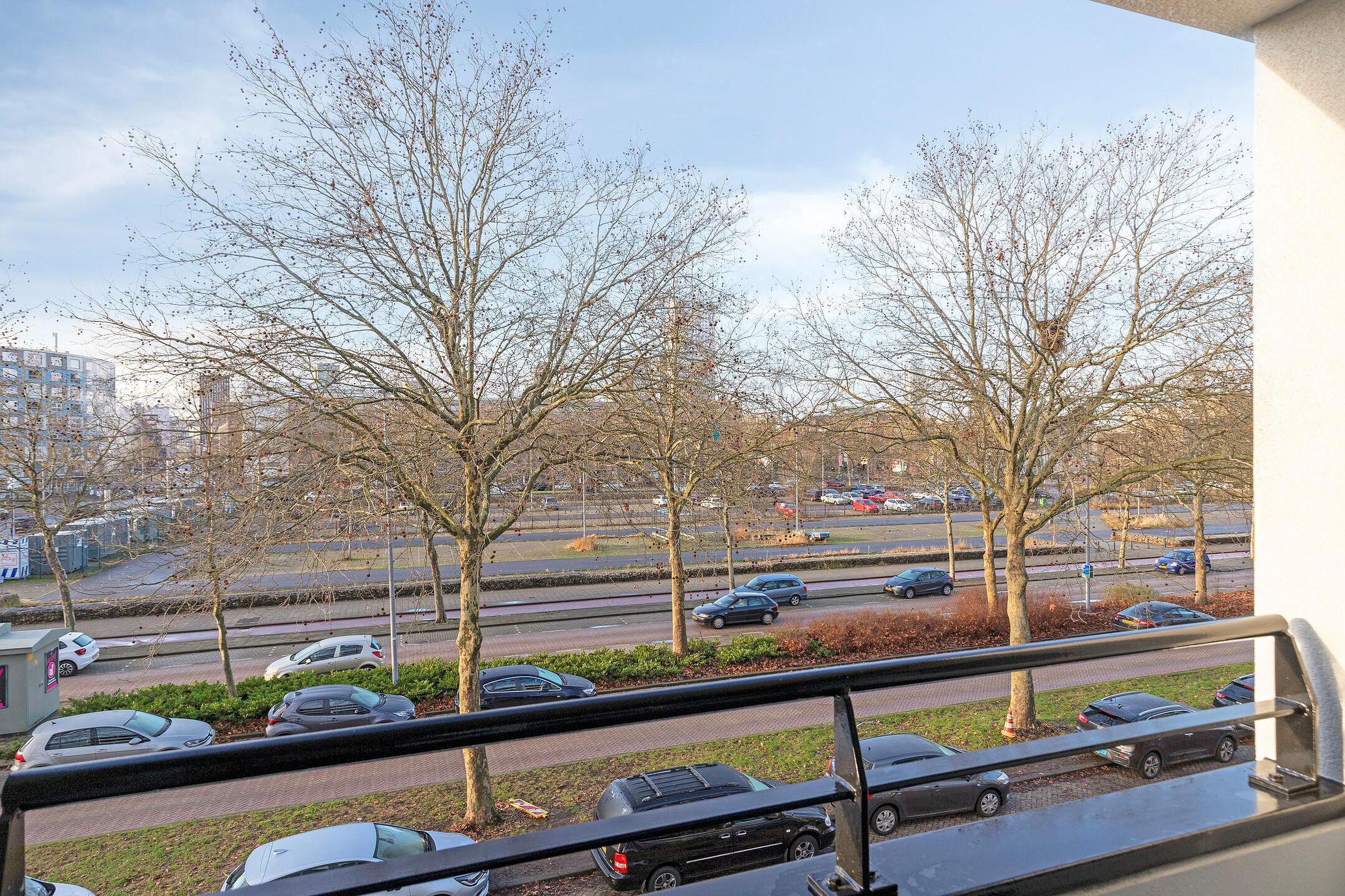 Balkon, een heerlijk zonnig balkon op het zuidwesten, met ook hier een altijd levend uitzicht over de Oranjeboomstraat, met in de verte de Erasmusbrug!