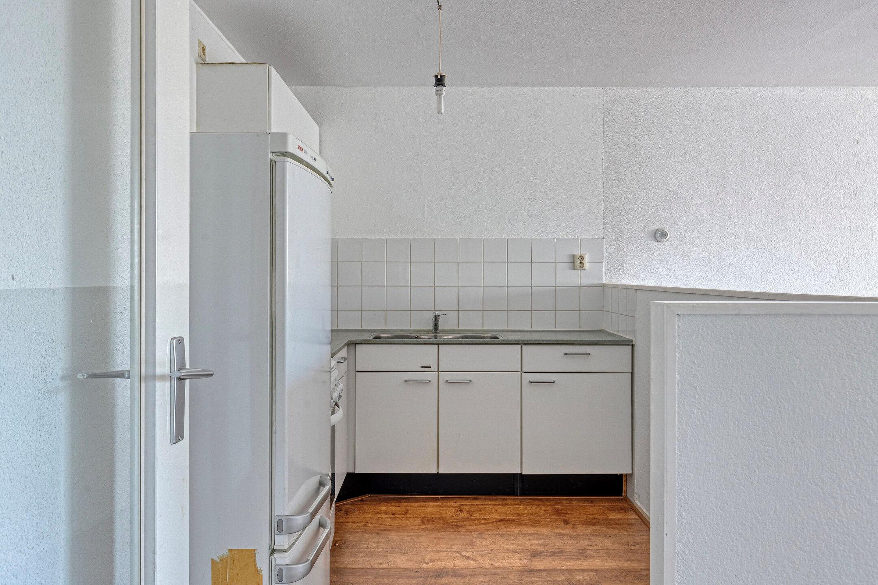 Keuken, een eenvoudige keuken met een keukenblok in L-vormige opstelling. De keuken is voorzien van een dubbele spoelbak, kookplaat, oven en koel-vriescombinatie.