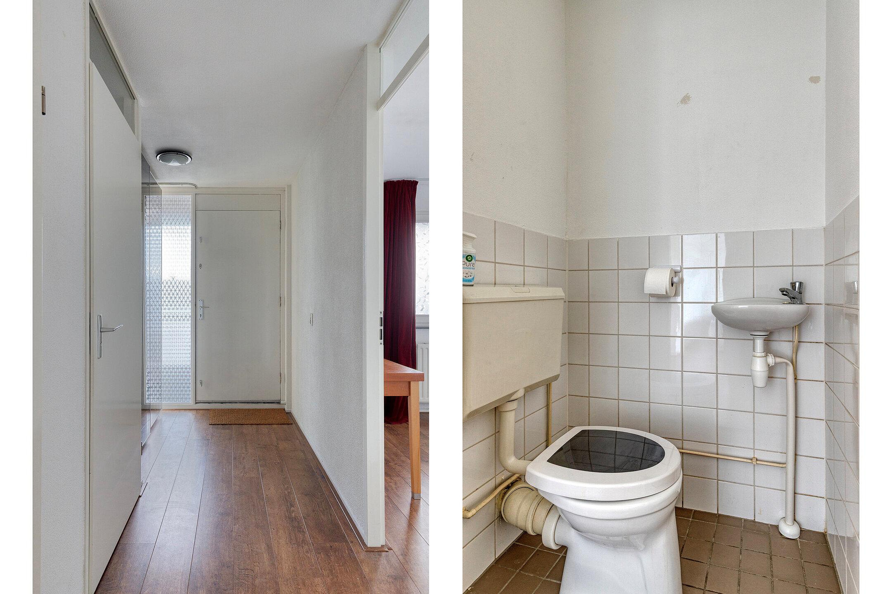 Entree/hal, met toegang tot de keuken/woonkamer, toilet, badkamer, slaapkamer 1, vaste kast met opstelling cv-ketel en de meterkast.