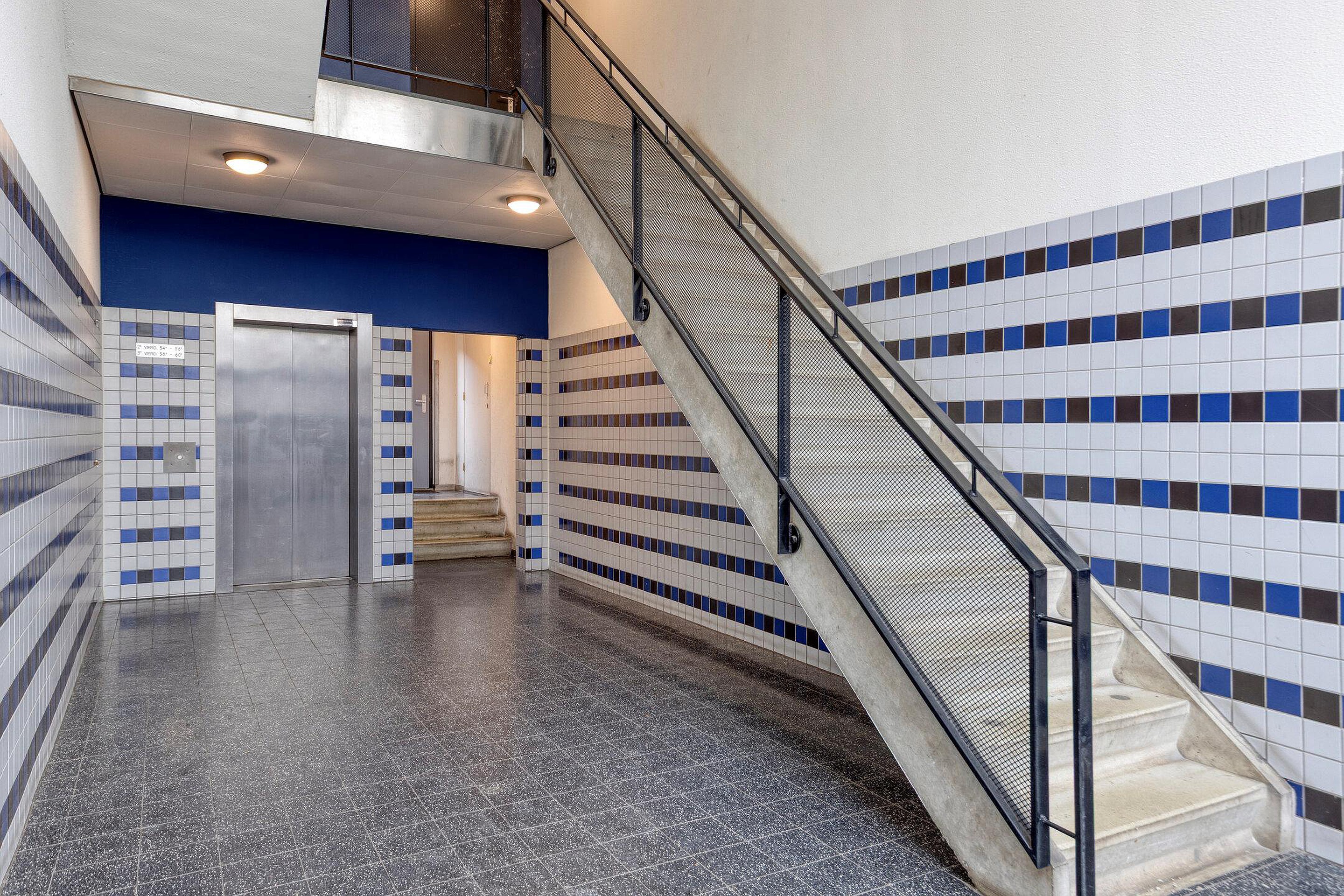 Gesloten entree met brievenbussen en bellentableau, met toegang tot het trappenhuis, liftinstallatie en bergingen.