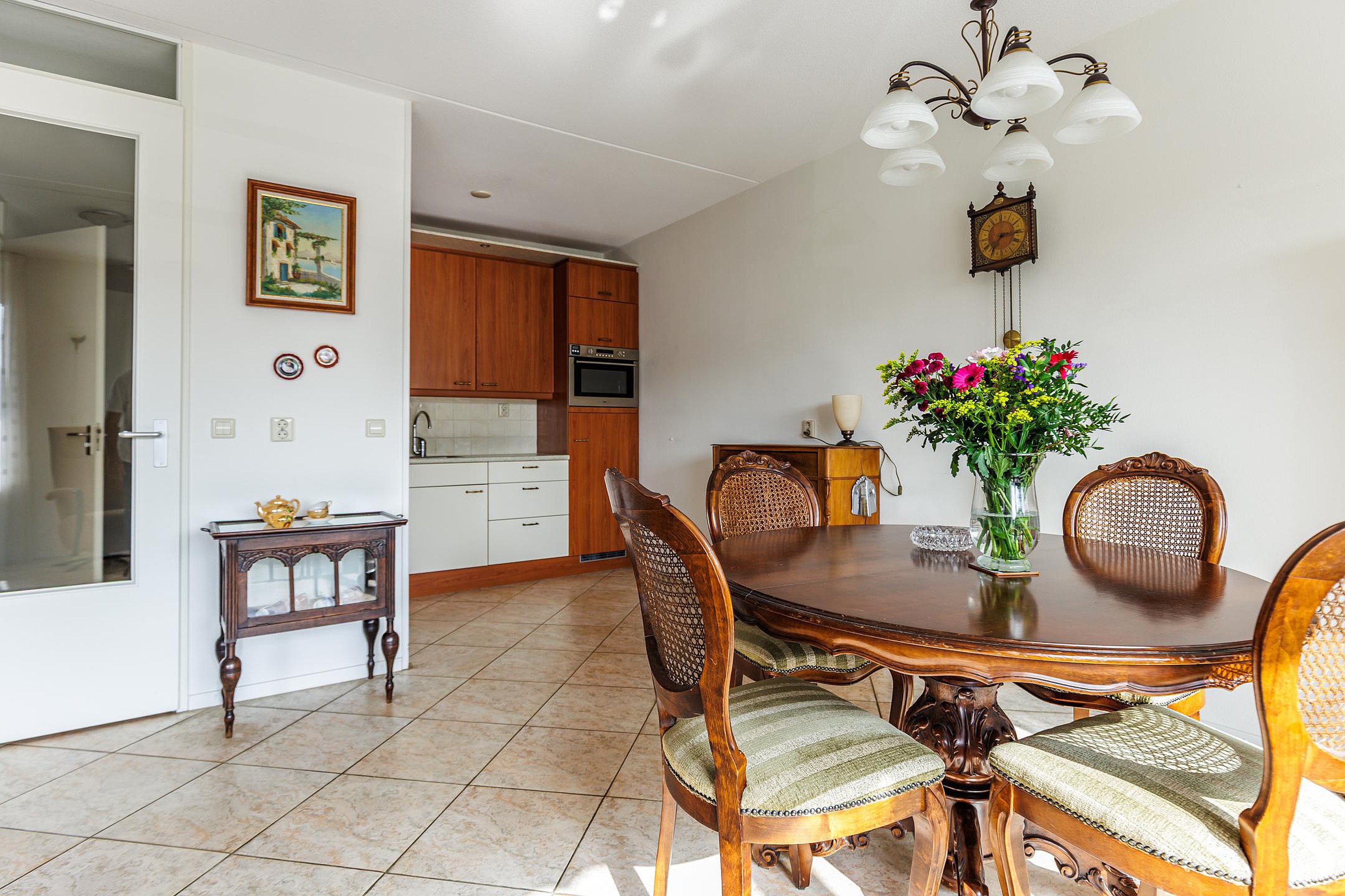 De woonkamer vormt het hart van het appartement. Deze ruimte is opvallend ruim en licht, met voldoende plaats voor een royale zithoek en een eettafel. De open keuken sluit hier naadloos op aan en is opgesteld in een praktische indeling met diverse inbouwapparatuur.
