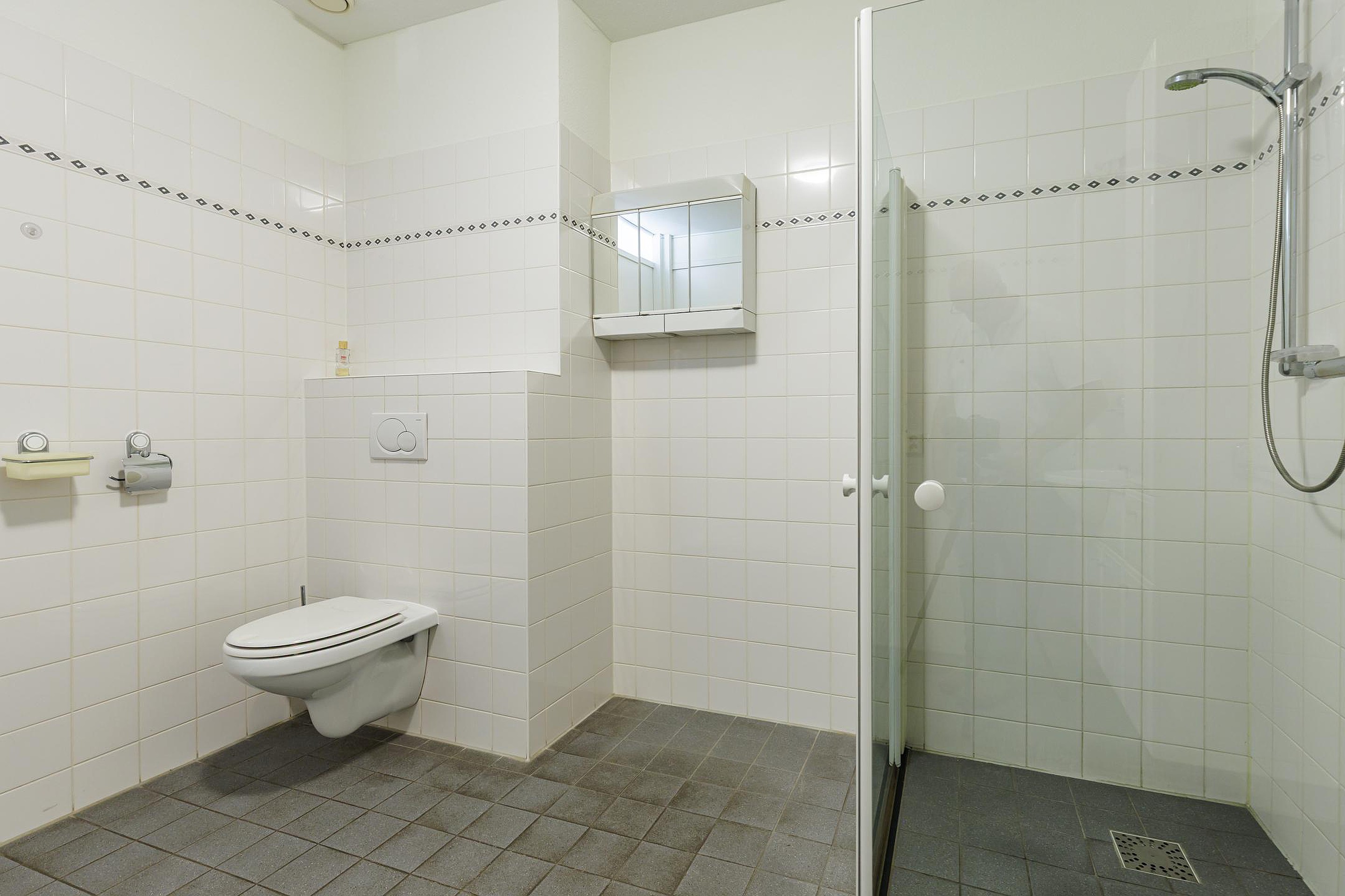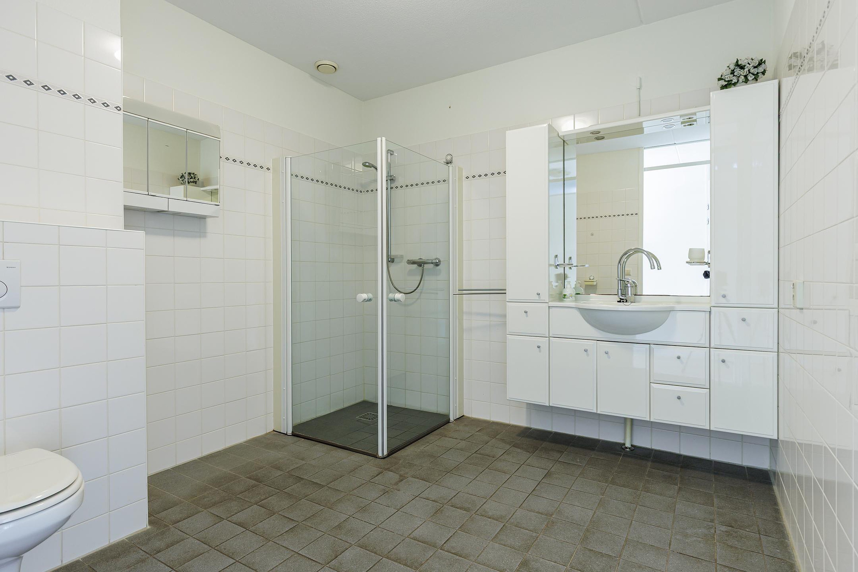 De badkamer is ruim en praktisch ingericht met een toilet, douche en wastafel. Daarnaast is er een handige bijkeuken/wasruimte waar de wasmachine en droger geplaatst kunnen worden.