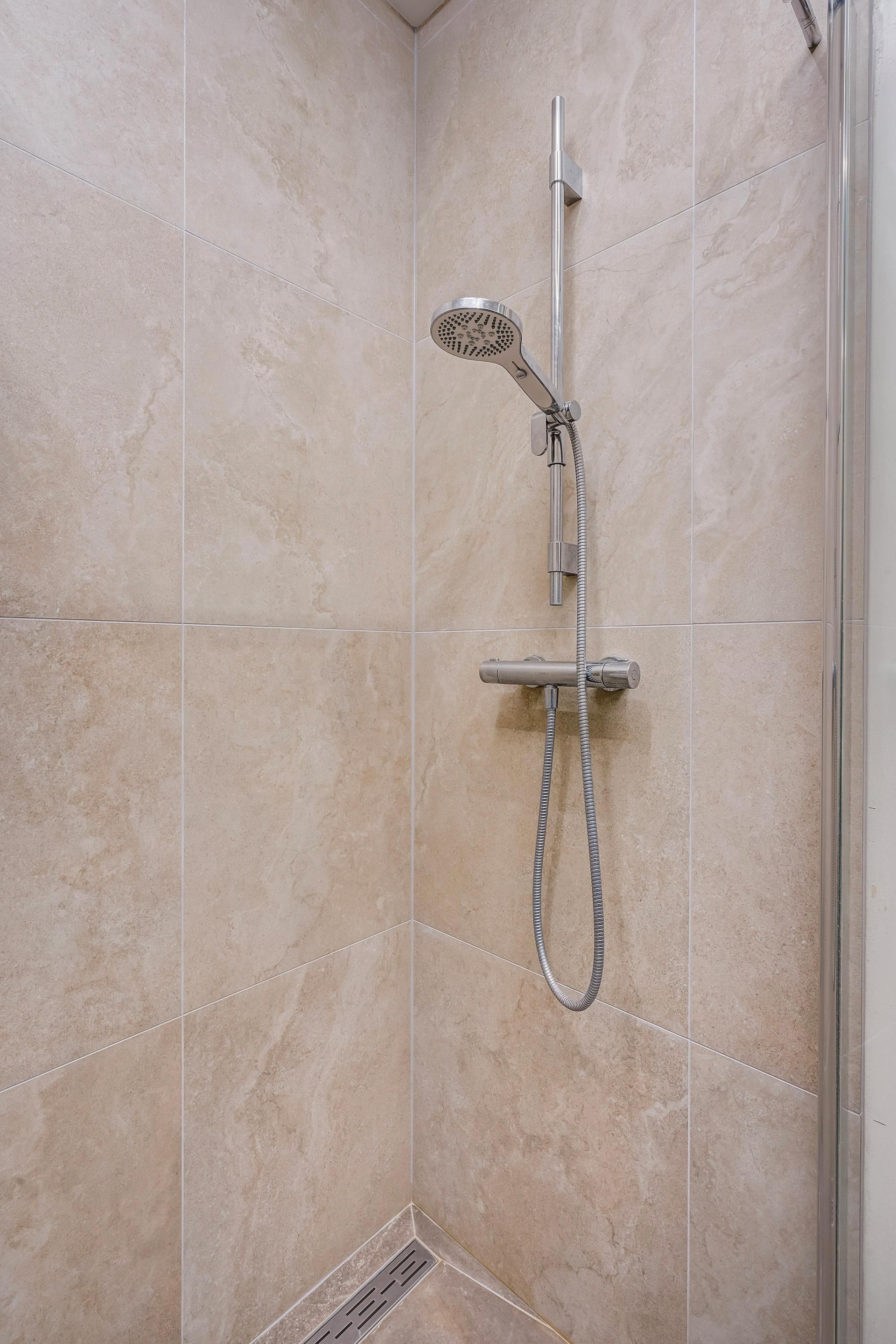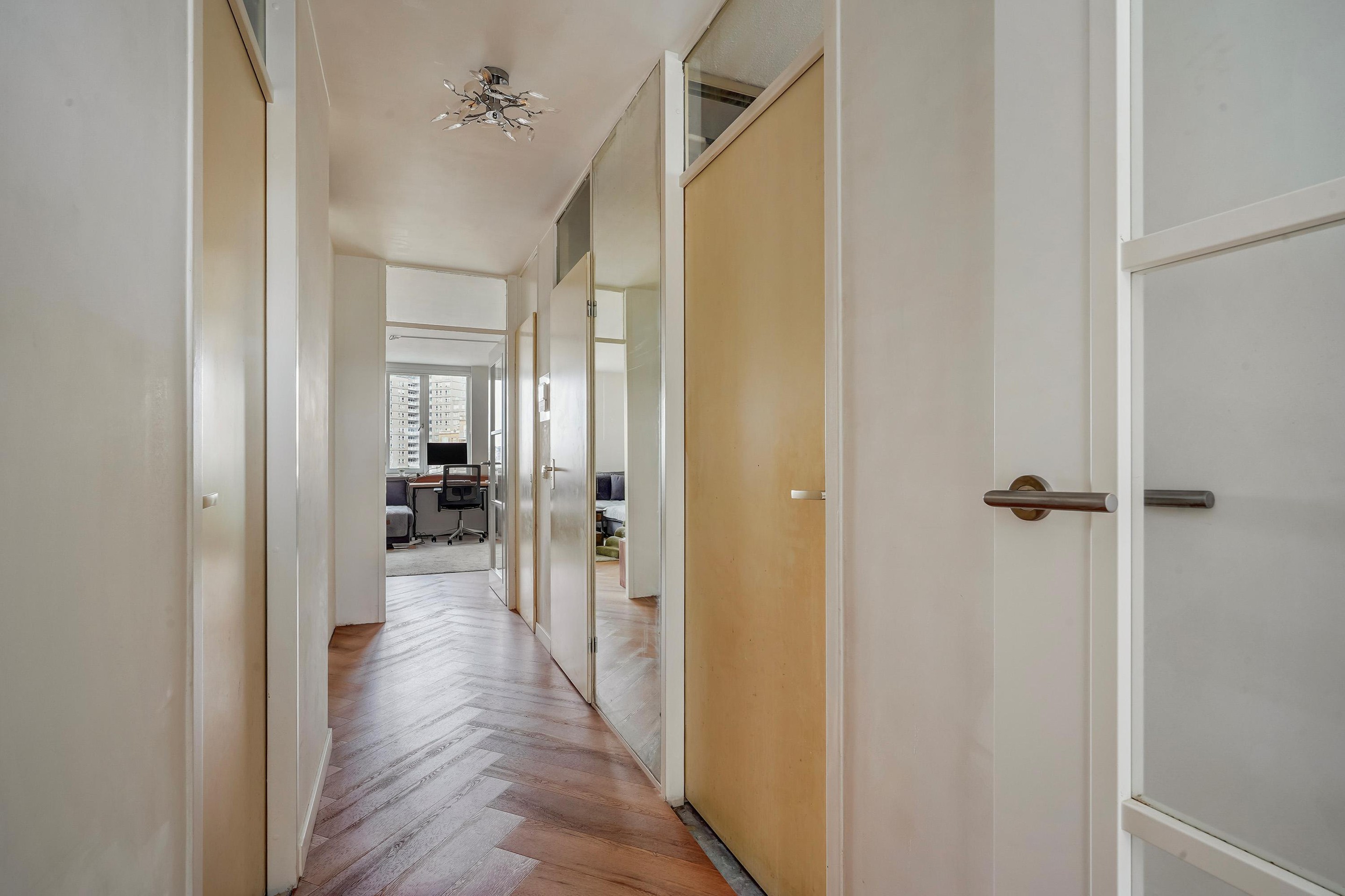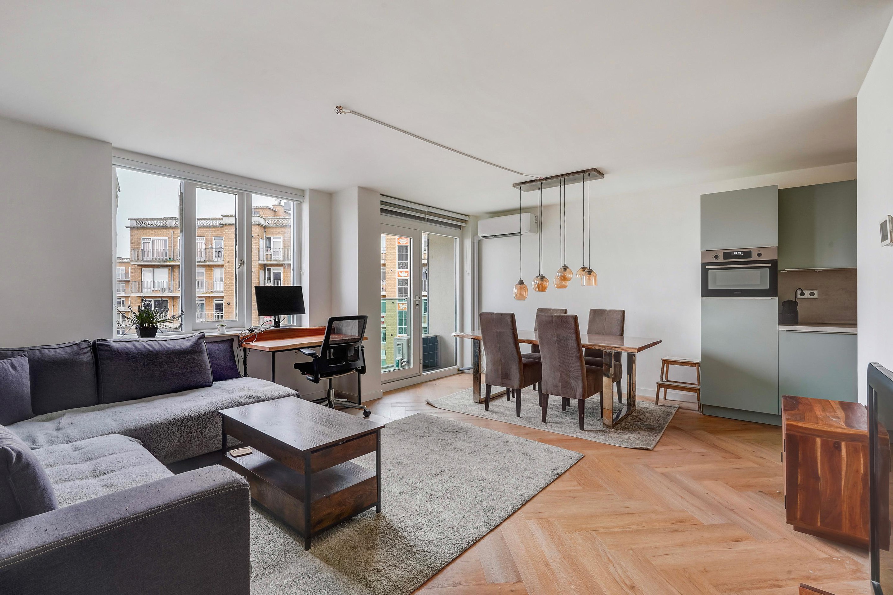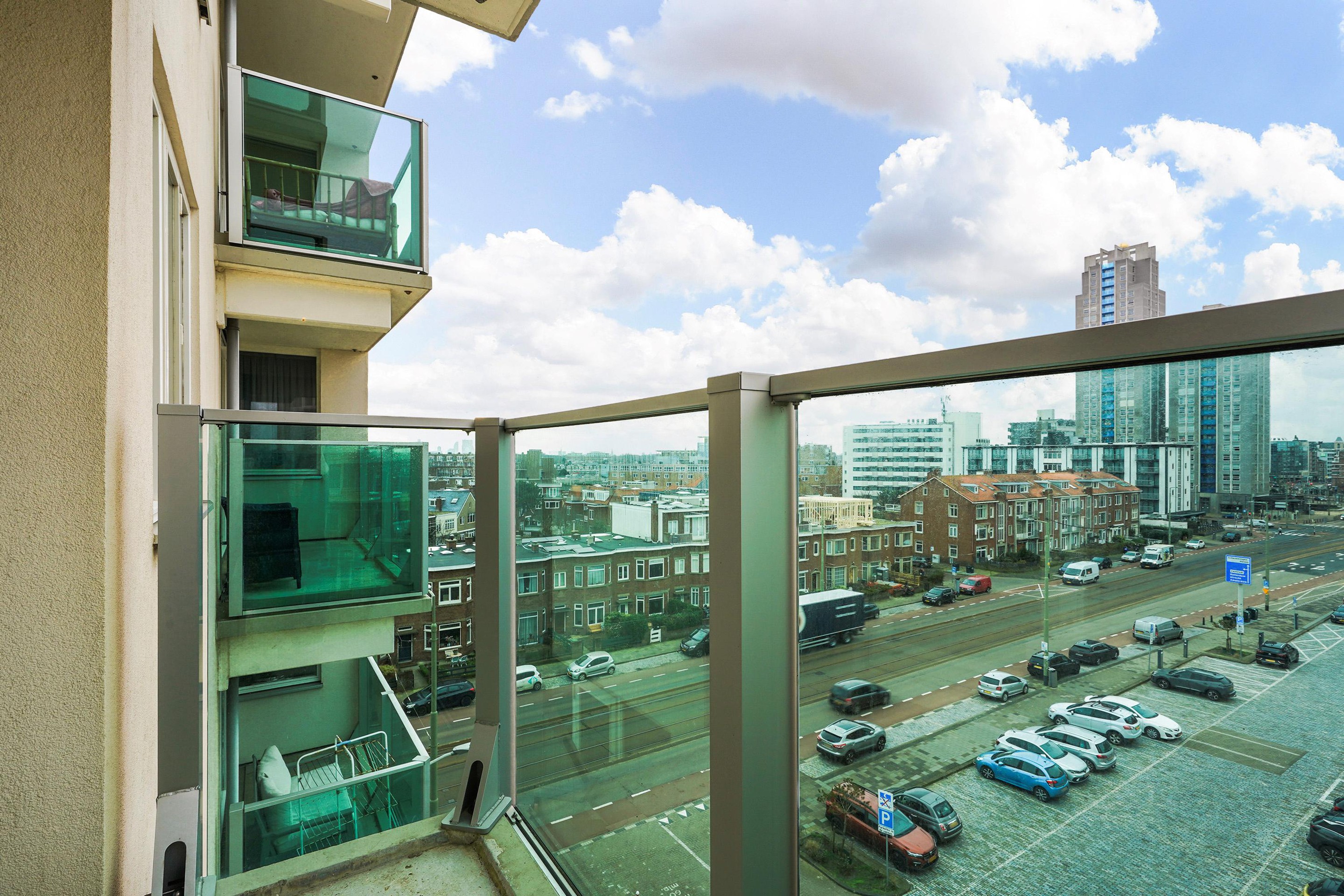 Entree appartement met kast met elektrische boiler en een modern toilet en fontein. Aan de portiekzijde bevinden zich een ruime slaapkamer rechts en een slaapkamer links die uitstekend geschikt is als tweede slaapkamer of werkkamer. De badkamer (2024) is eigentijds uitgevoerd met een ruime douche en een wastafelmeubel. Aan de voorzijde bevindt zich de ruime woonkamer, die licht en sfeervol is, met een nieuwe open keuken (2023) in L-opstelling. De moderne keuken is uitgerust met inbouwapparatuur, waaronder een 4-pits keramische kookplaat, afzuigkap, combi-oven/magnetron, vaatwasser en koelkast. Vanuit de woonkamer is er toegang tot het balkon op het zuidwesten – een fijne plek om van de middag- en avondzon te genieten, met uitzicht over de stad en een doorkijk richting de zeekant. De berging bevindt zich in de onderbouw van het gebouw. De eigen parkeerplaats is direct naast de ingang van de parkeergarage.