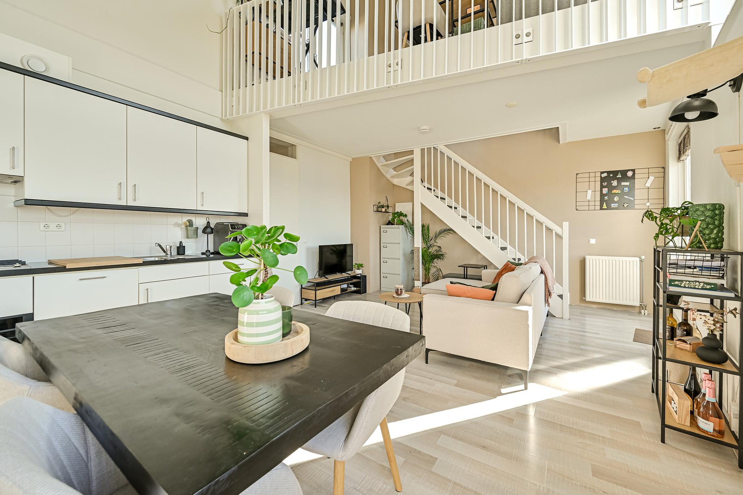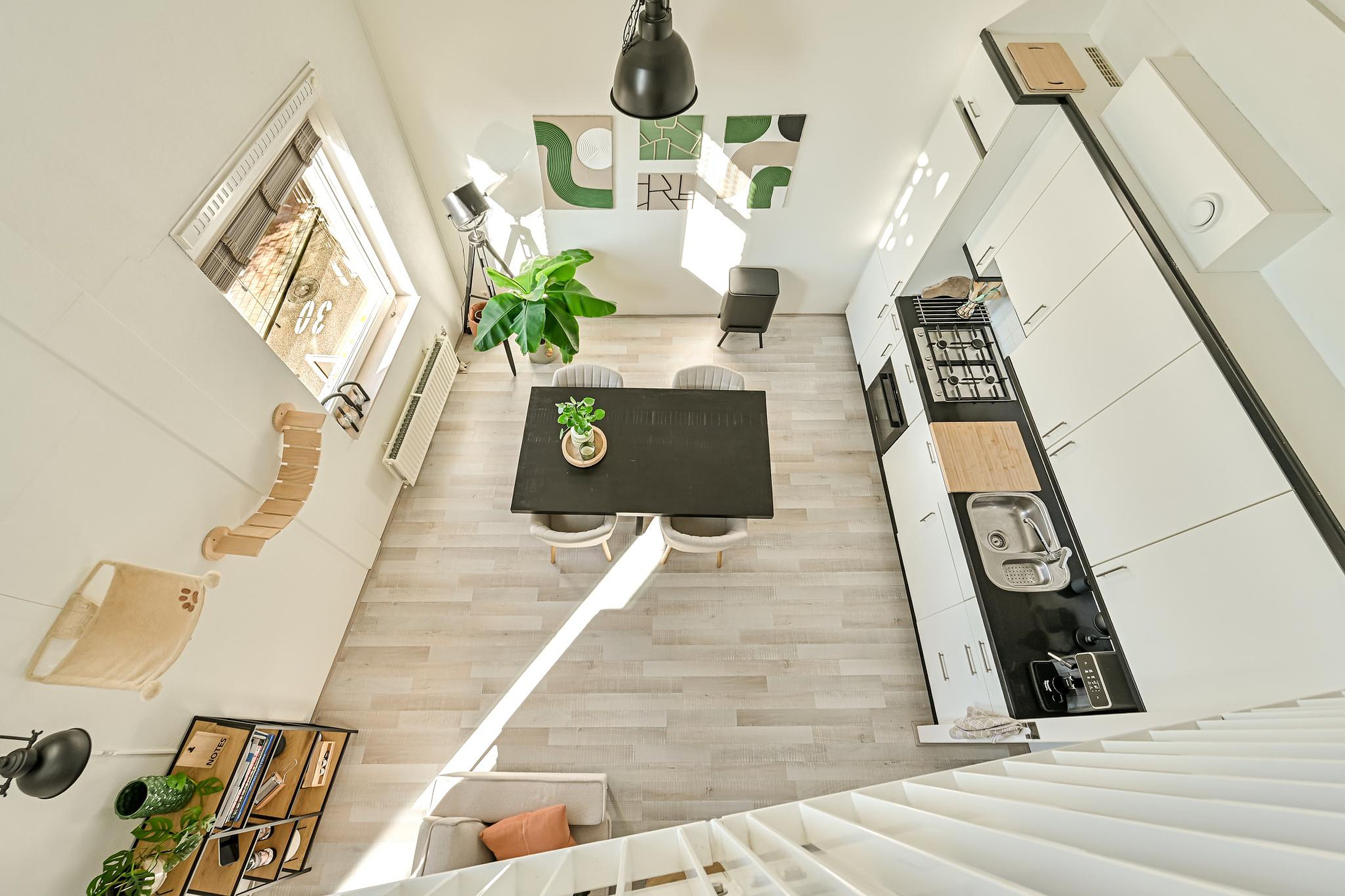 De woonkamer is uniek te noemen door het hoge plafond als gevolg van de dubbele etage. De vele raampartijen, de lichte afwerking en de connectie met het zonnige balkon én de bovengelegen ruimte geven een prettige sfeer en veel zonlicht.