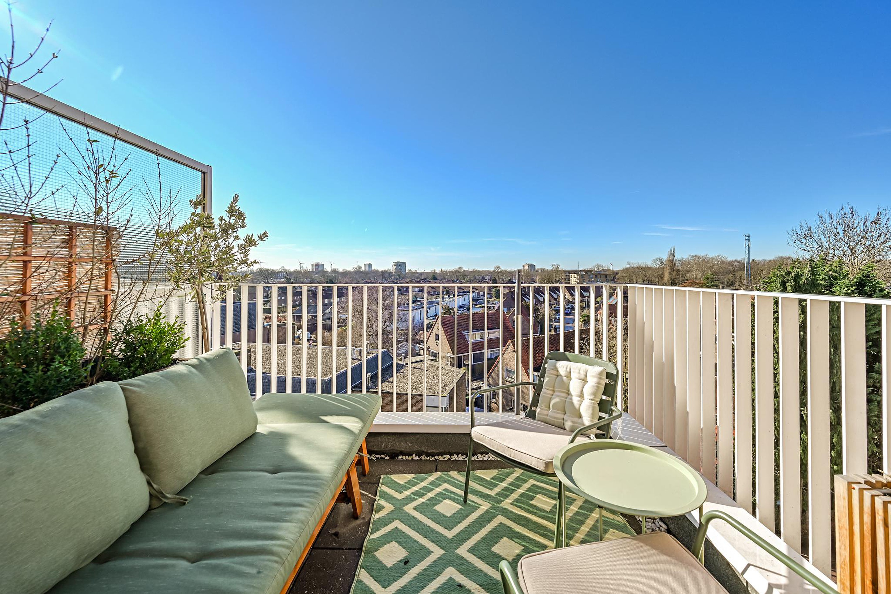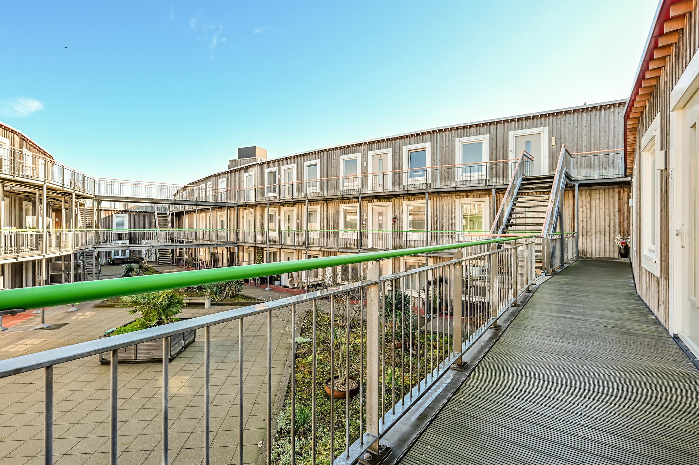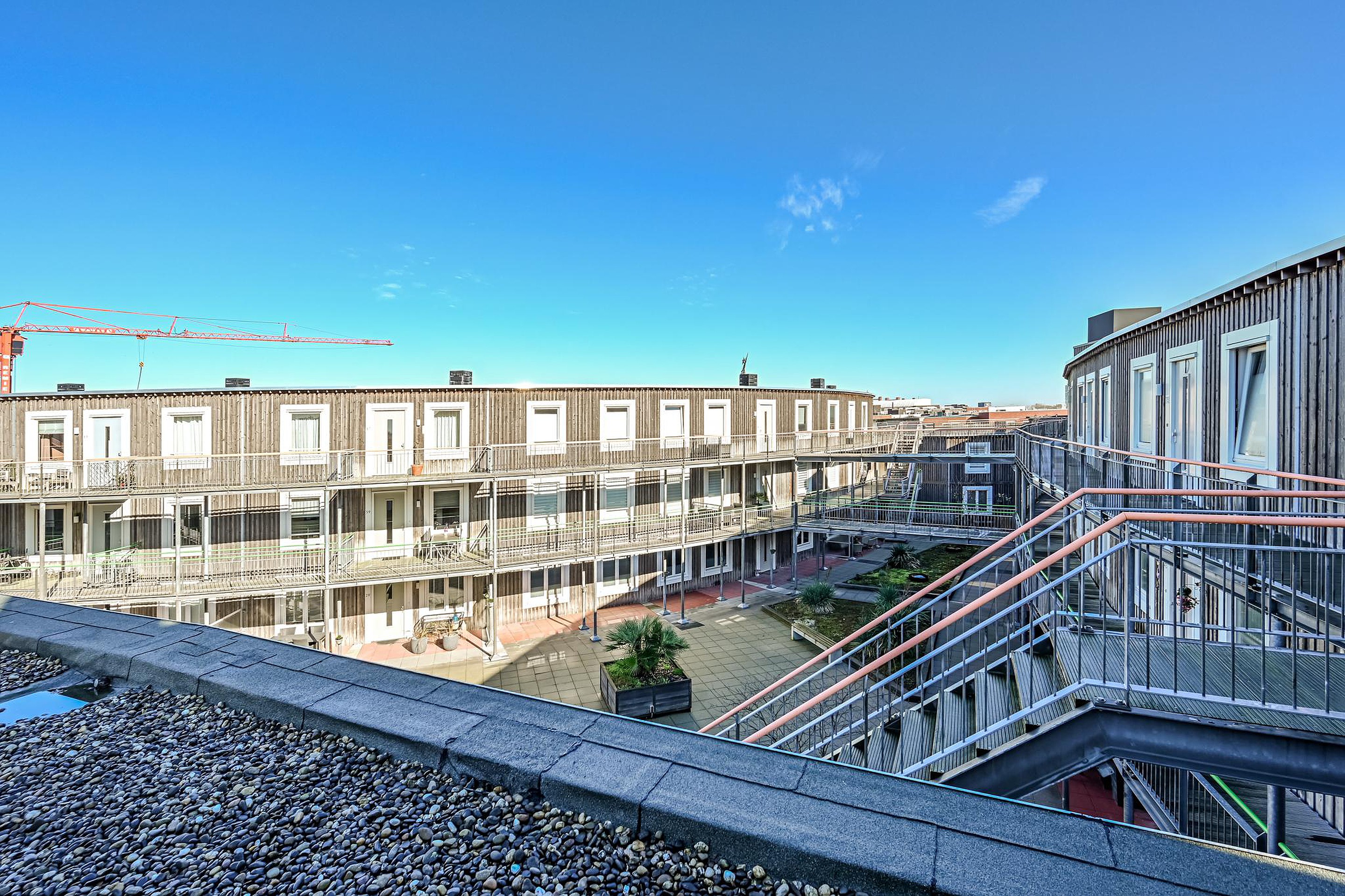 Via de openslaande deuren op de verdieping bereik je het dakterras met zicht op de gallerij(en) en de binnentuin.