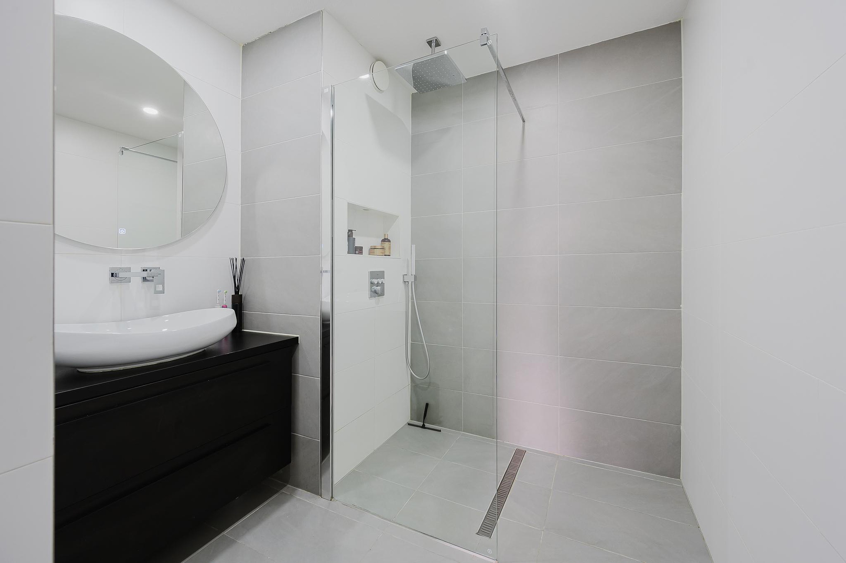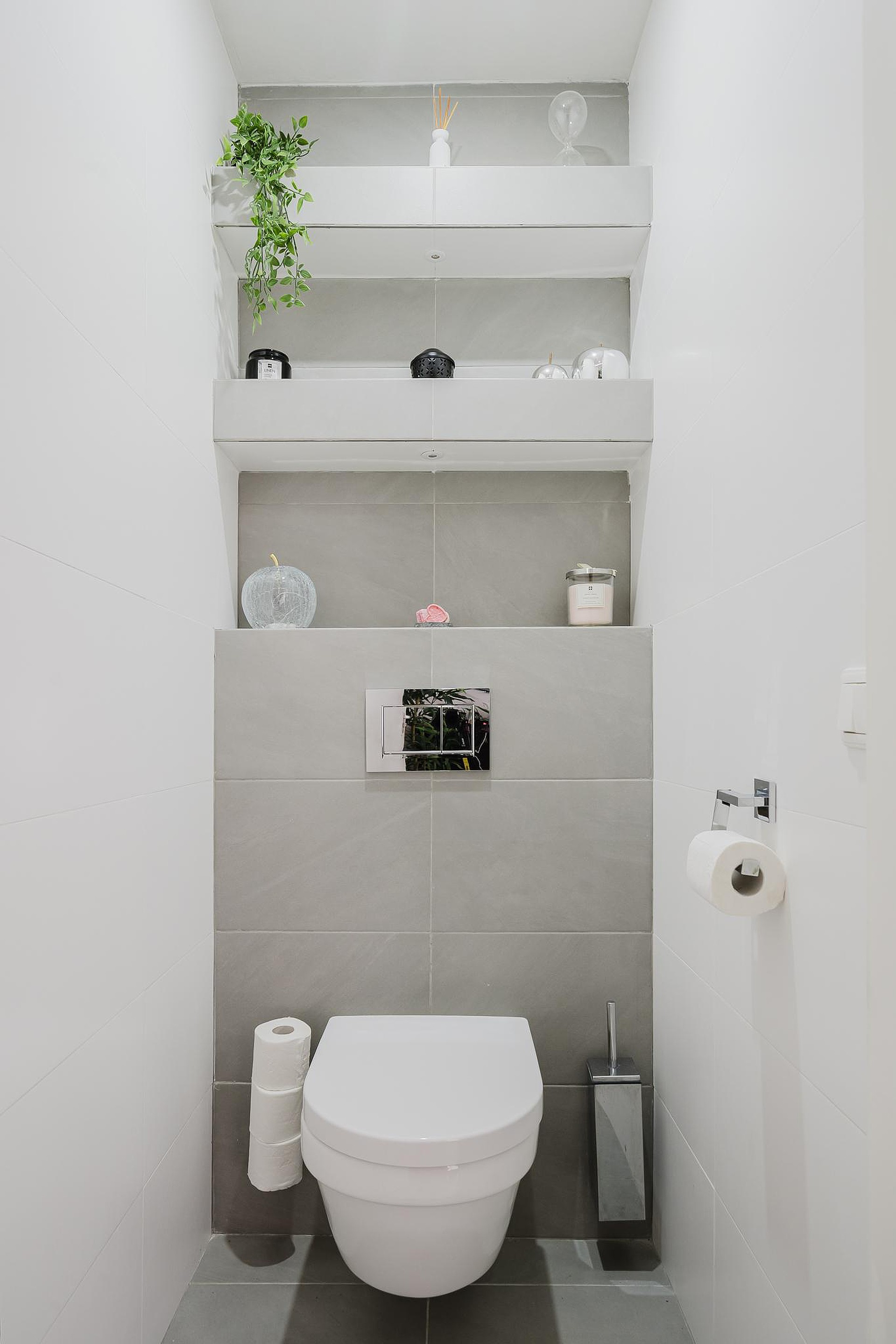 De badkamer (2020) is modern uitgevoerd met een inloopdouche en wastafelmeubel. Het separate toilet (2021) bevindt zich naast de badkamer en is eveneens strak afgewerkt.