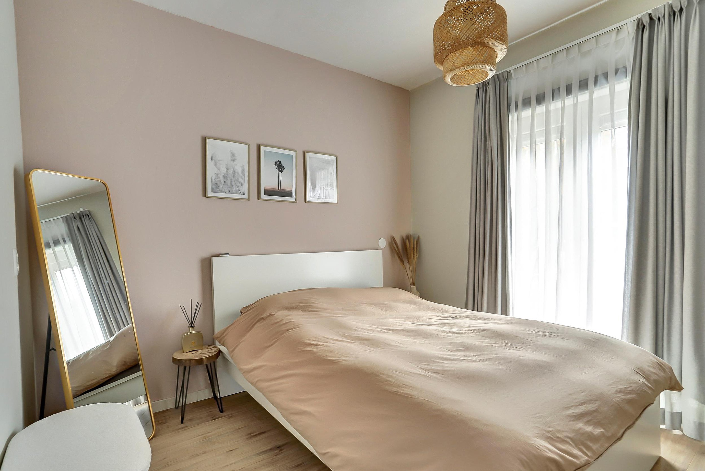 De lichte slaapkamer beschikt over een groot raam en openslaande deuren, wat zorgt voor een prettige, open sfeer. De kamer biedt voldoende ruimte voor een tweepersoonsbed en een kledingkast.