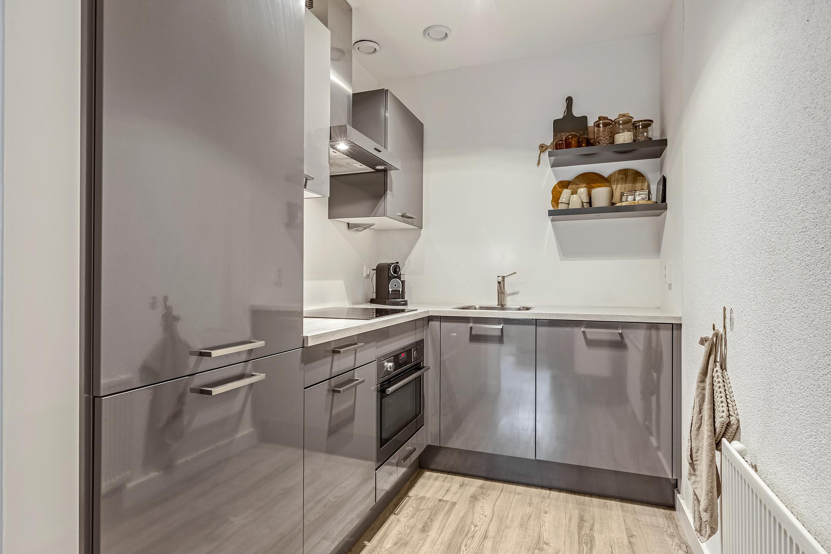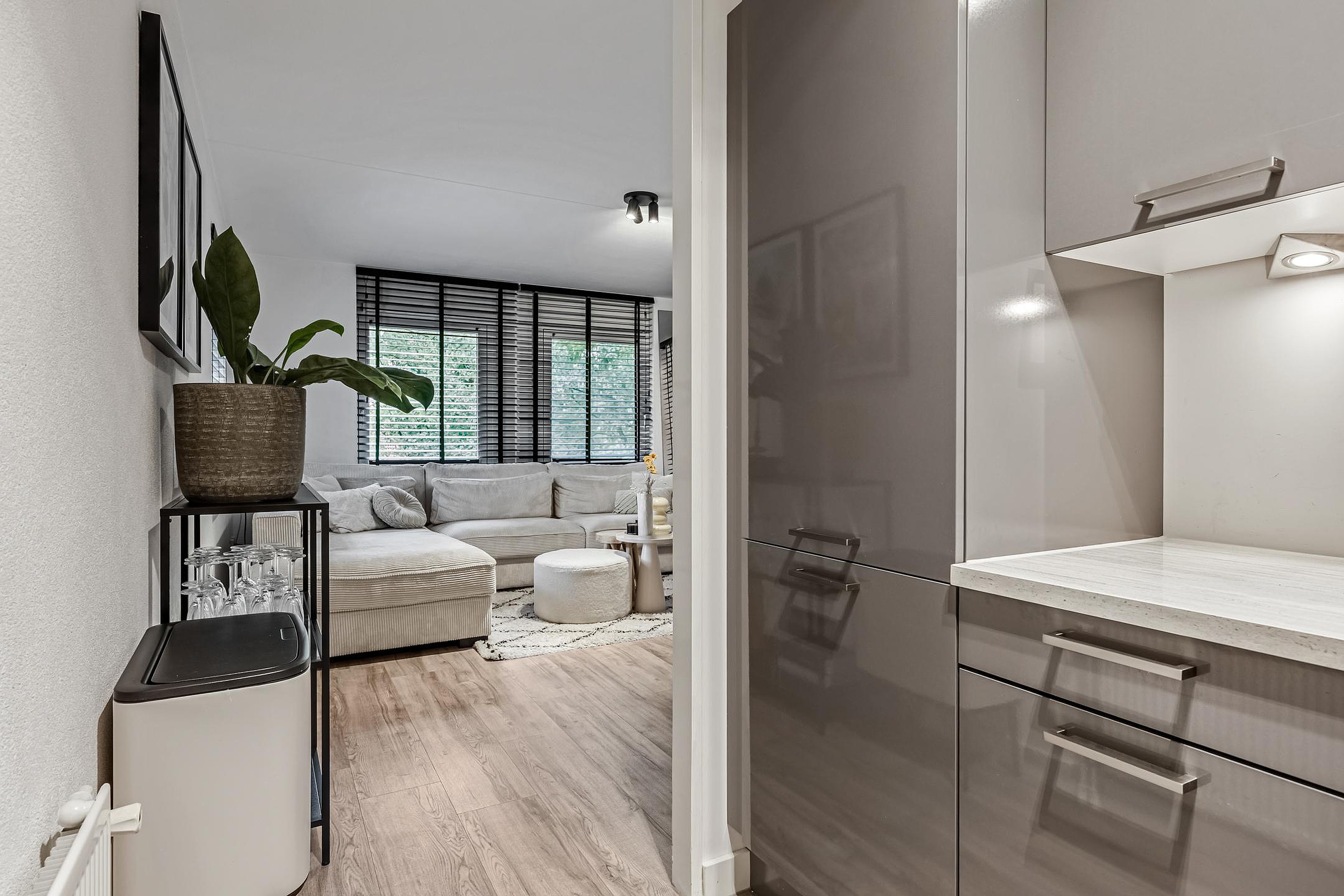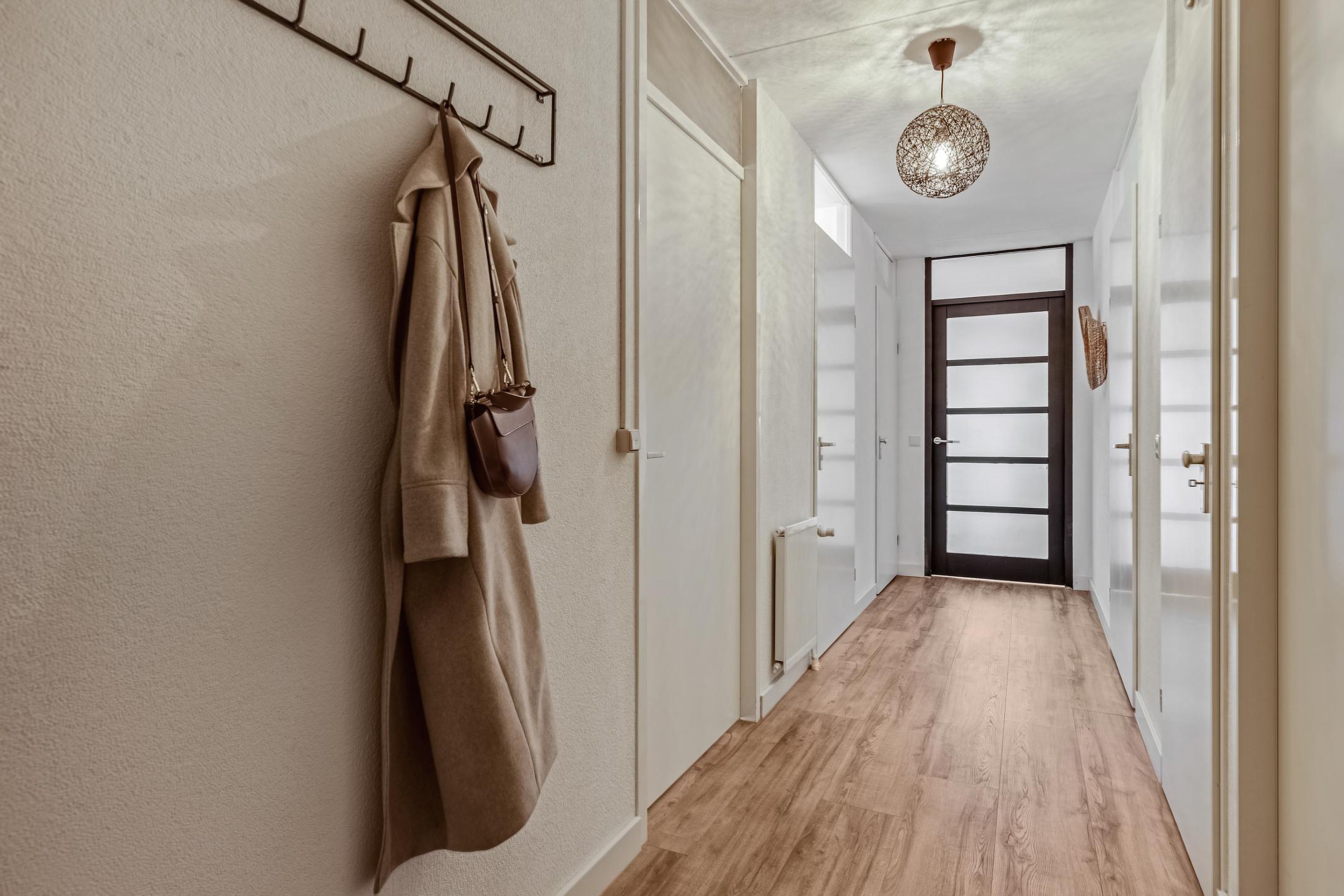 Entree: Entree / hal met meterkast en videofoon installatie. Berging Aparte bergkast en kast met opstelling cv-ketel. Woonkamer Lichte woonkamer welke goed in te delen is met deur naar balkon. Balkon Inpandige balkon met een vrije uitzicht op het pleintje. Keuken Open keuken in lichte kleurstelling en hoekopstelling is voorzien van bovenkasten, vaatwasser en kookplaat. Slaapkamers Twee slaapkamers welke goed zijn ingedeeld. Badkamer De licht betegelde badkamer is uitgerust met een douche, toilet, vaste wastafel en wasmachine-aansluiting.