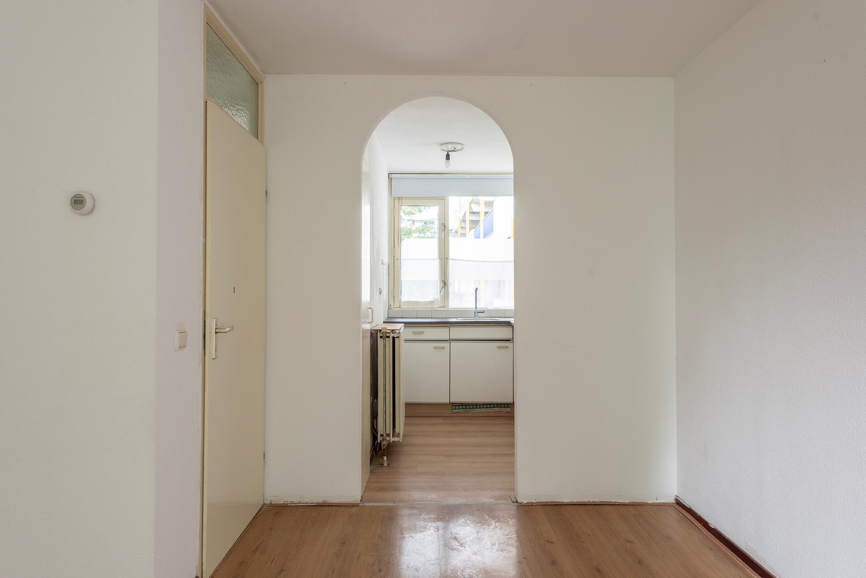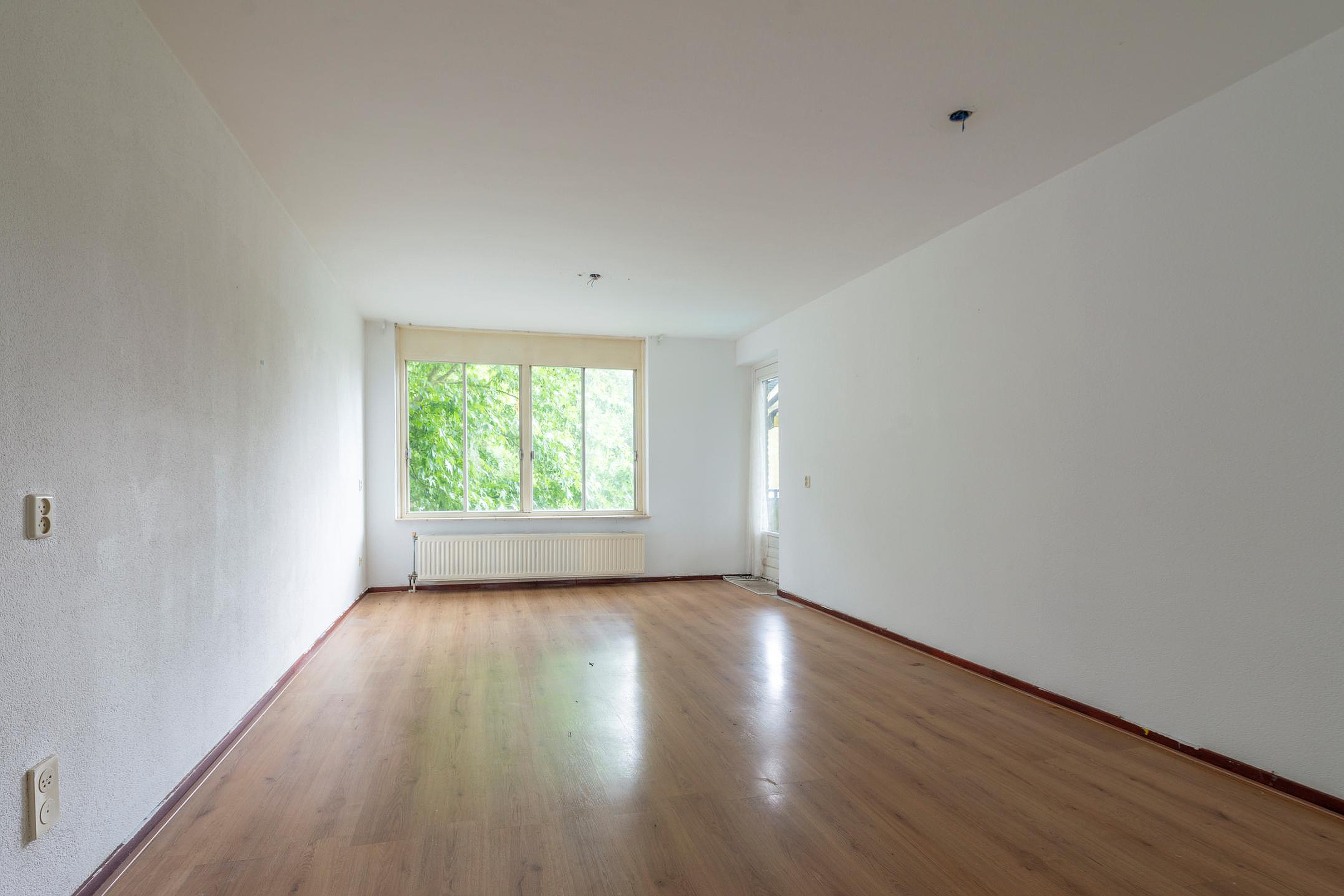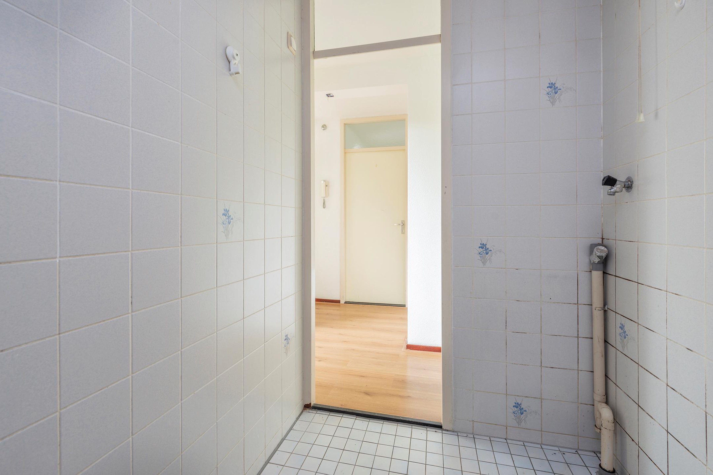 Entree, toilet met fonteintje, lichte woonkamer (6,87 x 3,59) met deur naar balkon,