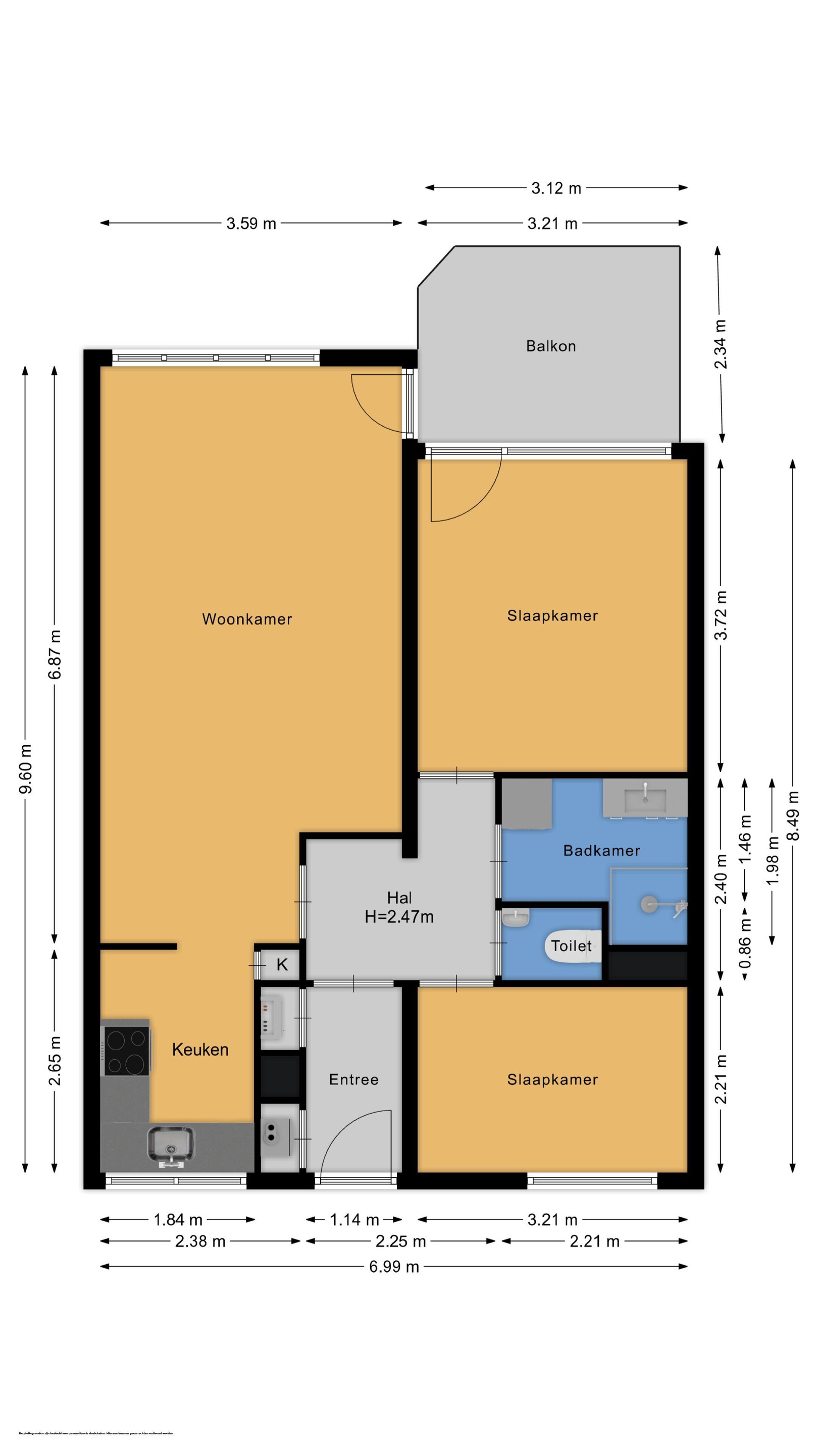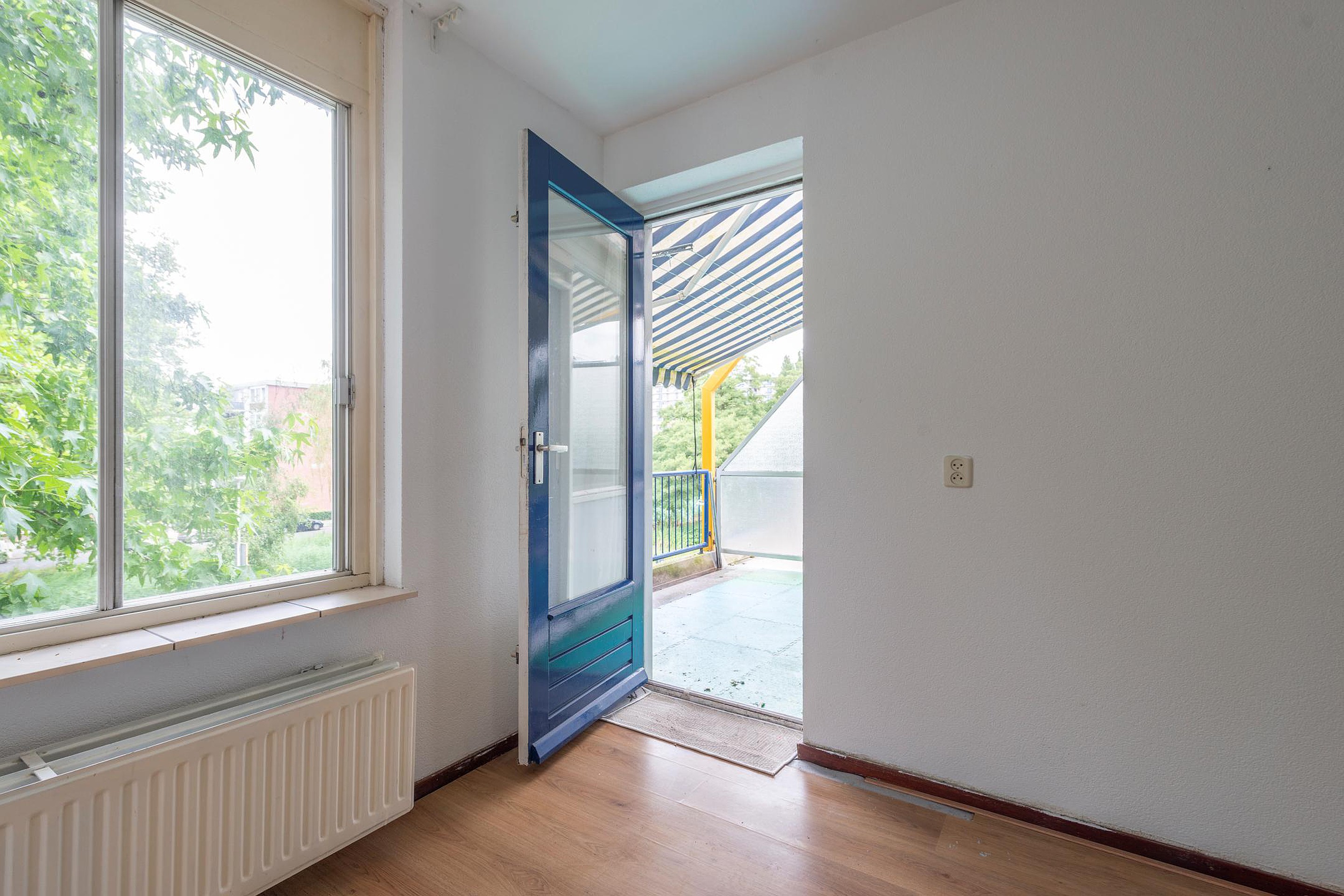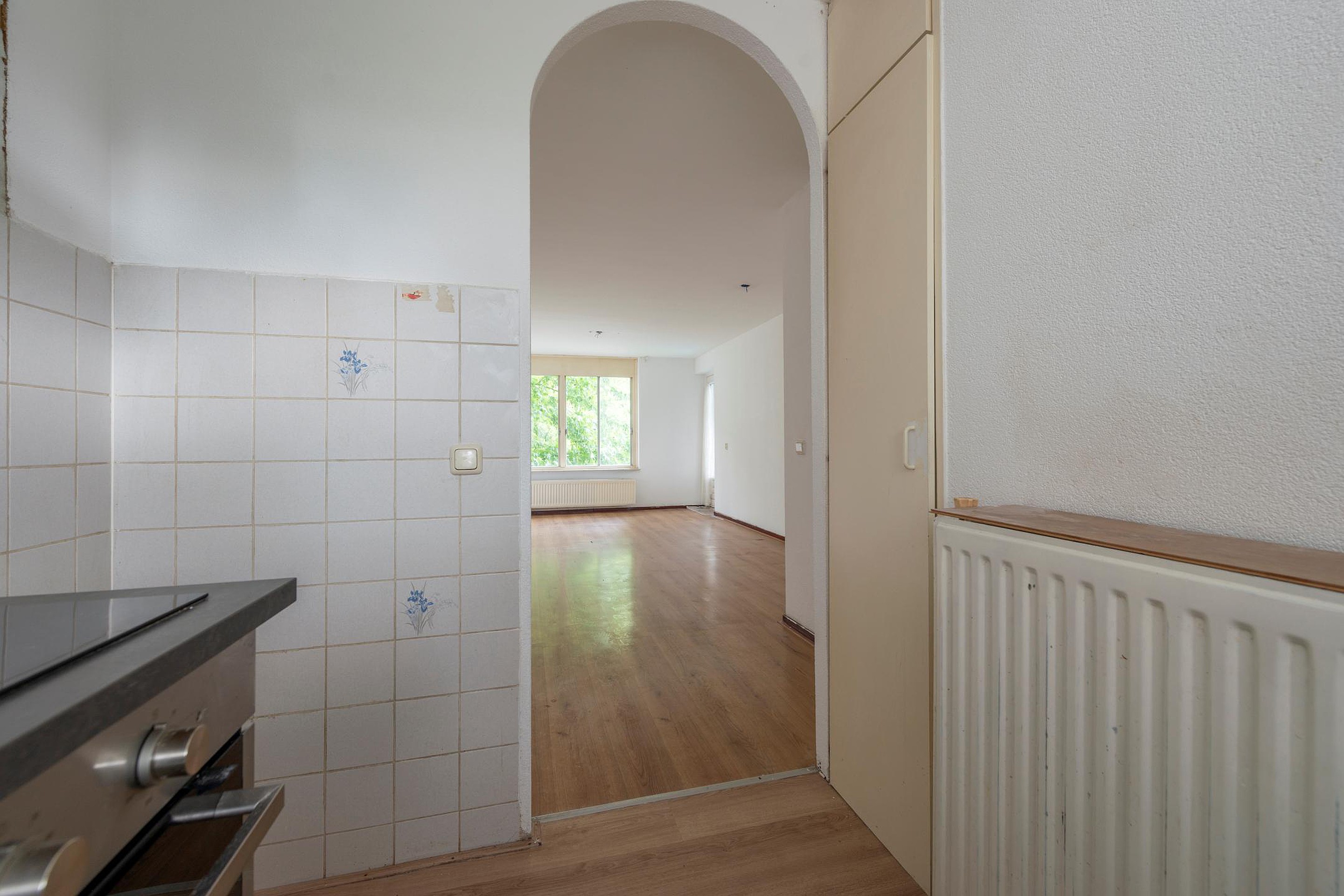 eenvoudige keuken (2,38 x 2,65), slaapkamer 1 (3,72 x 3,21) met deur naar balkon (2,35 x 3,21),