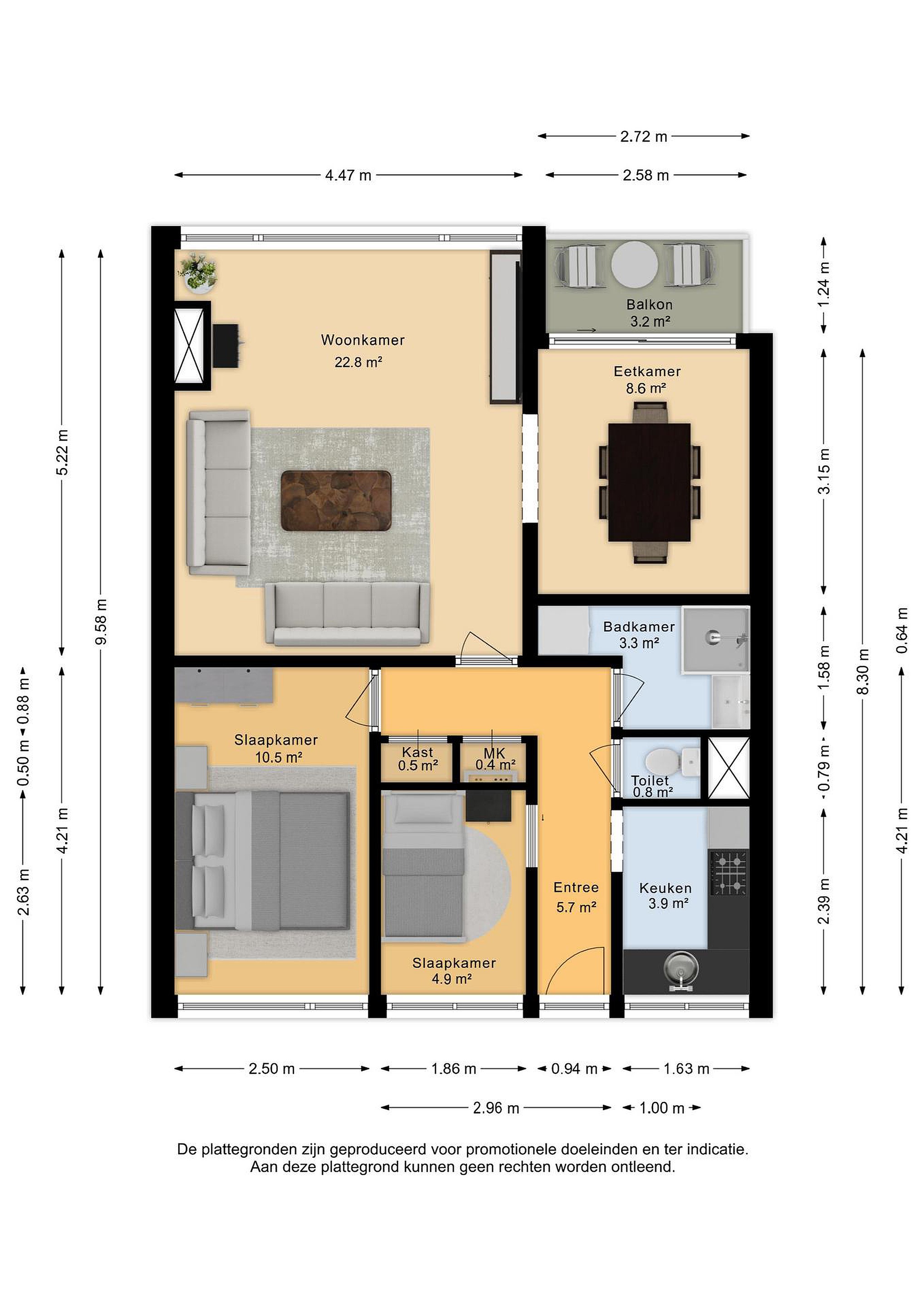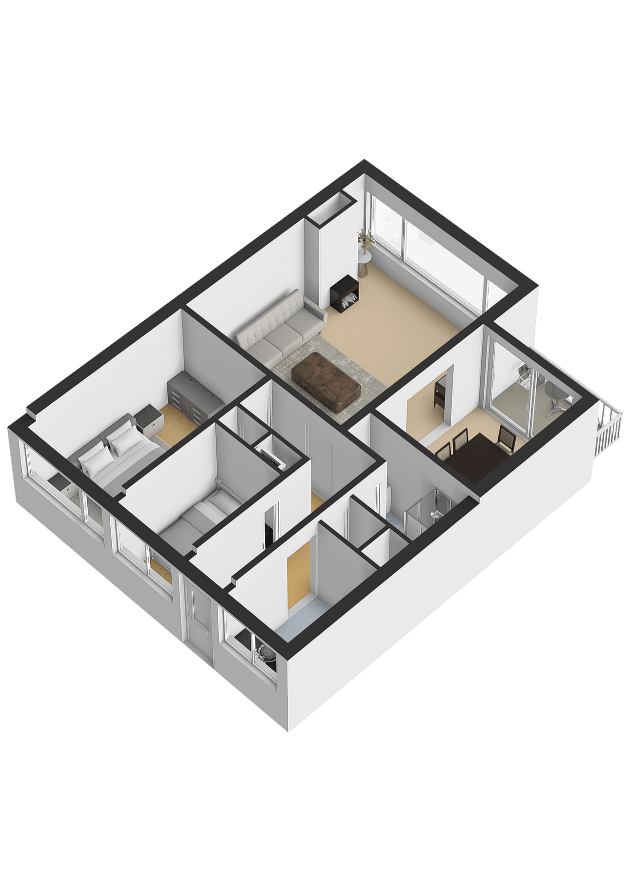 Hal met toegang tot de verschillende vertrekken. Aan de galerijzijde bevinden zich de twee slaapkamers en de nette keuken. Verder een keurig toilet en badkamer met douche, wastafel en witgoedaansluiting. De lichte en royale woonkamer bevindt zich aan de achterzijde en heeft mooi zicht richting de duinen en toegang tot het op het westen gelegen balkon middels een schuifpui. Hier kan je heerlijk genieten van prachtige zonsondergangen.