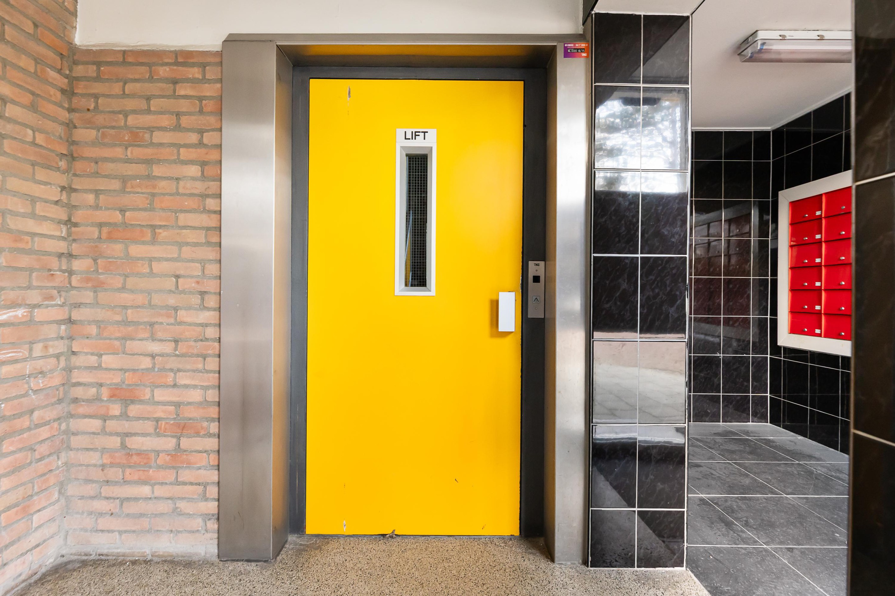 Afgesloten entree met de postbussen, het trappenhuis en de lift.