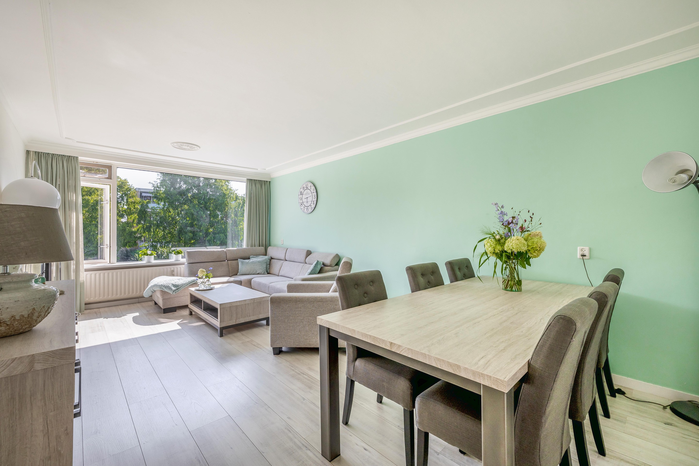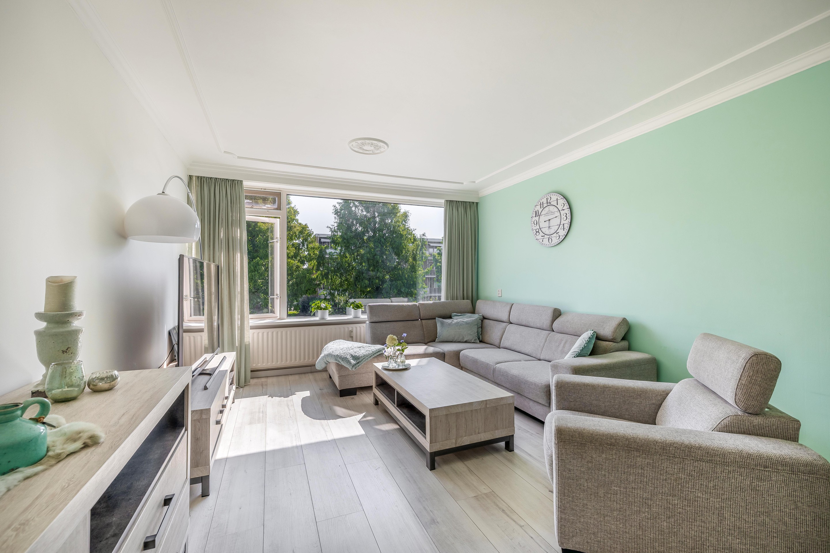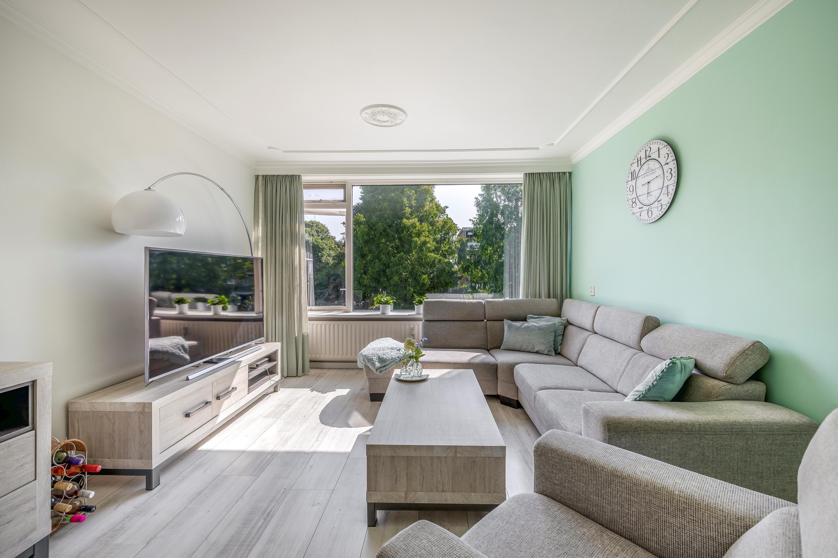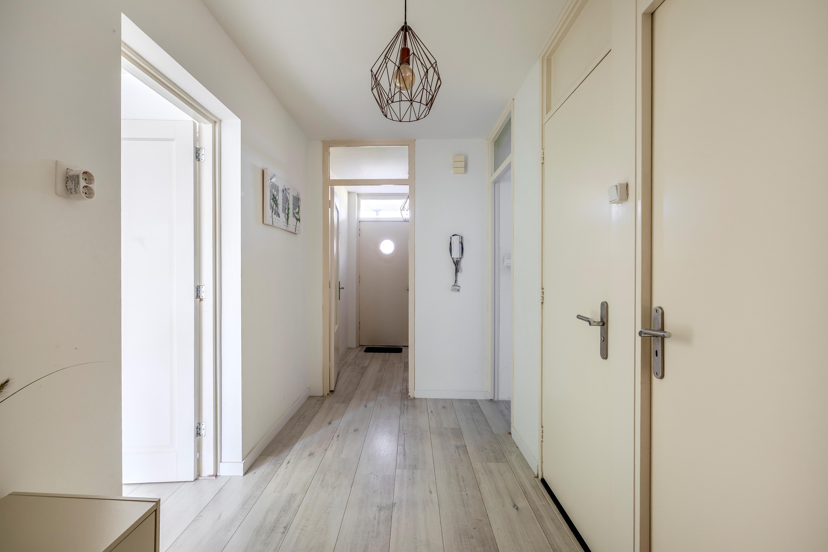 Vanuit de hal in het appartement zijn alle vertrekken bereikbaar. De ruime woonkamer aan de voorzijde heeft grote raampartijen die zorgen voor veel lichtinval en een prettig uitzicht over de straat. De lichte laminaatvloer loopt door in de gehele woning en geeft het appartement een moderne, rustige uitstraling.