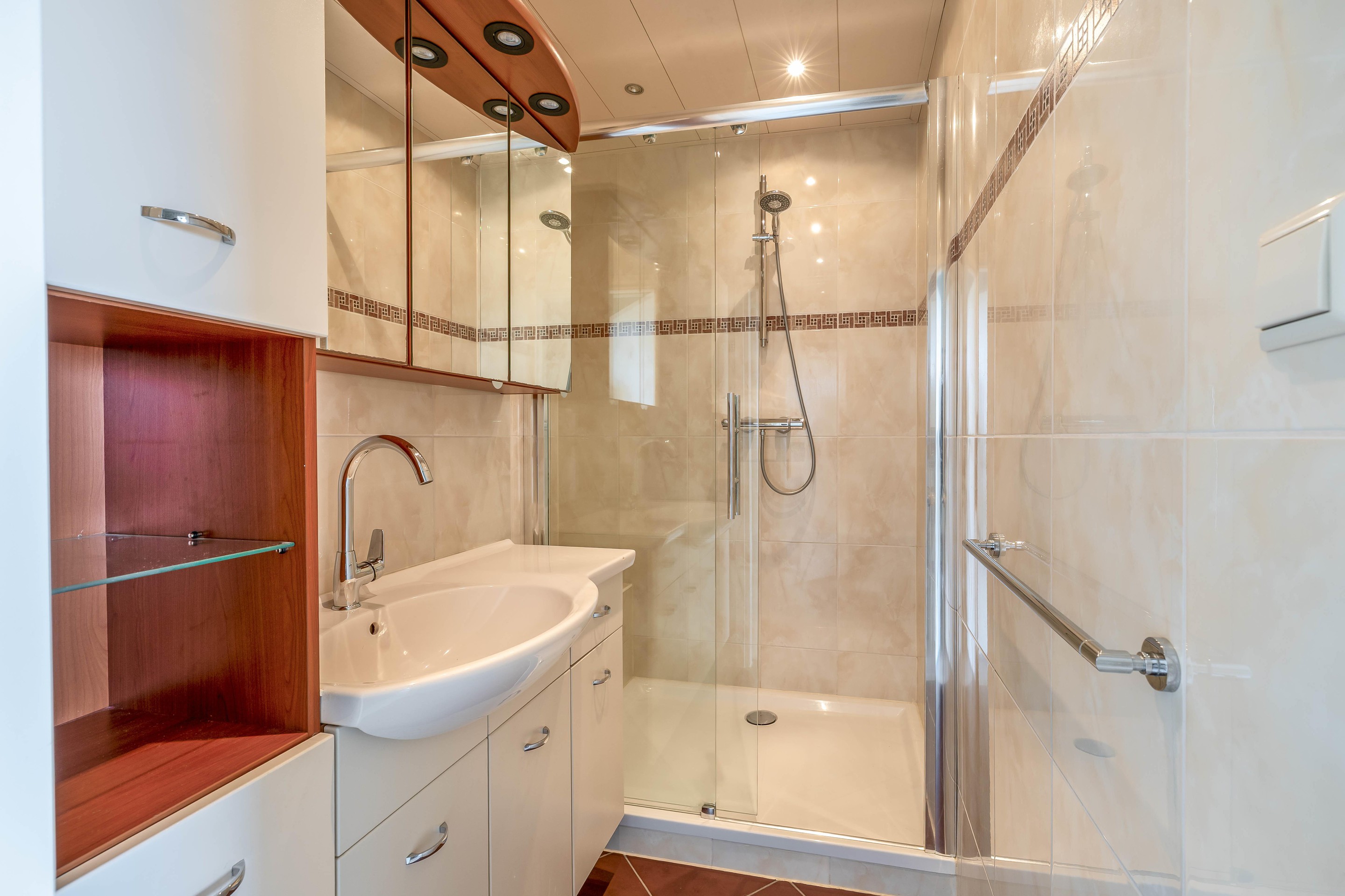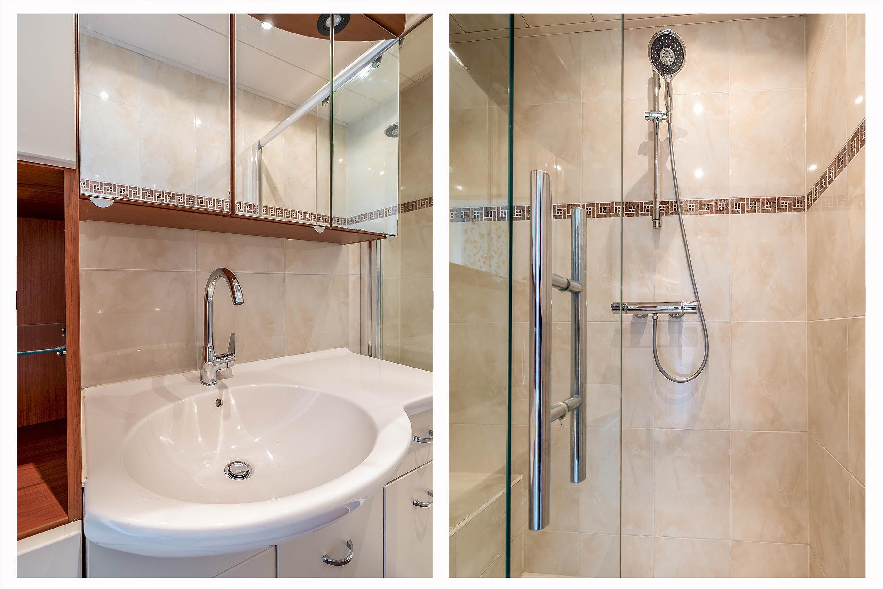 De badkamer heeft een grote douchecabine met glazen schuifdeur, wastafel met meubel en spiegelkast. Ook hier zijn de wanden geheel betegeld en is een verlaagd plafond met inbouwspots aanwezig.