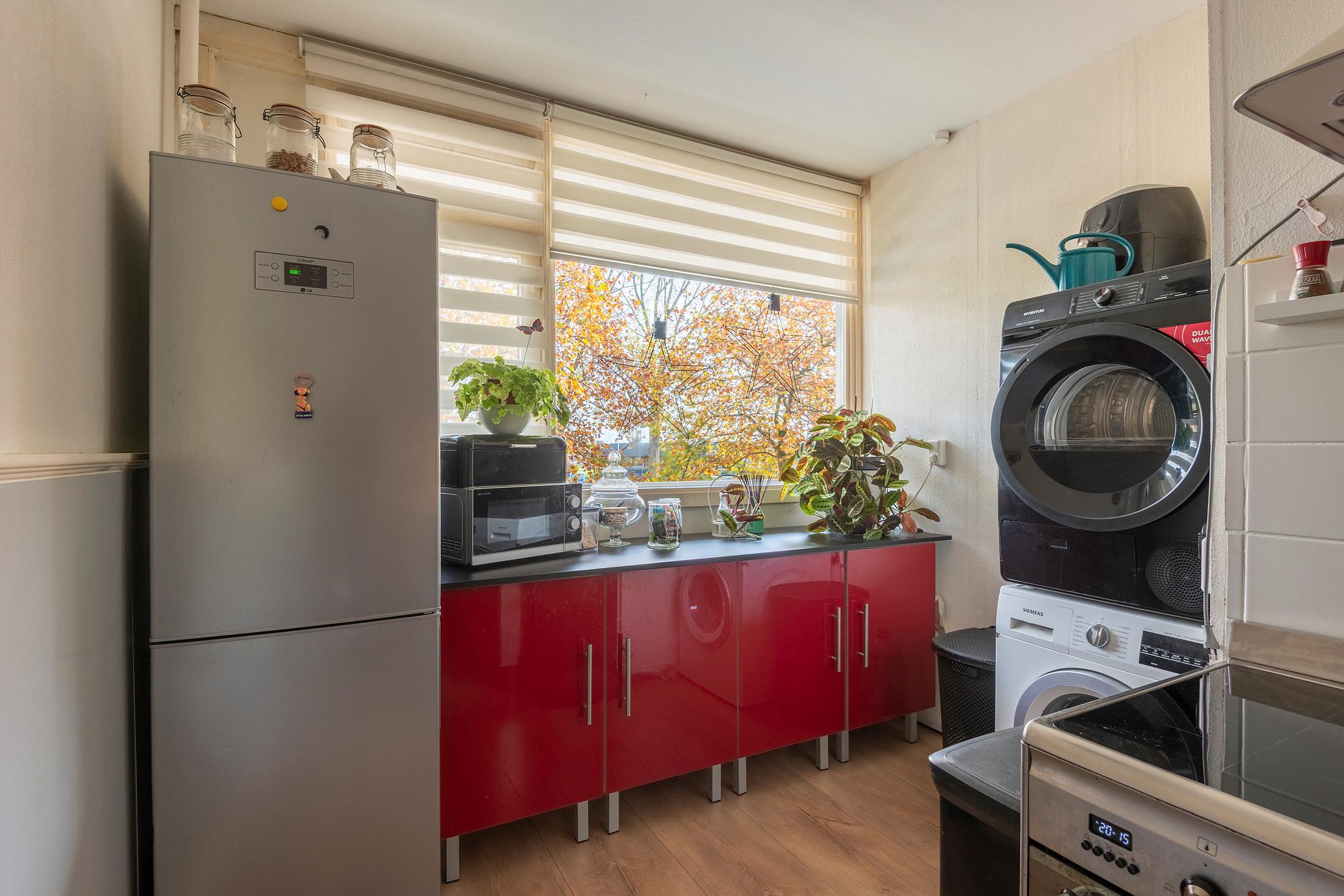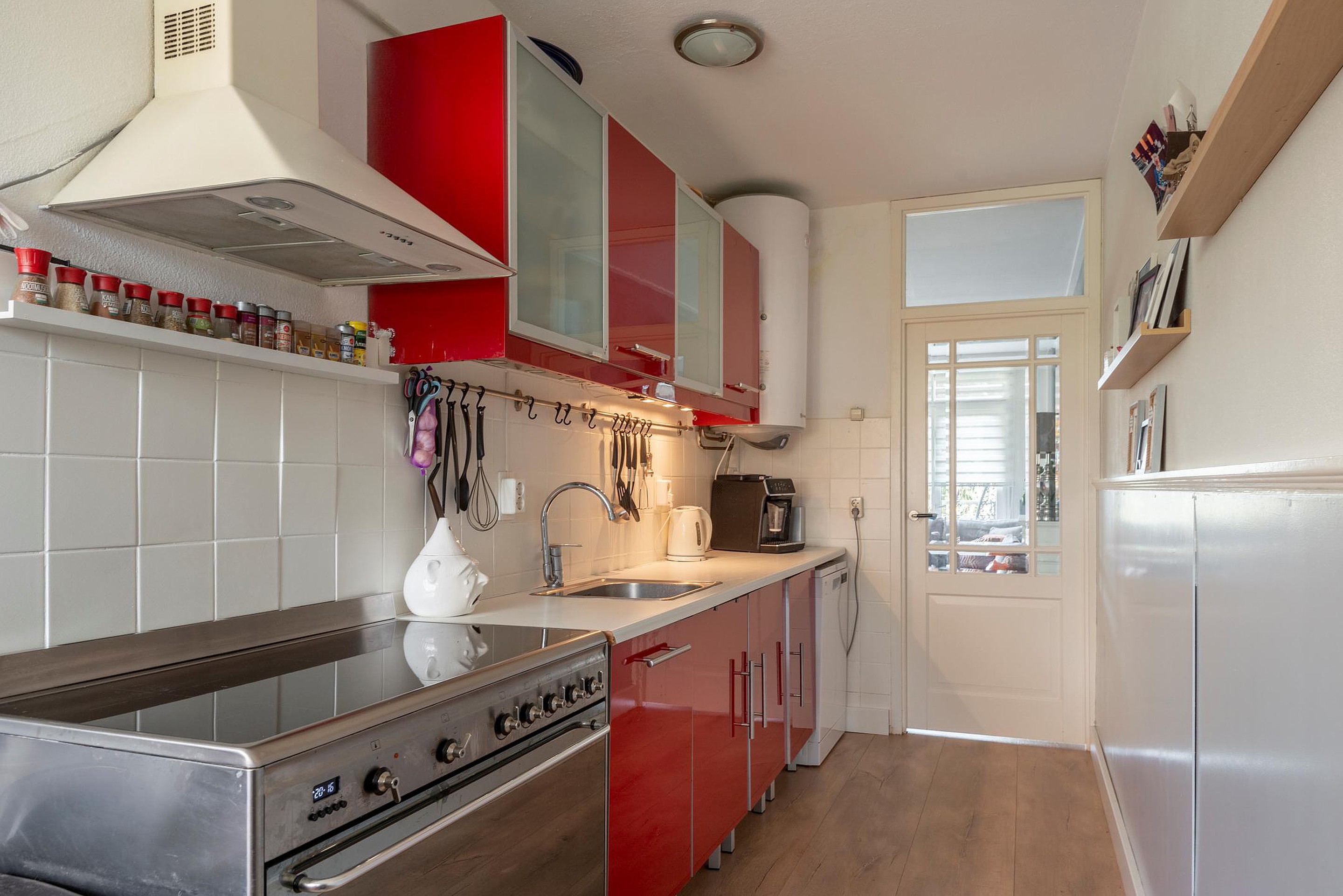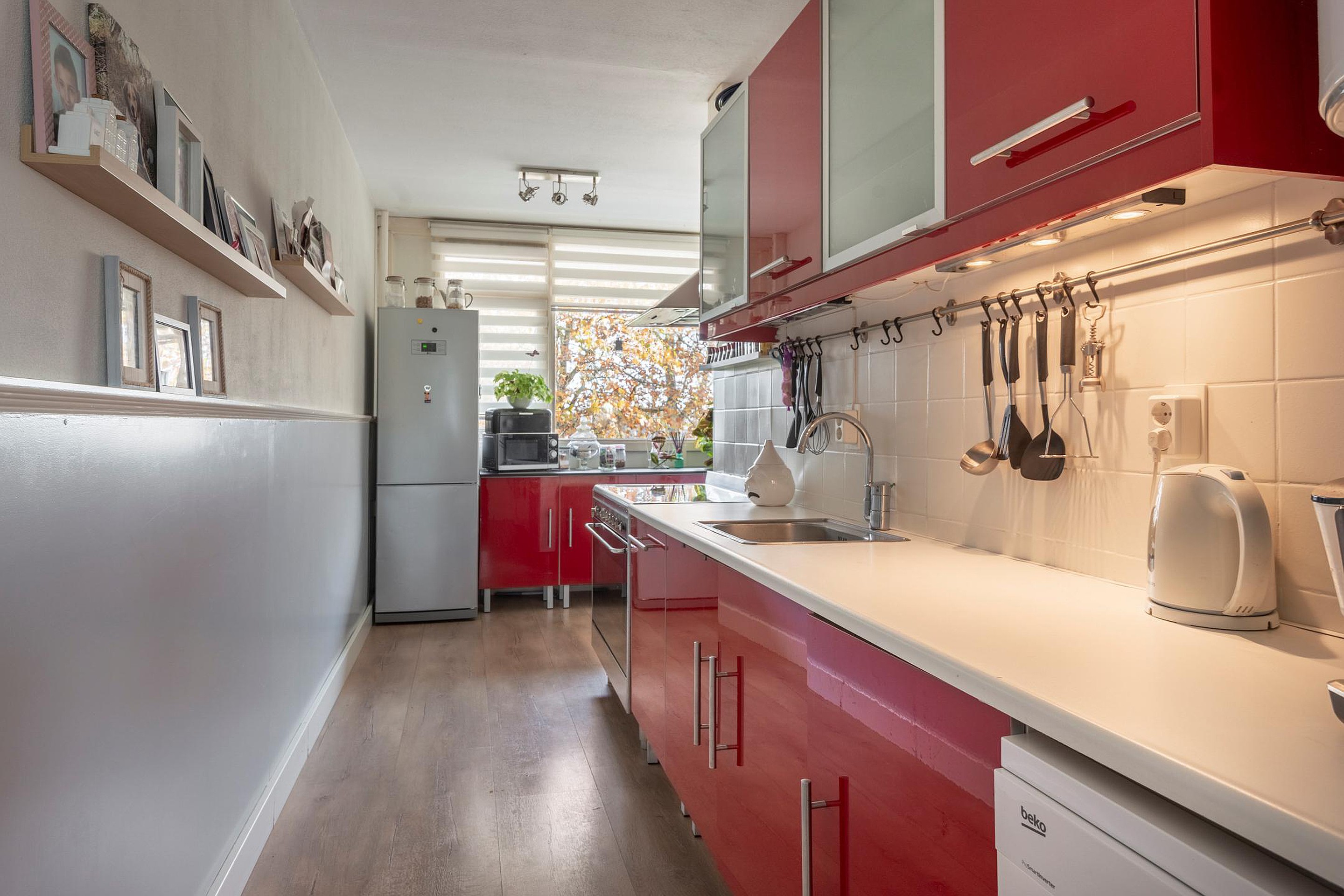 Heerlijk lichte woonkamer met deur naar het woningbrede balkon, gesitueerd op het westen (middag- avondzon). Ruime dichte keuken met een rood hoogglans keukenblok voorzien van veel kastruimte, inductiefornuis met oven (Smeg), afzuigkap, vaatwasmachine, koel/vrieskast, wasmachine-/drogeraansluiting en de boiler. Eventueel kan er in de tussenmuur van de gang en keuken weer relatief eenvoudig de oorspronkelijke deur worden teruggeplaatst.