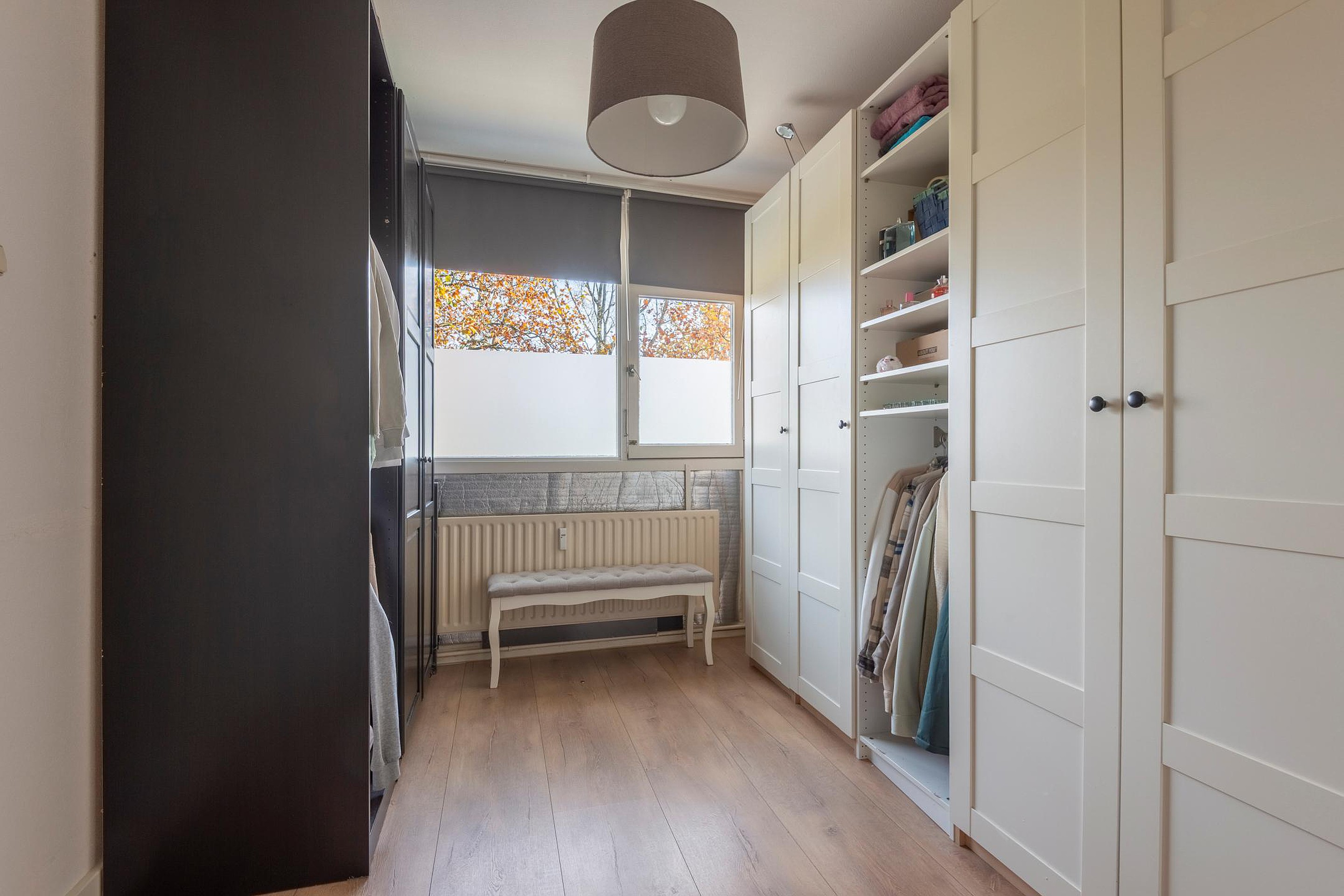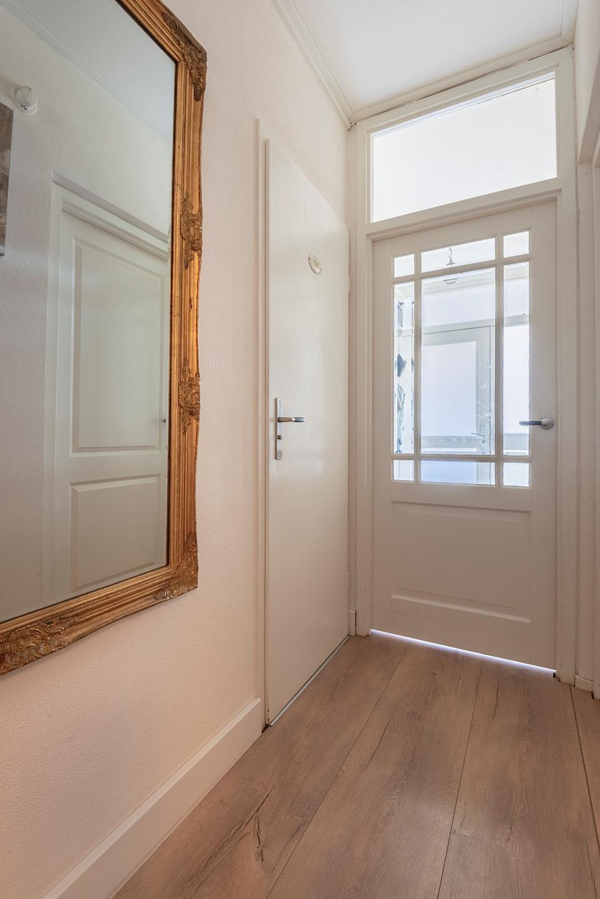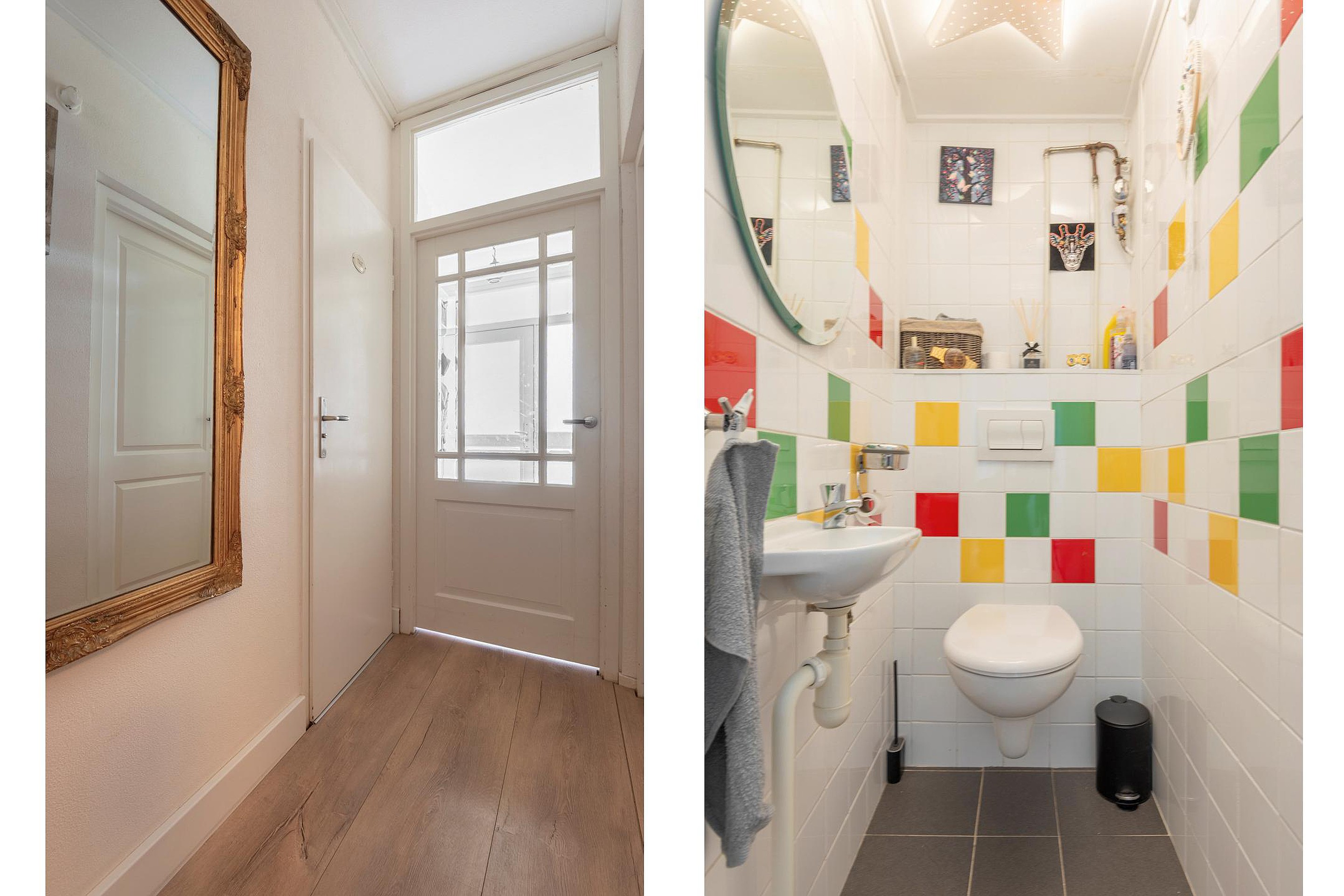 Entree, hal met tochthal, uitgebreide meterkast en garderobe. De gang geeft toegang tot een separate toiletruimte met vrij hangend toilet met fonteintje, een badkamer met inloopdouche en wastafelmeubel met spiegelkast. Ruime slaapkamer van ca. 12 m2 aan de voorzijde (de wasmachine-/drogeraansluiting nog aanwezig).