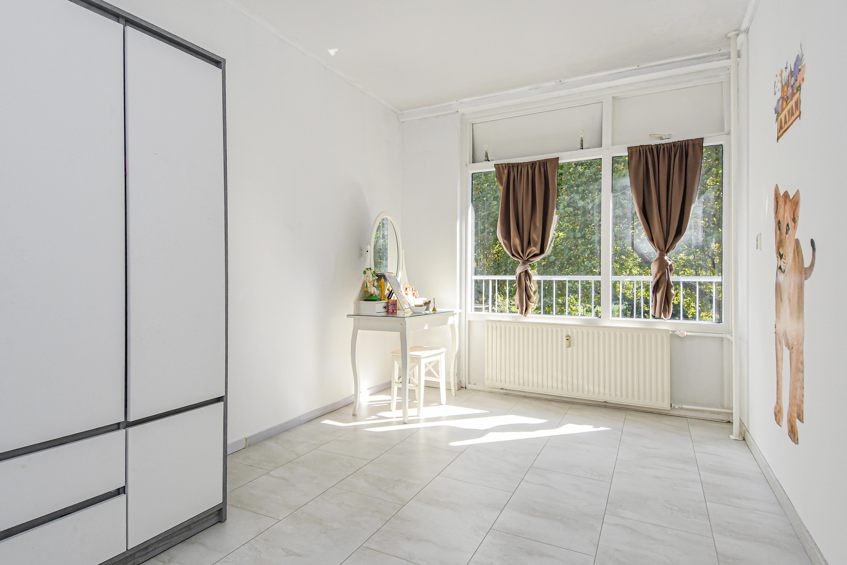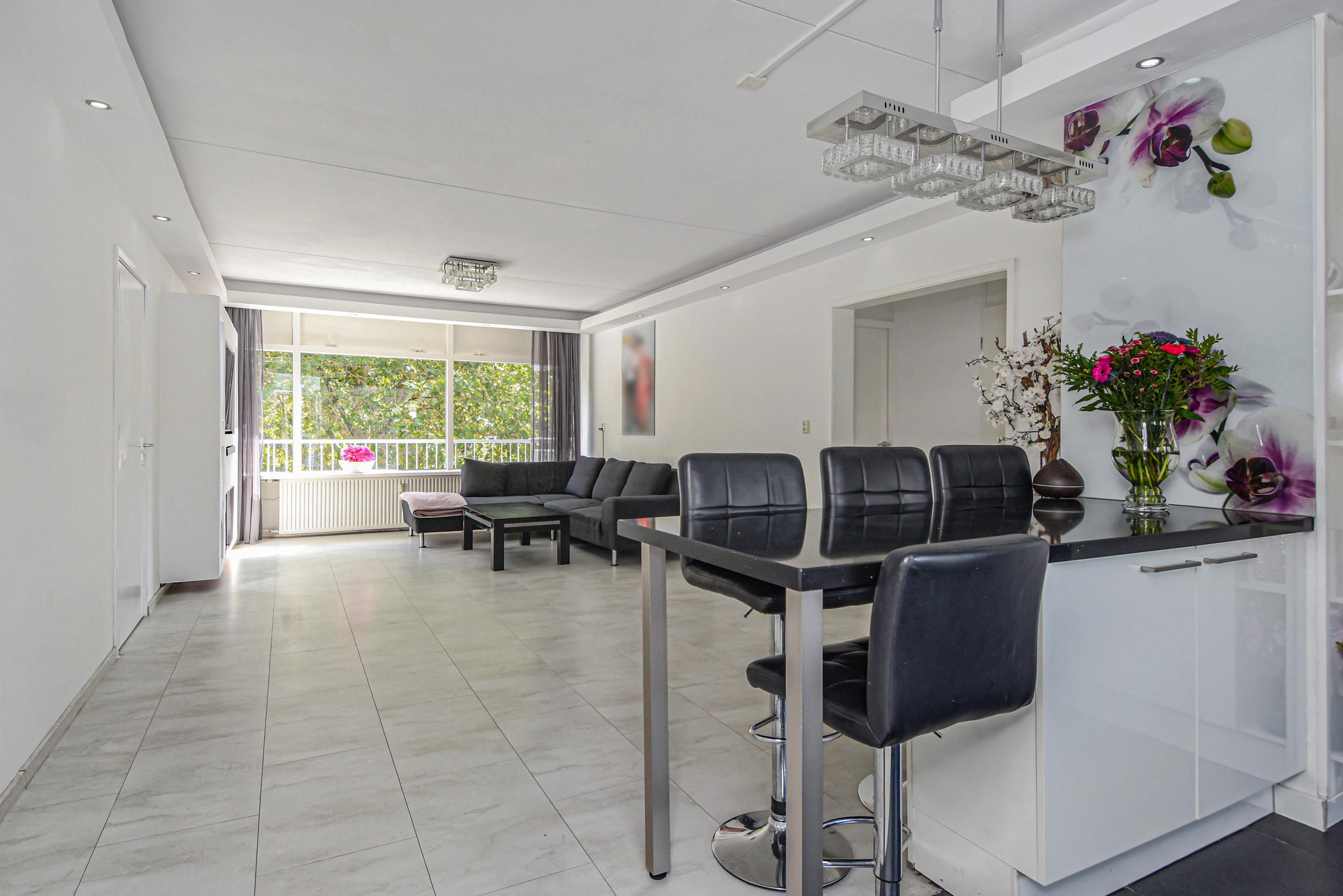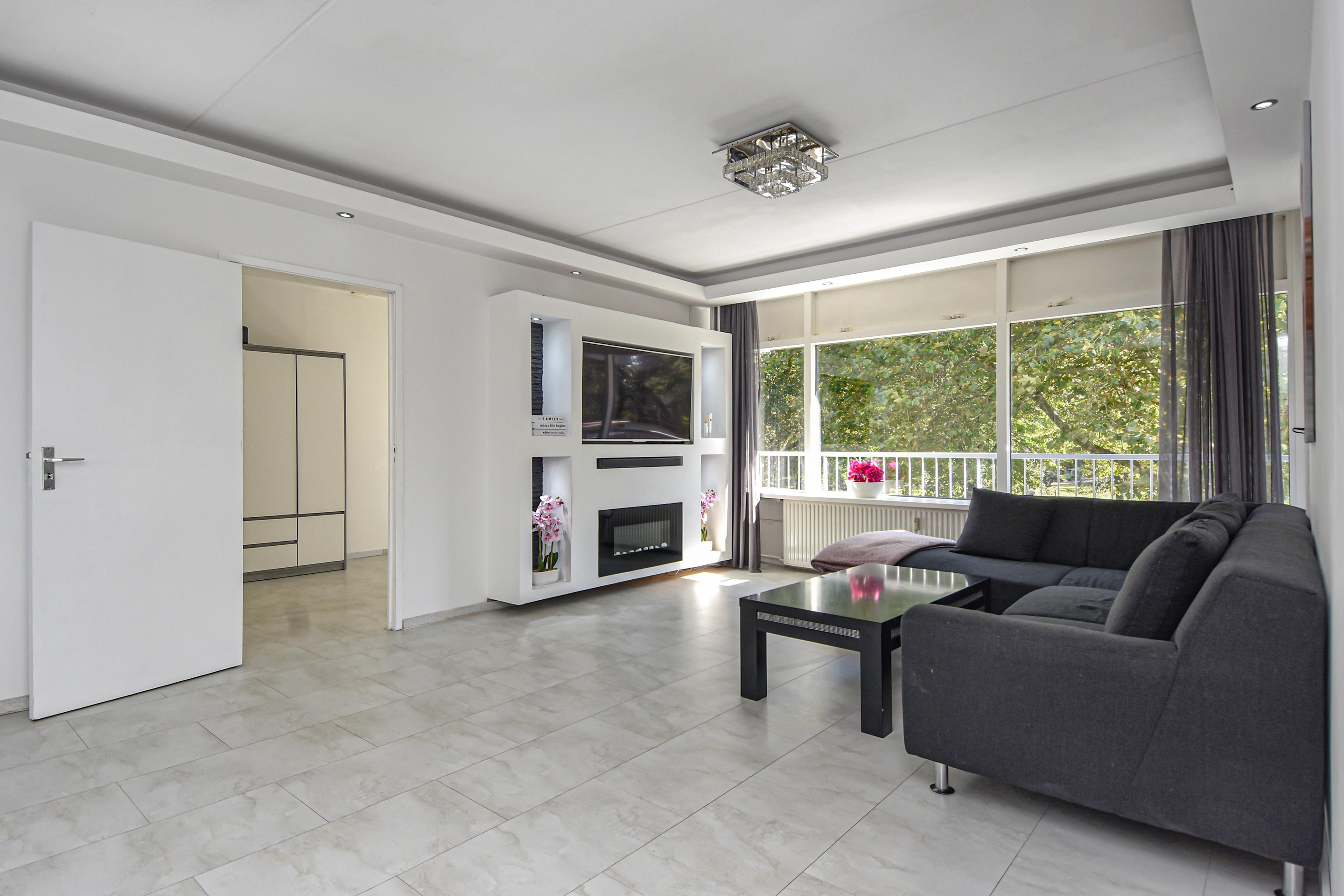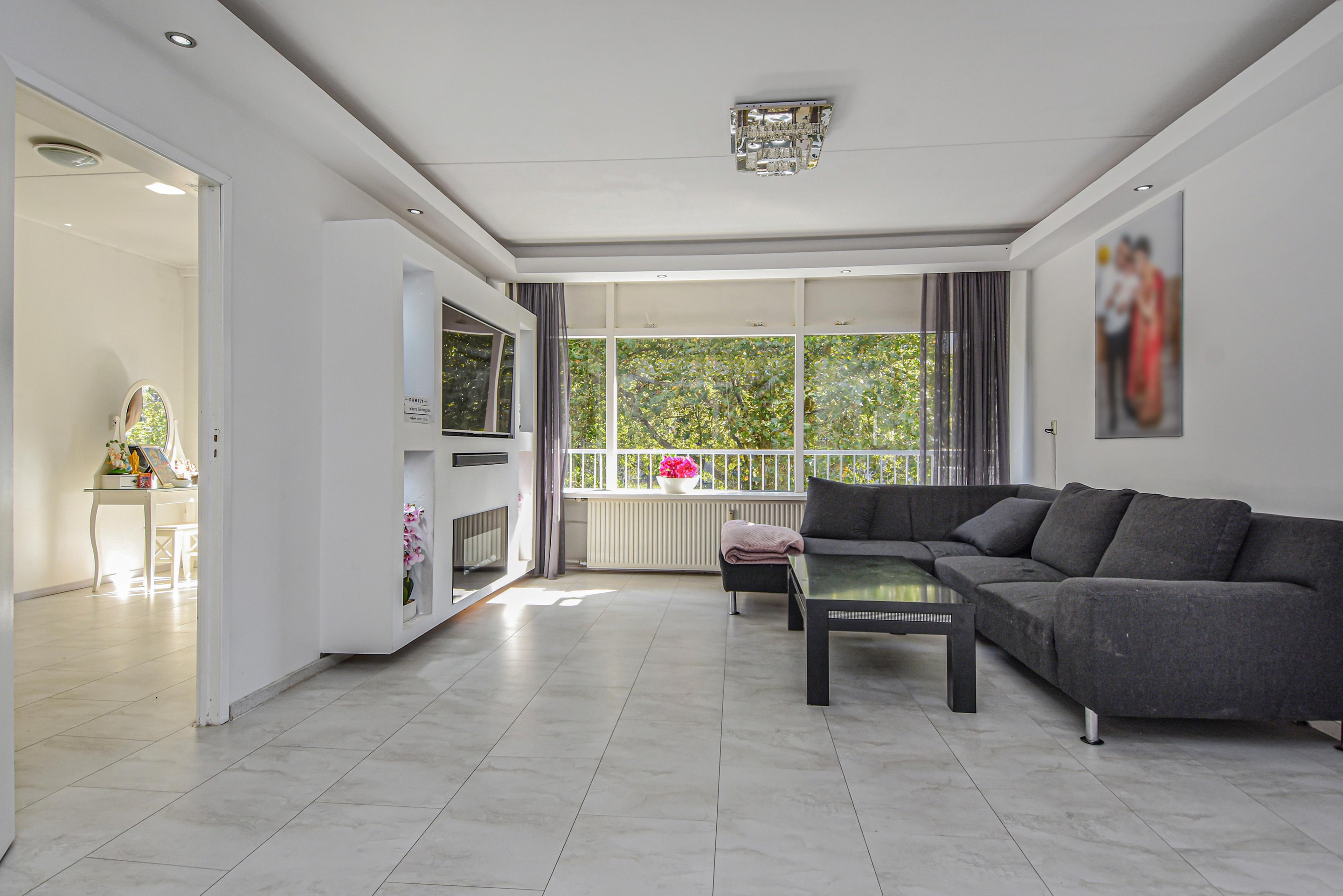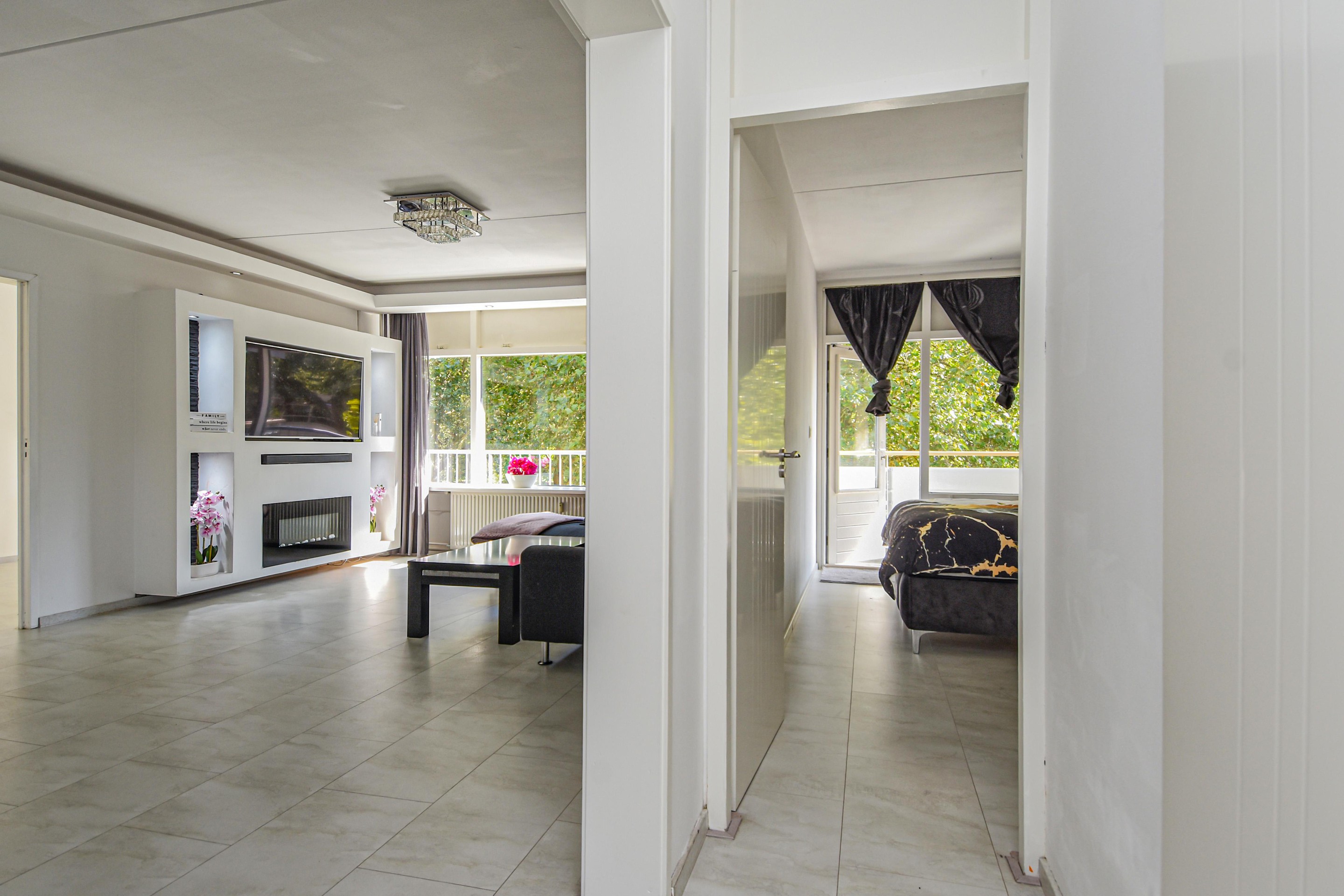 De royale en lichte woonkamer heeft een prachtig vrij uitzicht op het groen en staat in verbinding met een zijkamer. Vanuit de woonkamer is er toegang tot een van de slaapkamers met vaste kast en toegang tot het balkon.