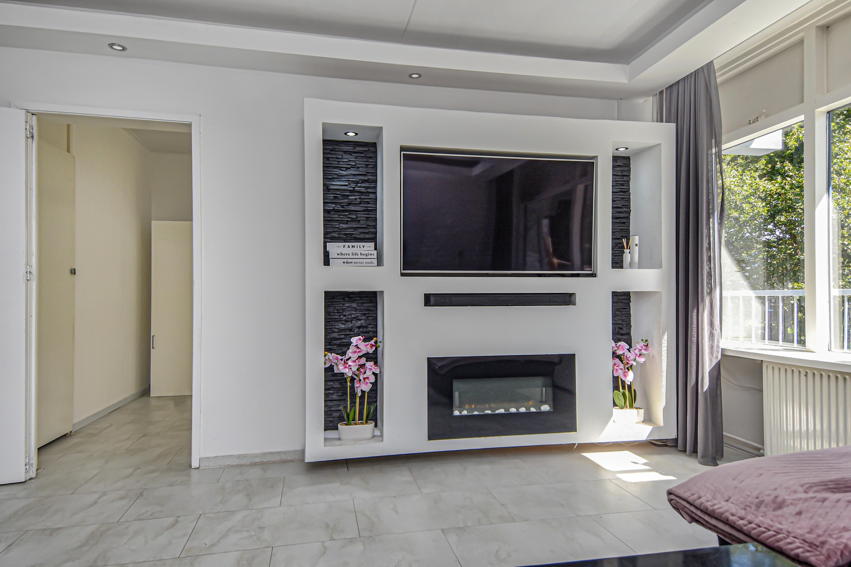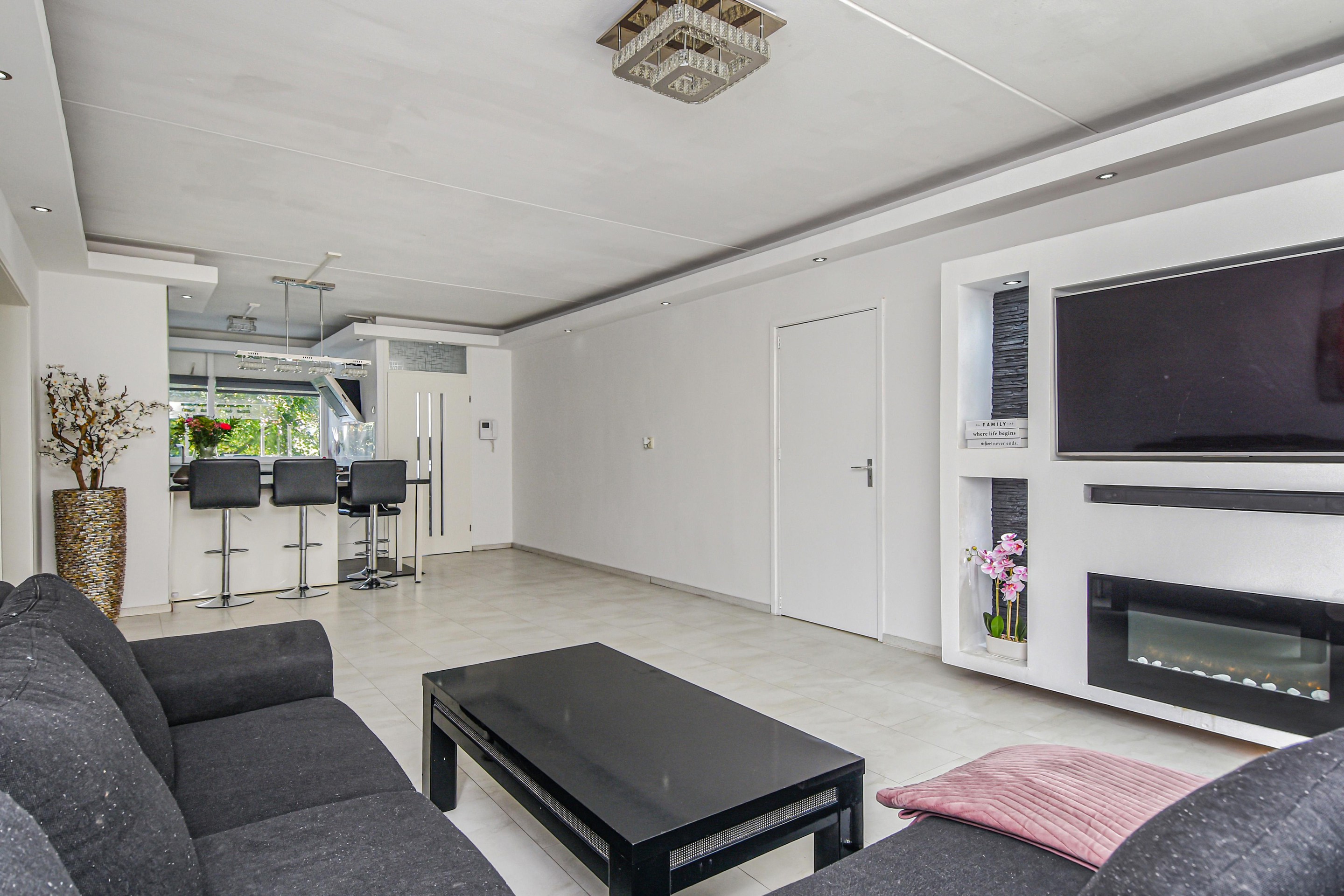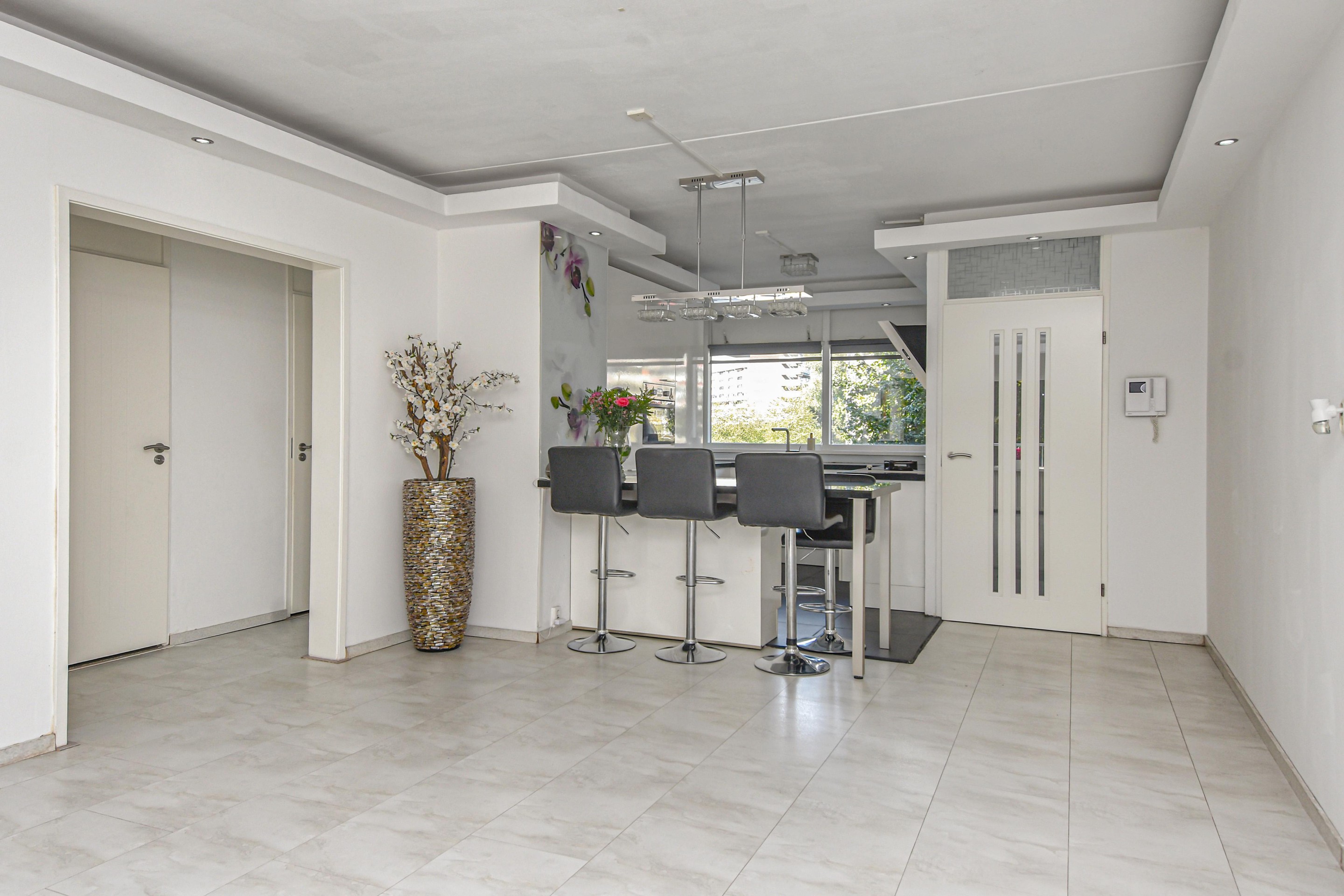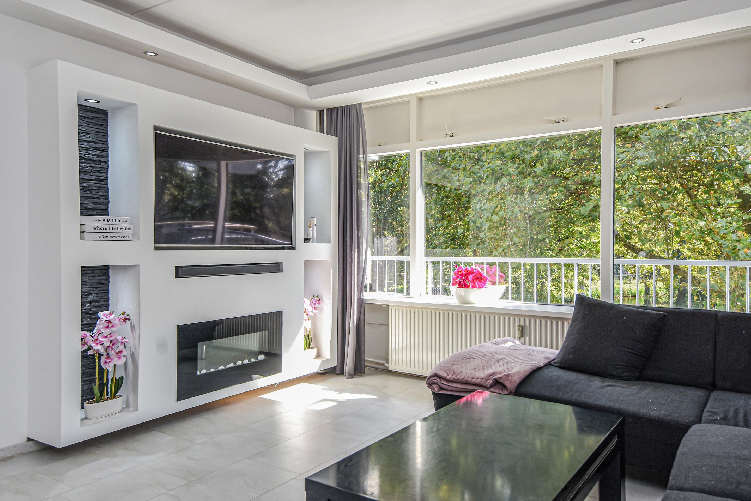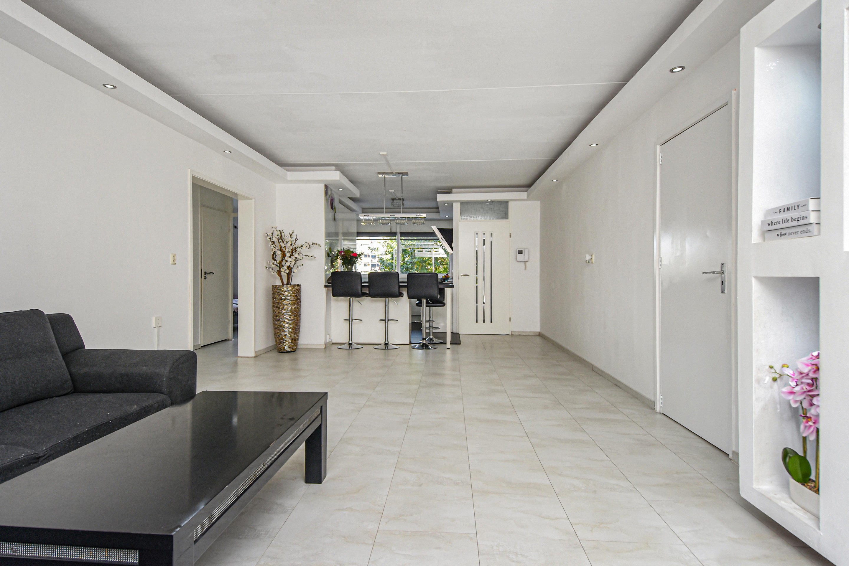 De royale en lichte woonkamer heeft een prachtig vrij uitzicht op het groen en staat in verbinding met een zijkamer. Vanuit de woonkamer is er toegang tot een van de slaapkamers met vaste kast en toegang tot het balkon.