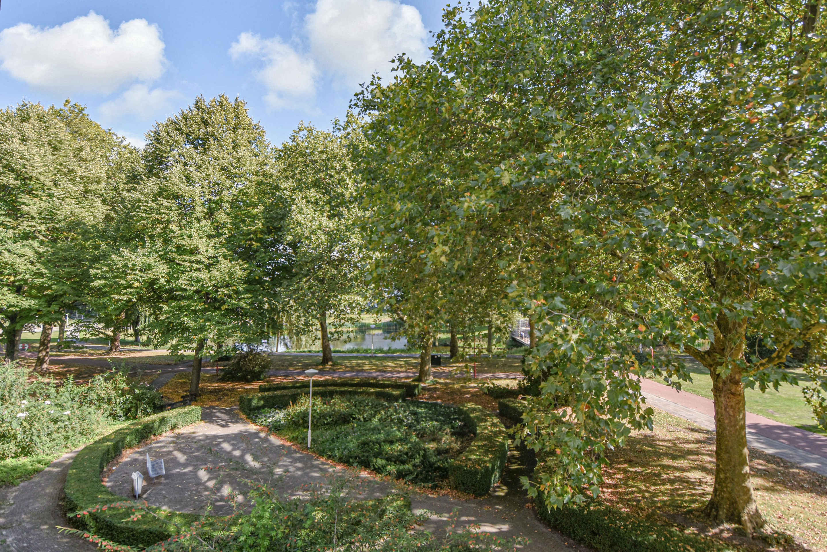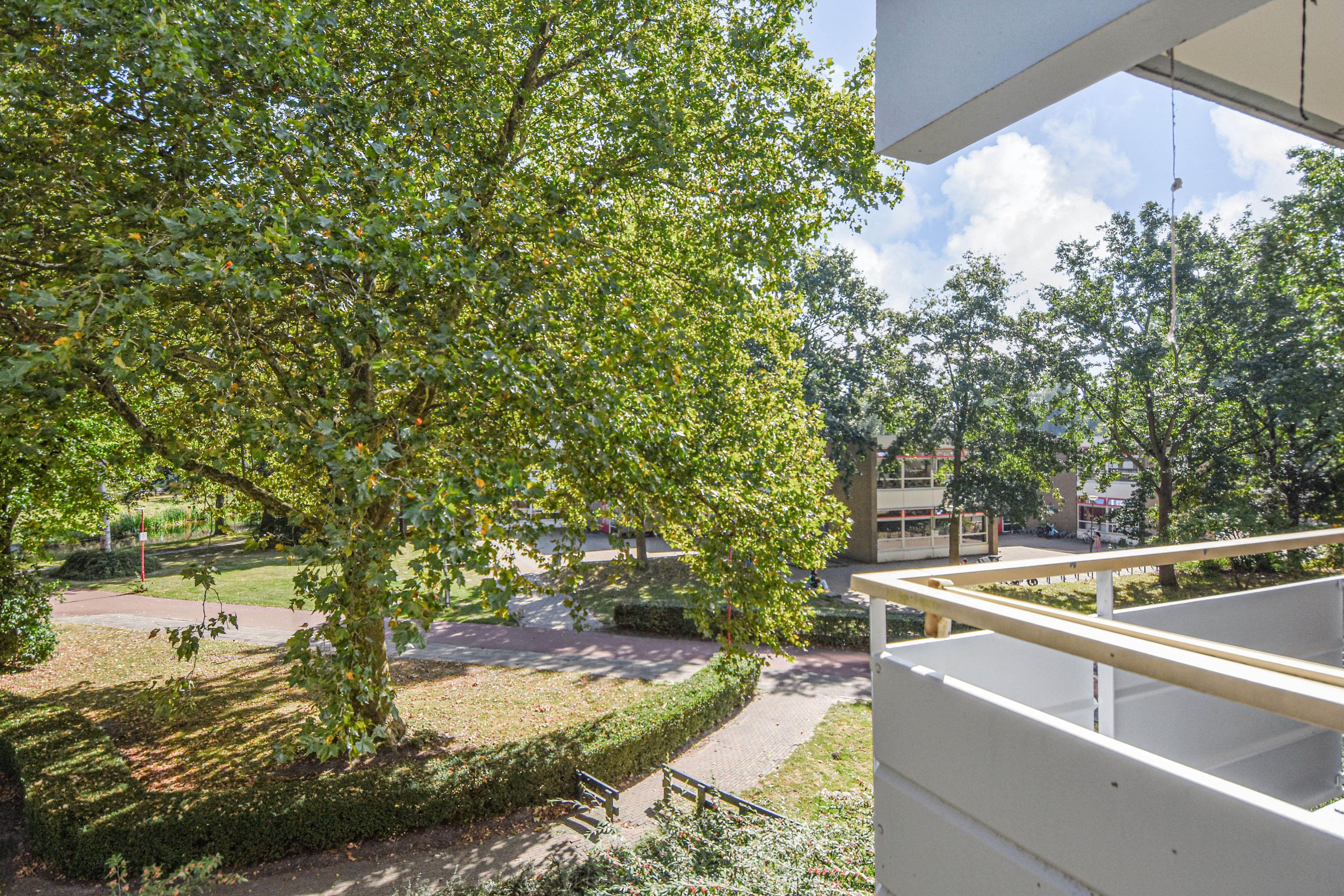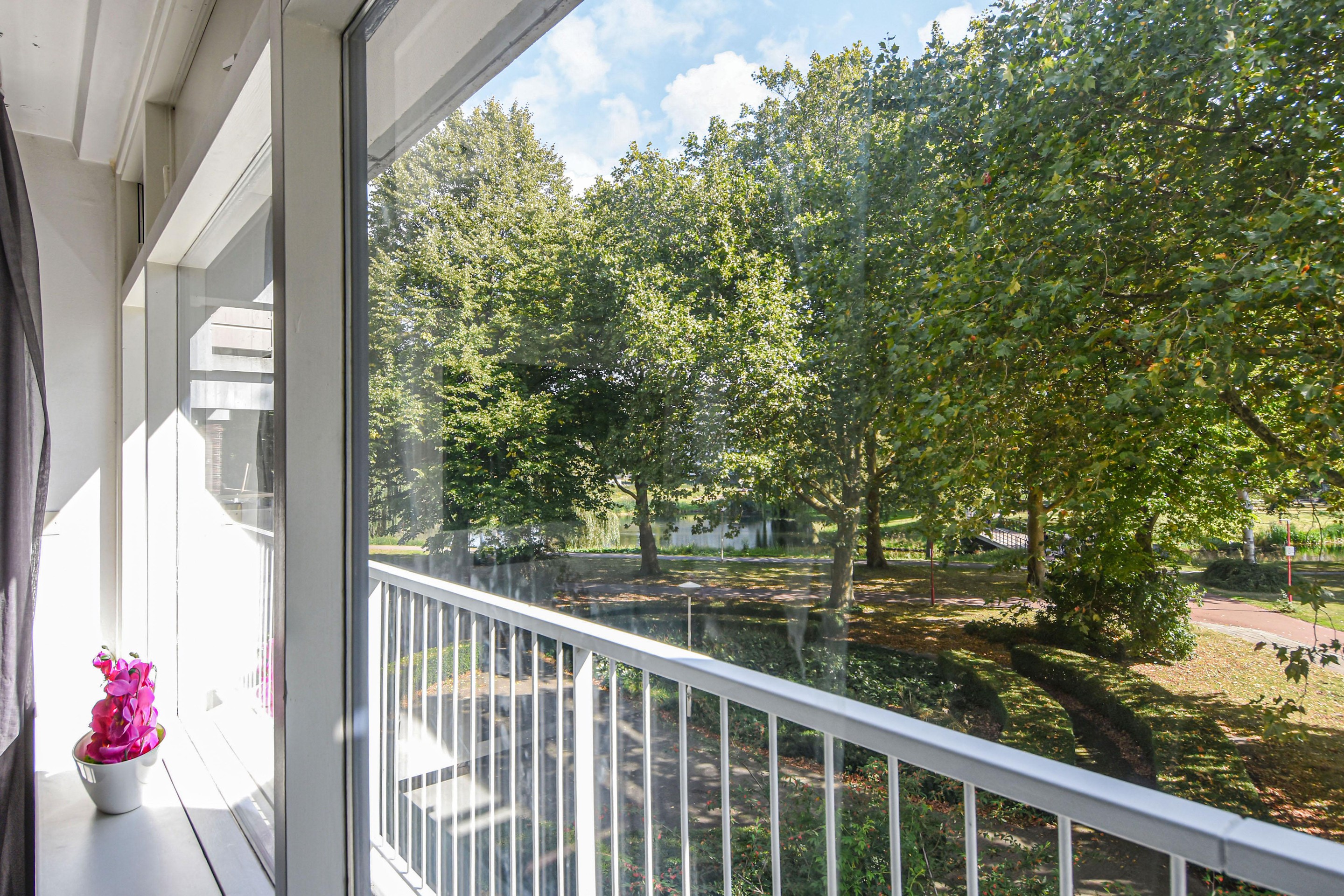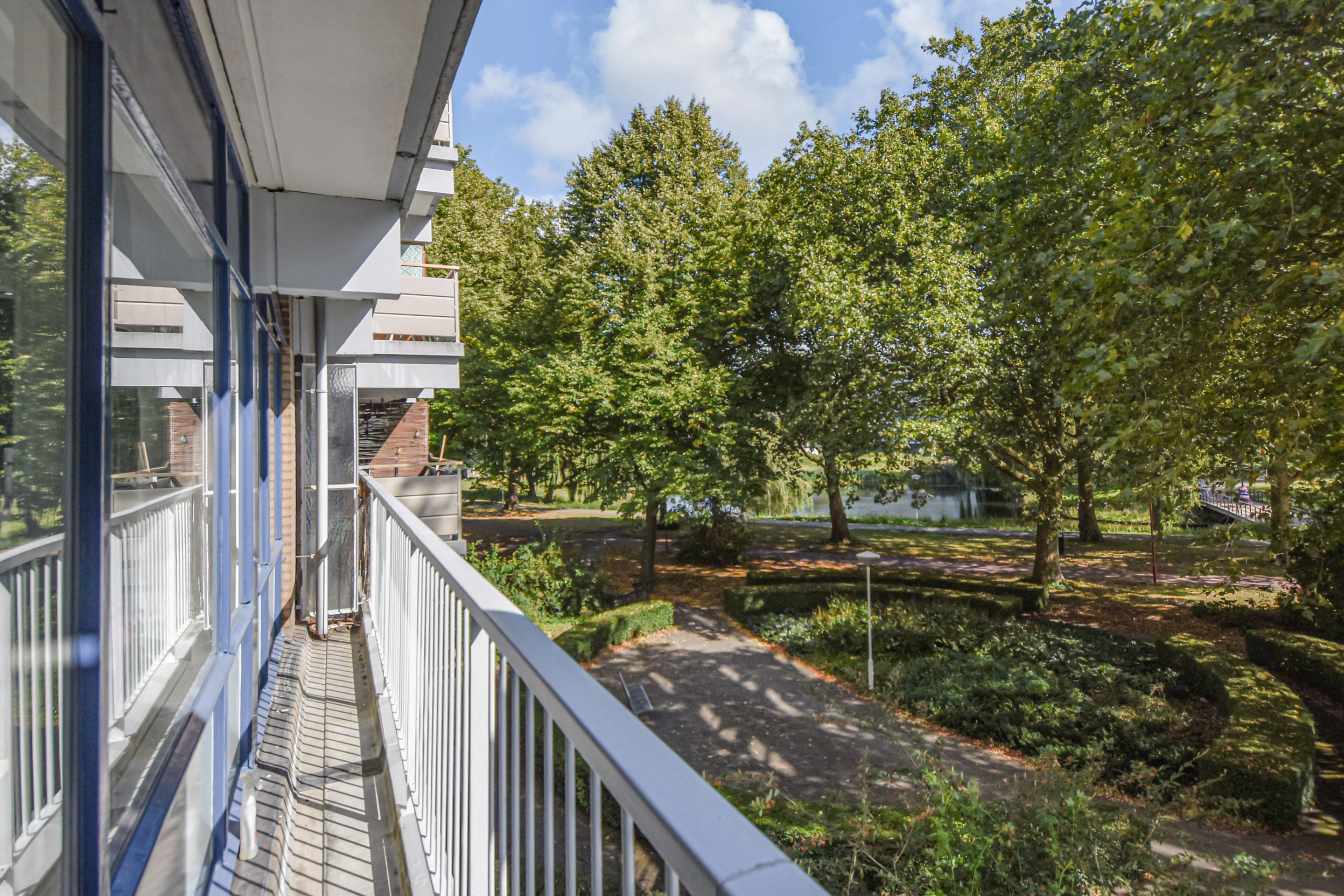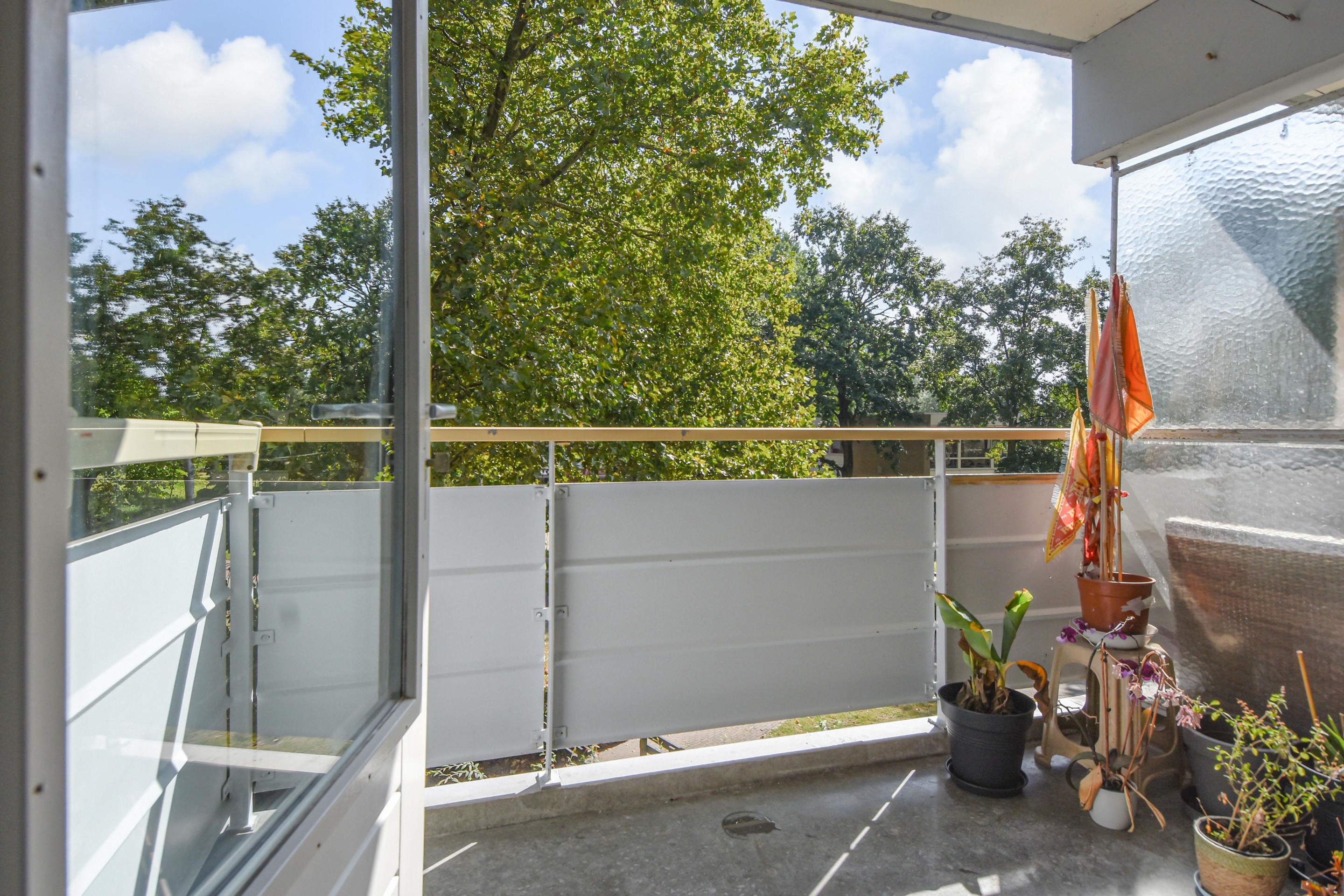 Het balkon op het zuidoosten biedt volop zon en een schitterend uitzicht over het park. In de onderbouw beschikt het appartement over een eigen berging.