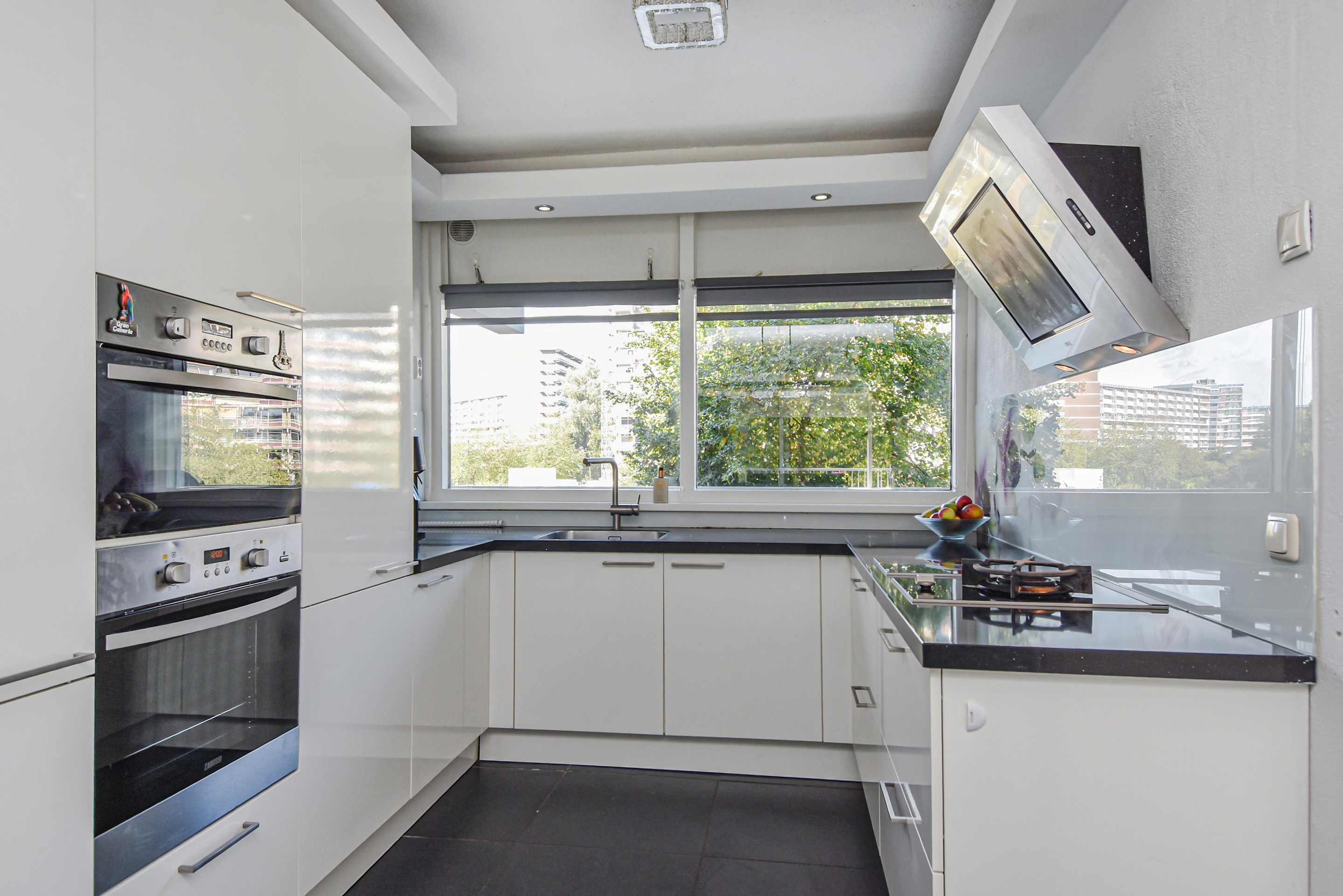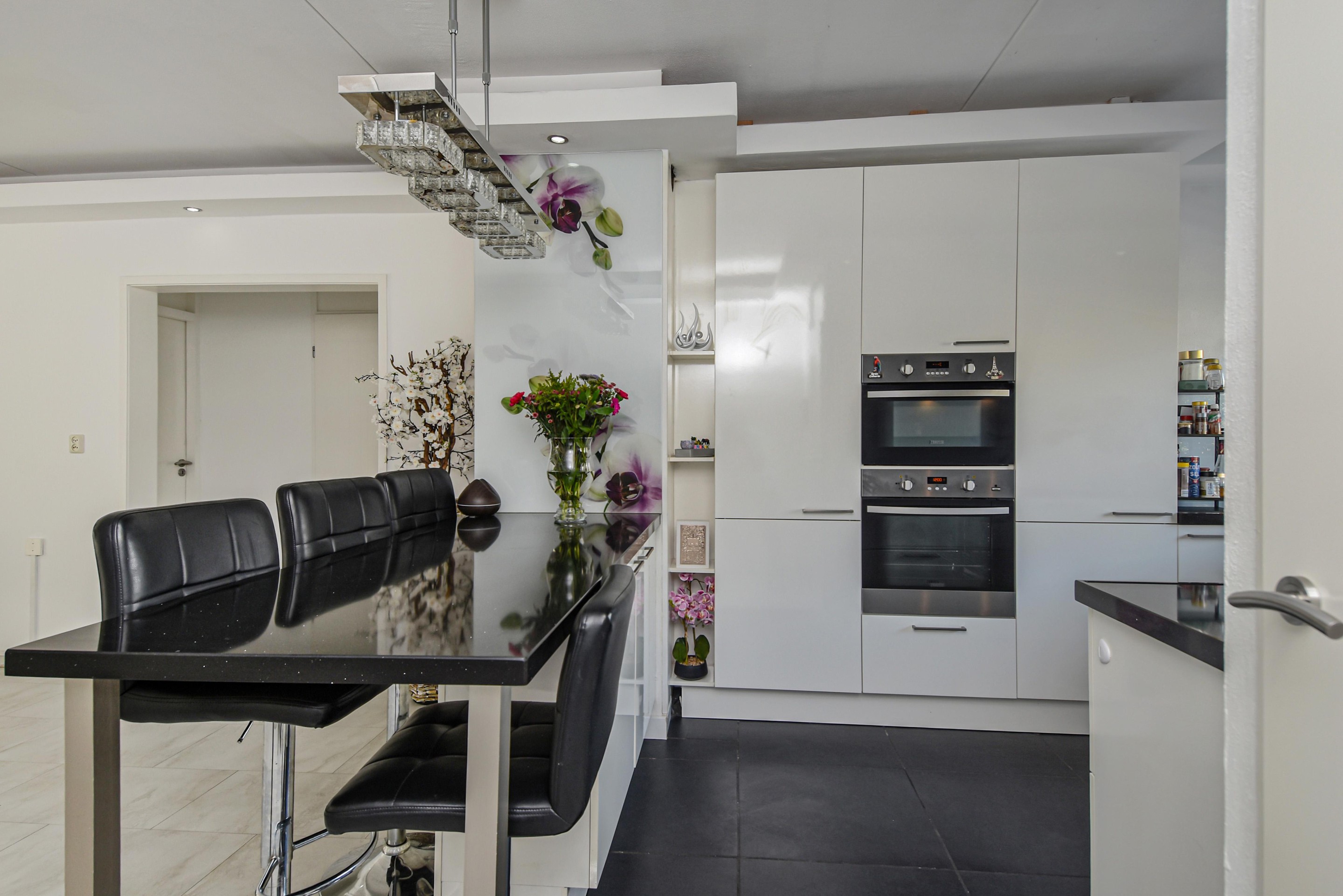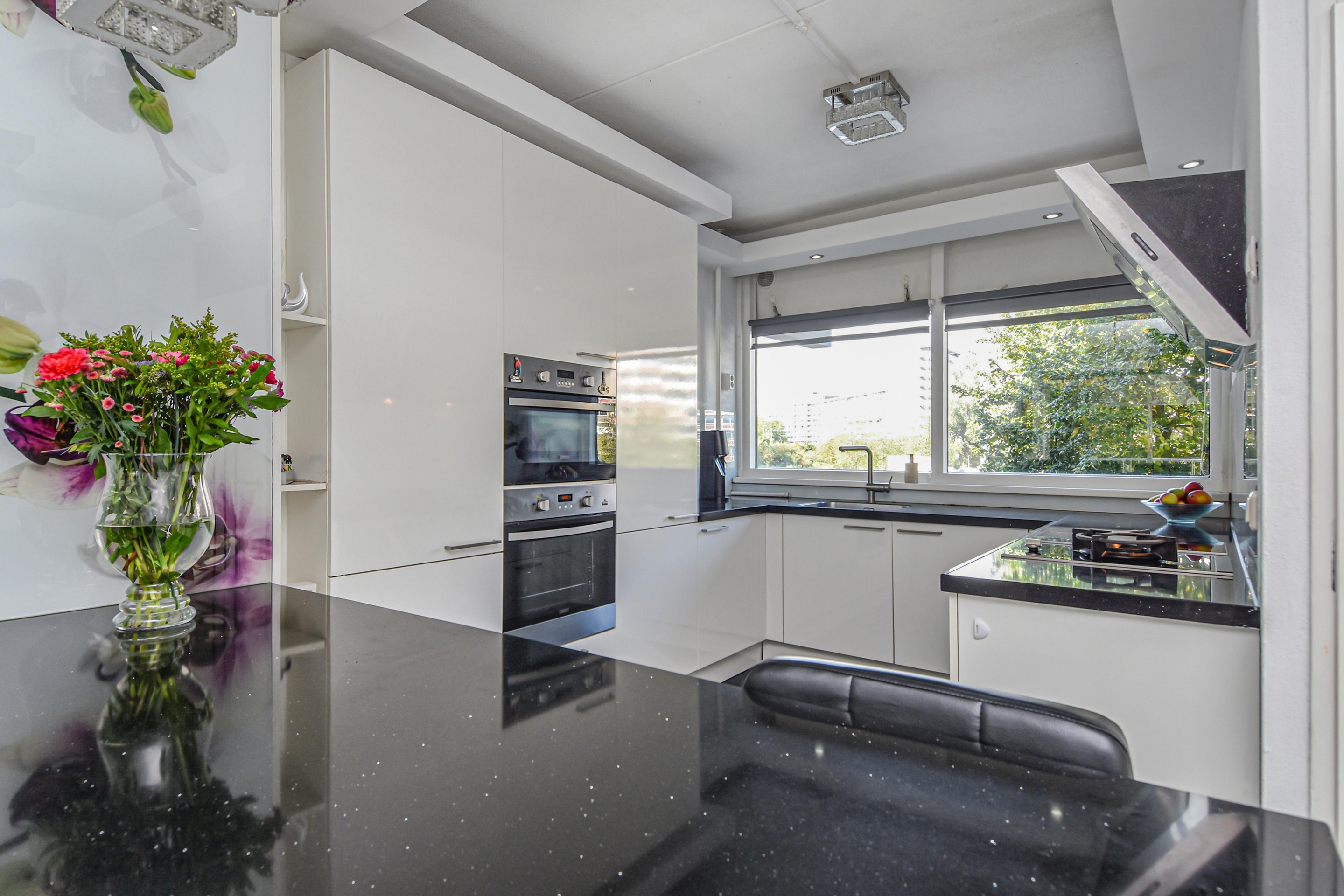 De moderne keuken aan de galerijzijde is uitgerust met een zwart natuurstenen (composiet) werkblad, RVS-afzuigkap, gas wokbrander, inductiekookplaten, oven, combi-oven/magnetron, ruime vriezer (7 laden), grote koelkast en glazen achterwand.