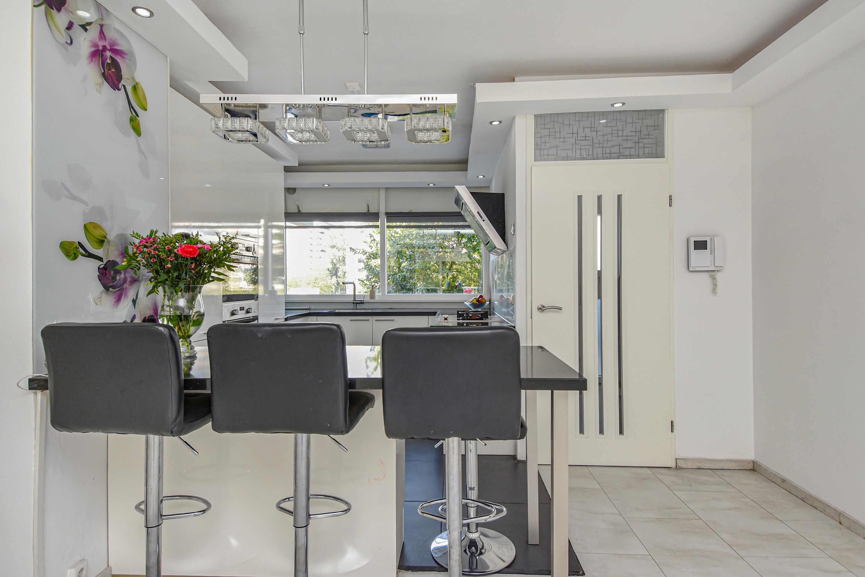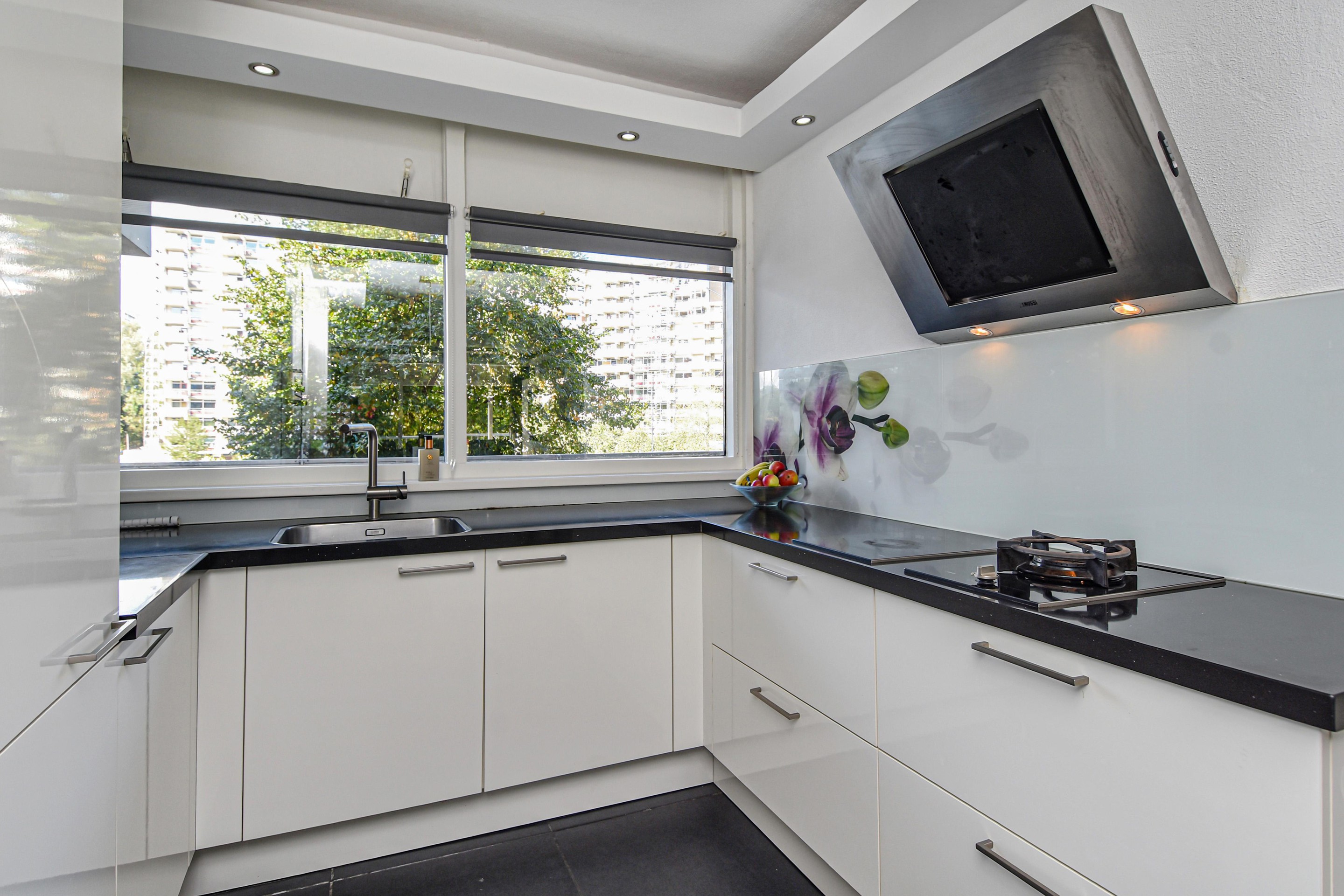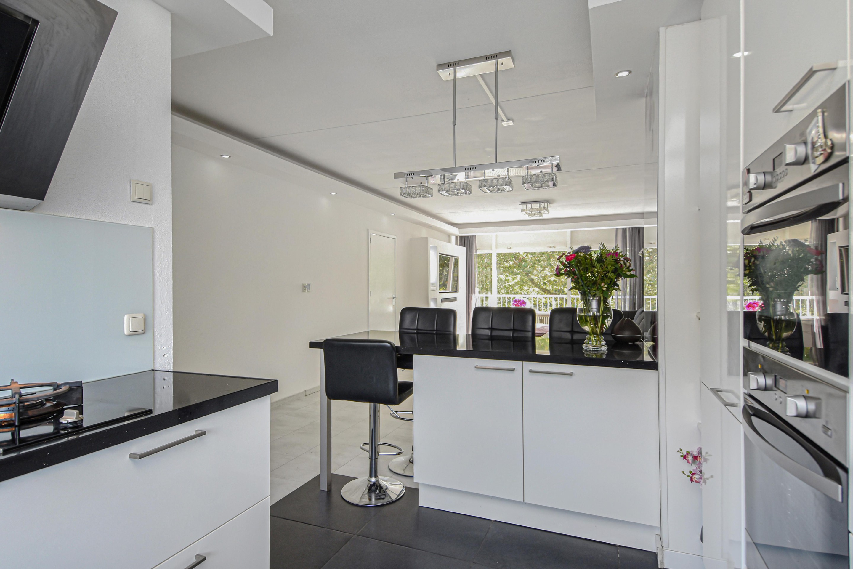 De moderne keuken aan de galerijzijde is uitgerust met een zwart natuurstenen (composiet) werkblad, RVS-afzuigkap, gas wokbrander, inductiekookplaten, oven, combi-oven/magnetron, ruime vriezer (7 laden), grote koelkast en glazen achterwand.