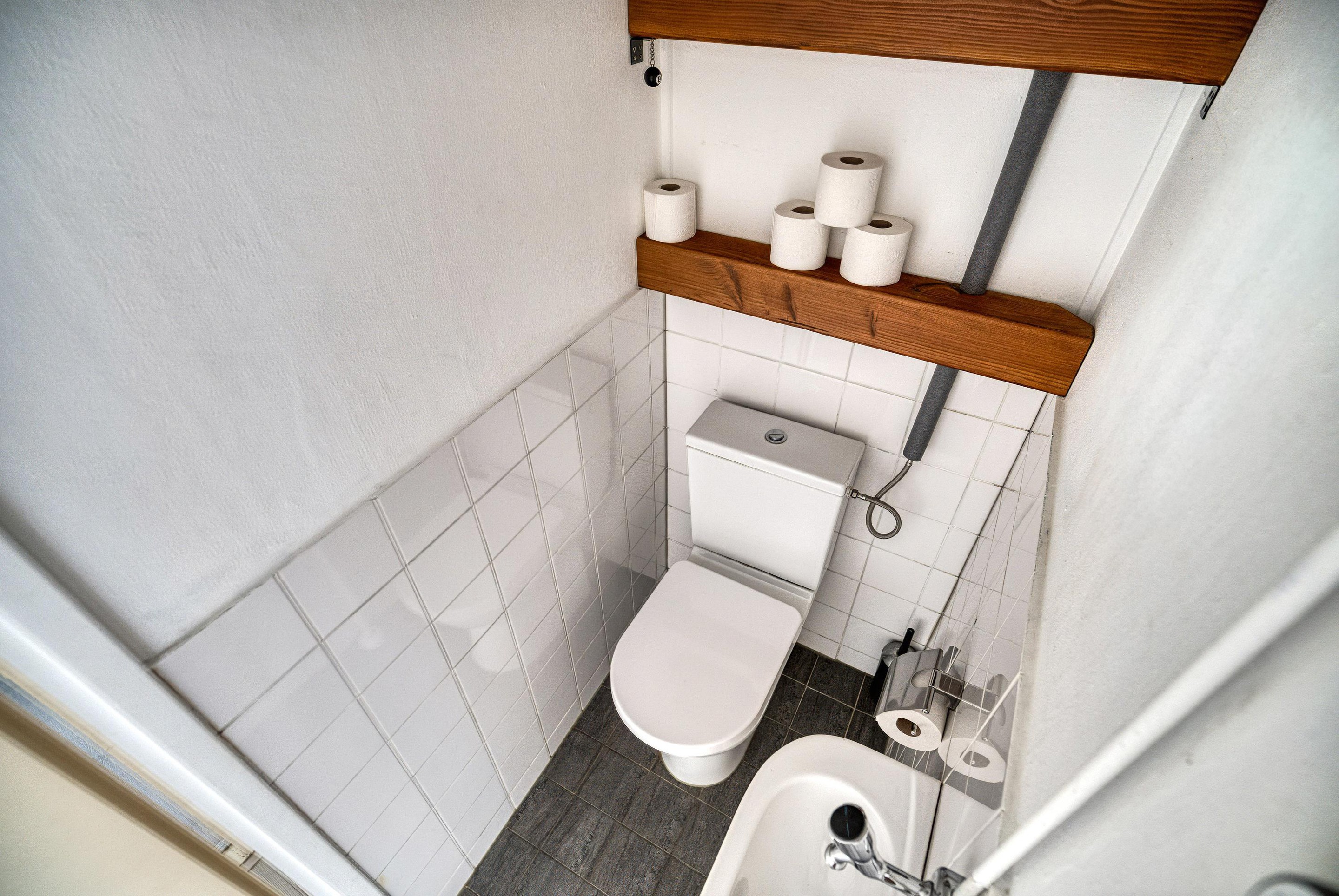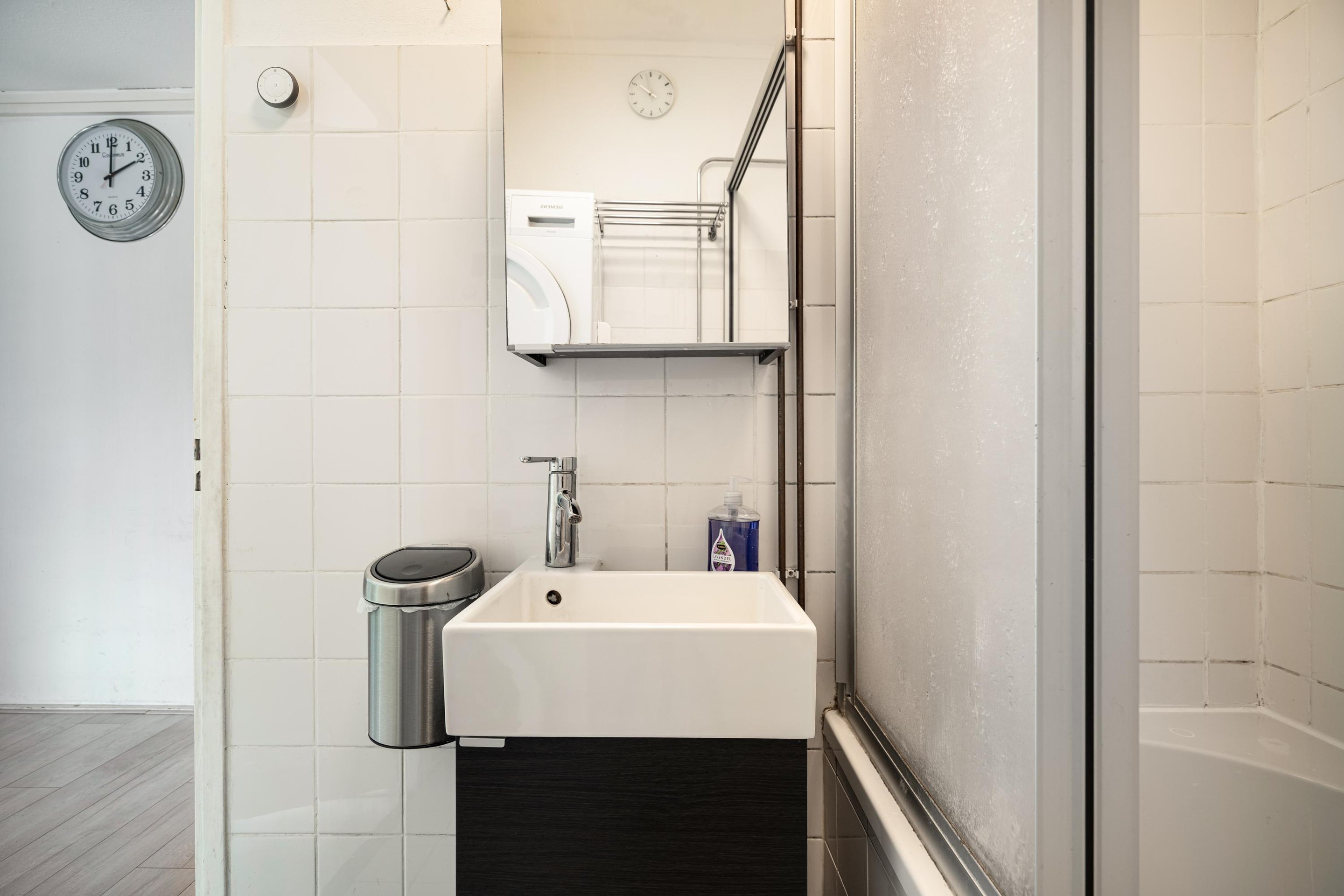 De badkamer is praktisch ingericht met een bad, wastafel en wasmachineaansluiting. Daarnaast is er een separaat toilet met fonteintje en een handige bergkast met meterkast. In de onderbouw bevindt zich een eigen berging (ca. 5 m2).
