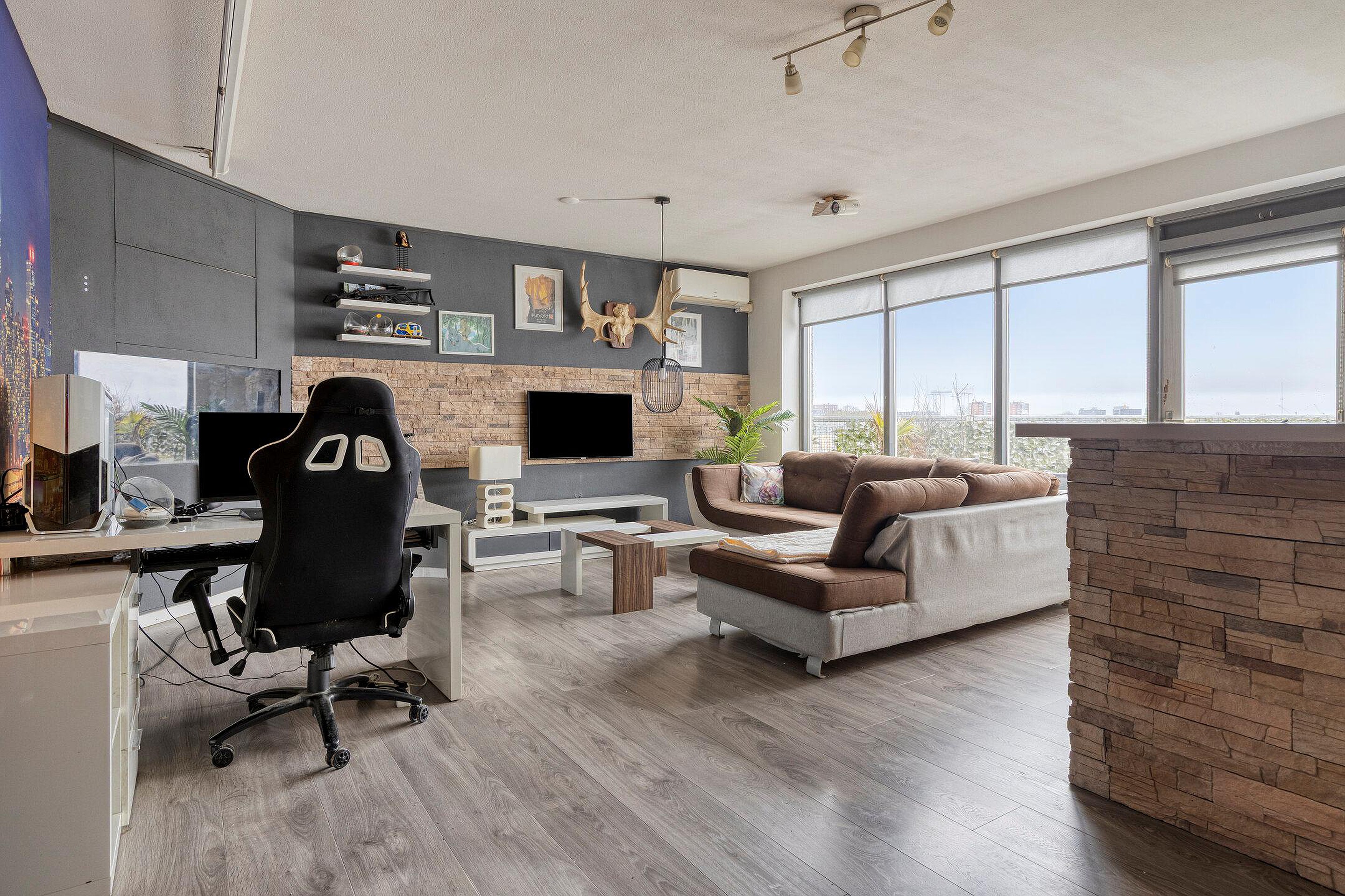 Ruime en lichte woonkamer met een grote raampartij die zorgt voor veel lichtinval. De woonkamer is voorzien van een airco voor verwarmen en koelen. Vanuit de woonkamer heeft u toegang tot het royale terras met vrij uitzicht over de omgeving. Het terras is gelegen op het zuiden