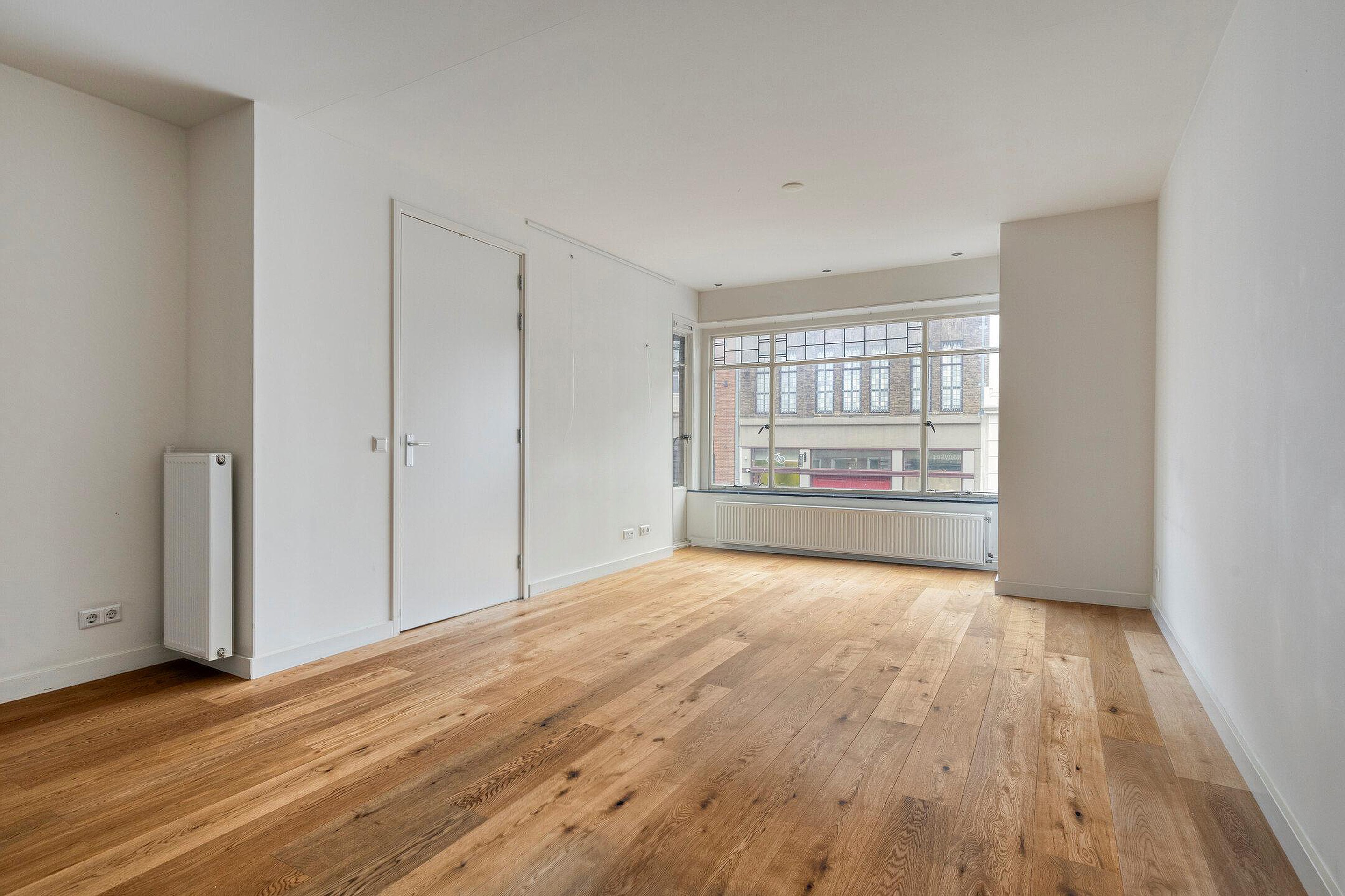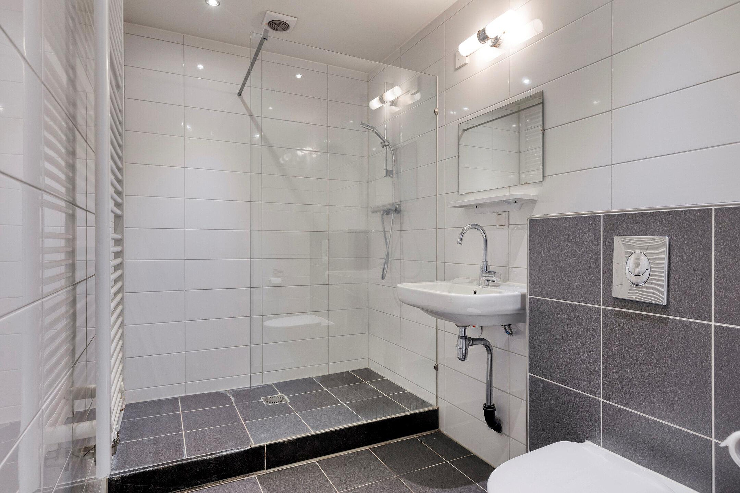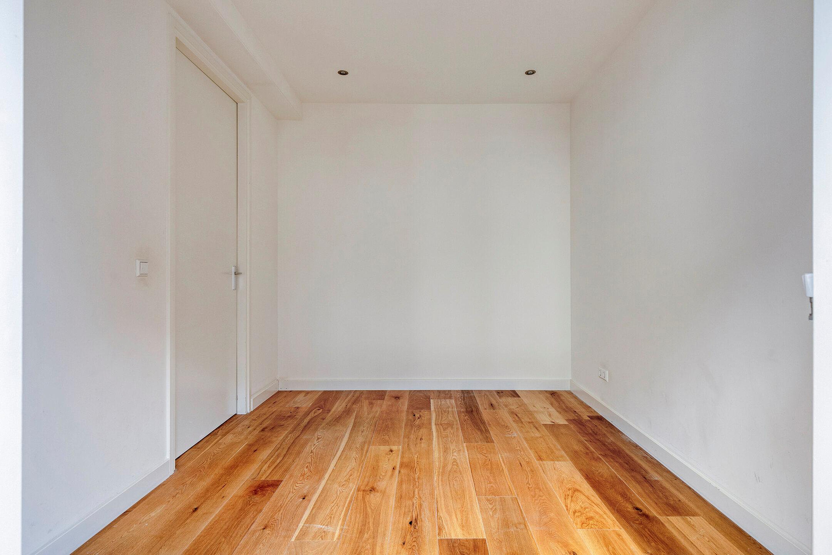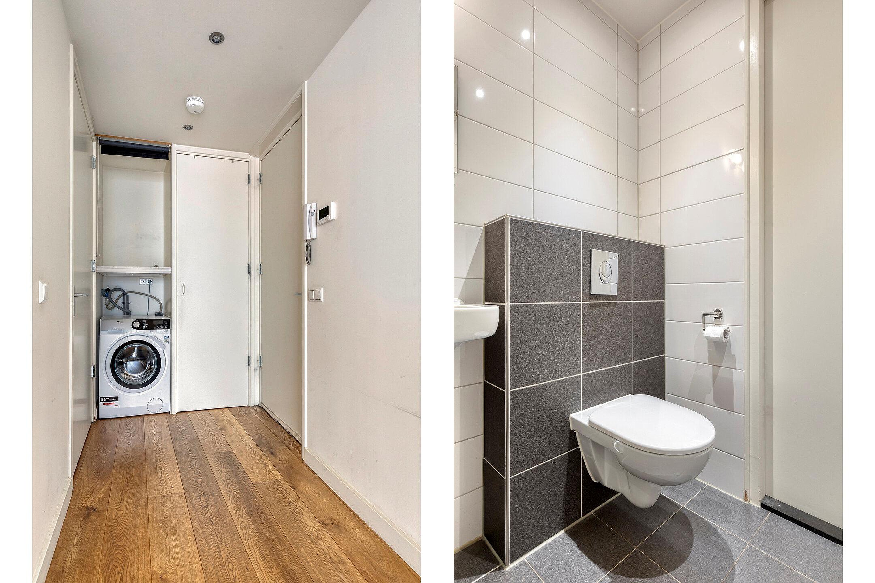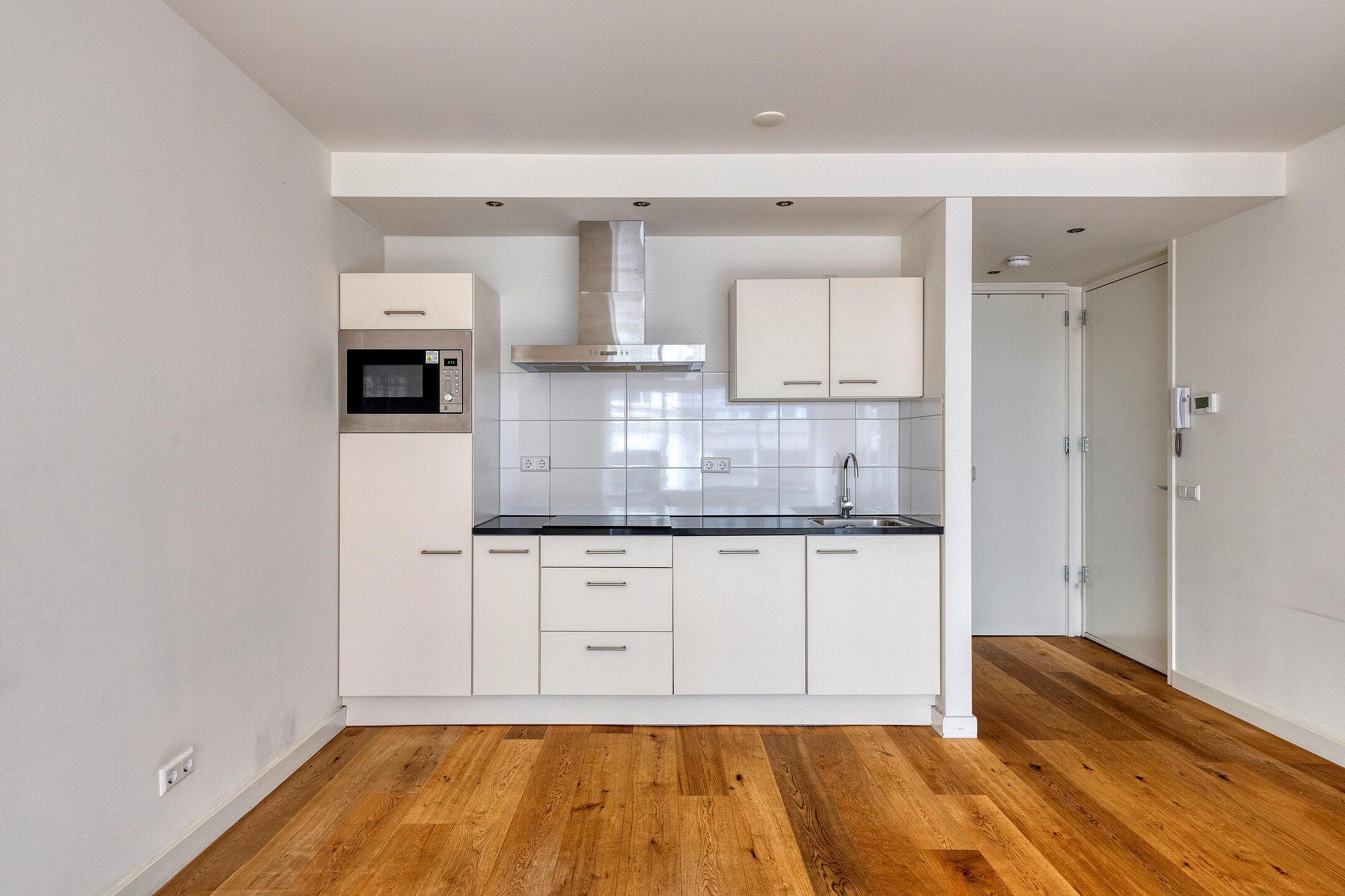 Entree van het appartement met woonkamer en open keuken. De keuken is voorzien van een inductie kookplaat, vaatwasser, inbouwkoelkast, combimagnetron en afzuigkap, Dankzij de goede breedte van de woonkamer is er meer dan voldoende ruimte voor een ruime zit- en eethoek. Via de woonkamer loop je door naar de slaapruimte aan de voorzijde van het appartement. Deze kamer heeft openslaande deuren naar een klein inpandig balkon. Zowel de woonkamer als de slaapkamer zijn voorzien van eikenhouten vloeren. De ruime badkamer beschikt over een toilet, wastafel en douche. Naast de badkamer zit nog een aparte kast met de aansluiting voor de wasmachine.