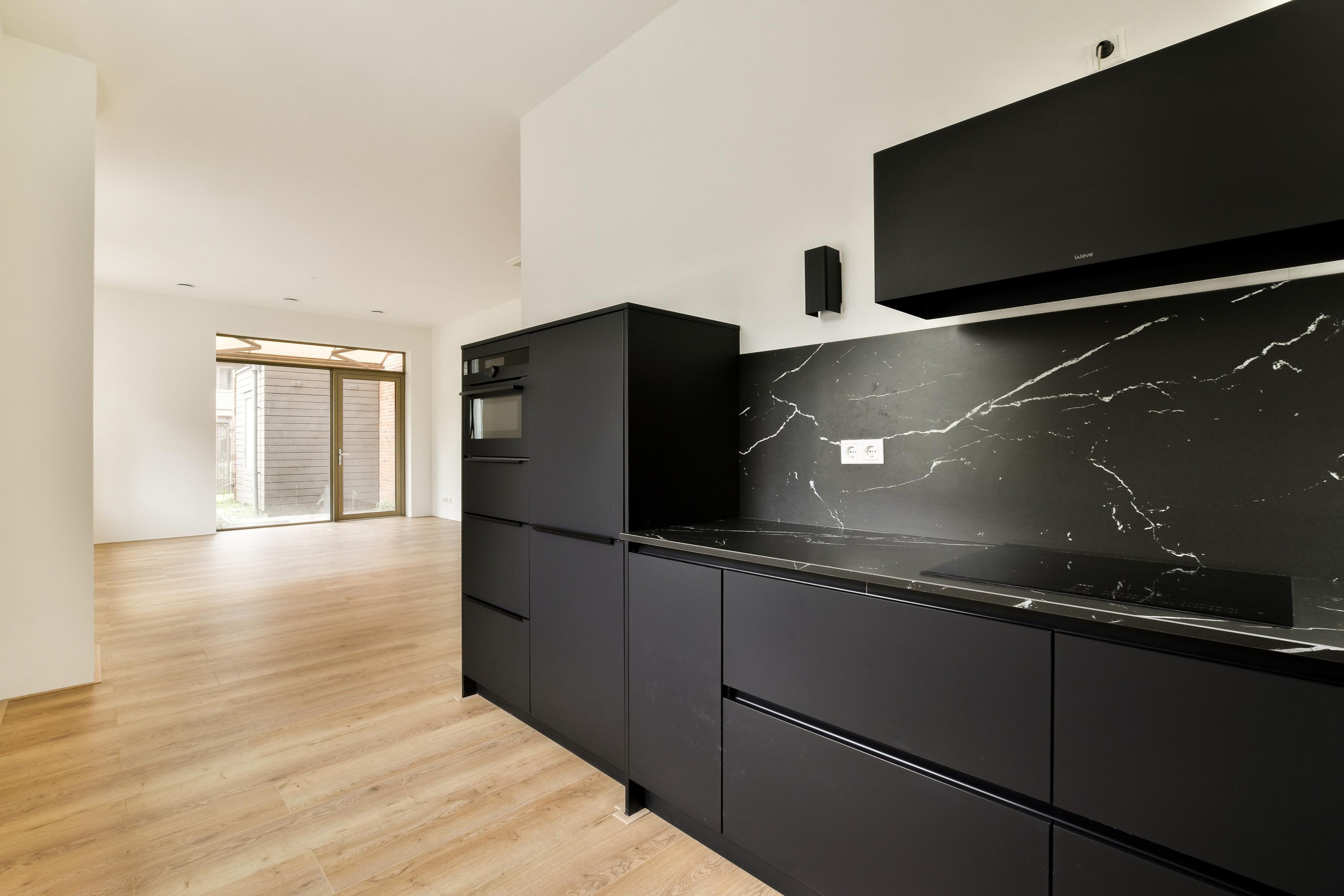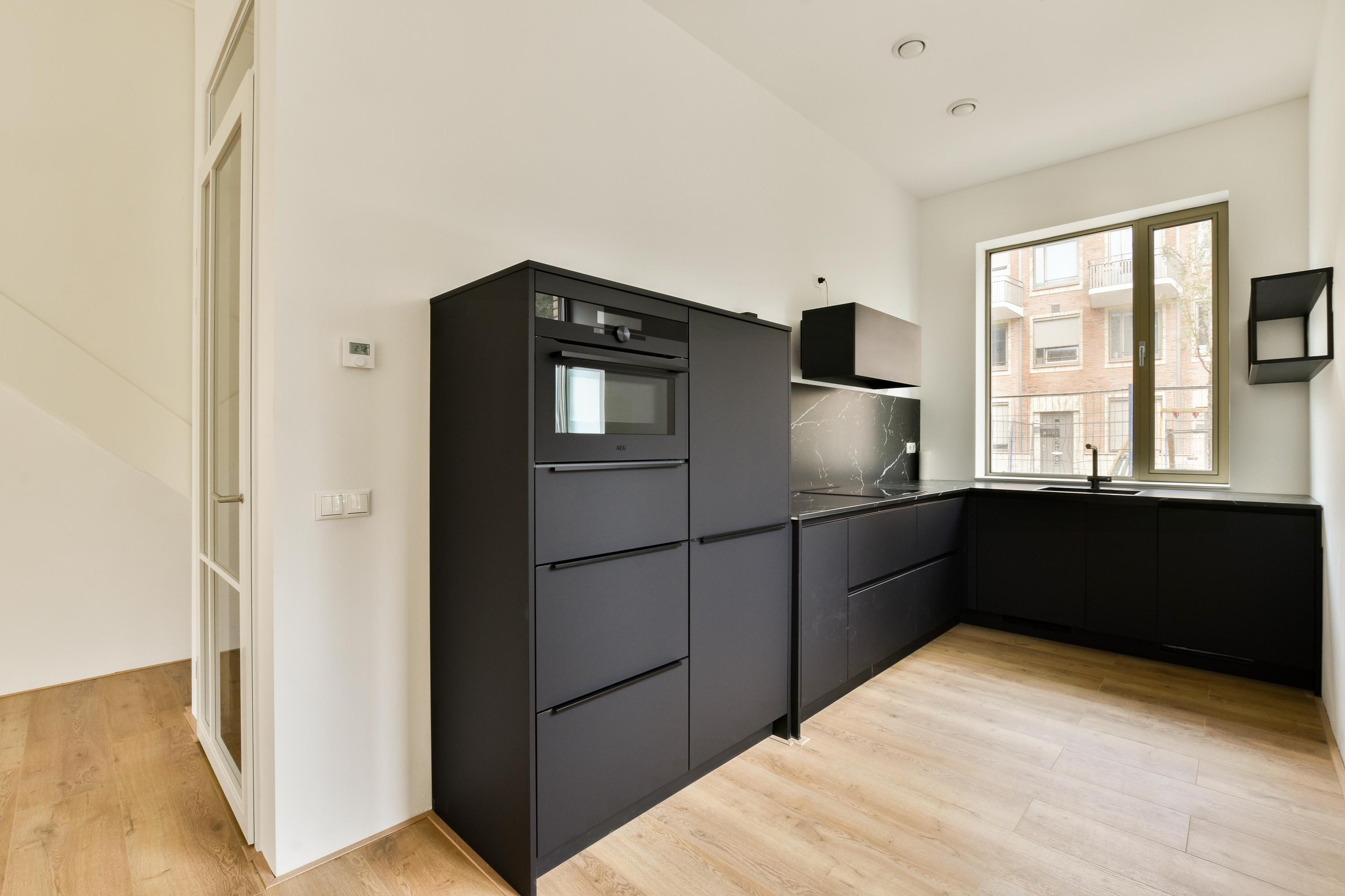 Begane grond De woning beschikt over een royale woonkamer met een extra hoge plafondhoogte van 3,10 meter, wat direct zorgt voor een open en licht gevoel. De luxe, mat zwarte keuken is nog nooit gebruikt en voorzien van hoogwaardige AEG inbouwapparatuur — perfect voor kookliefhebbers en gezellige diners.