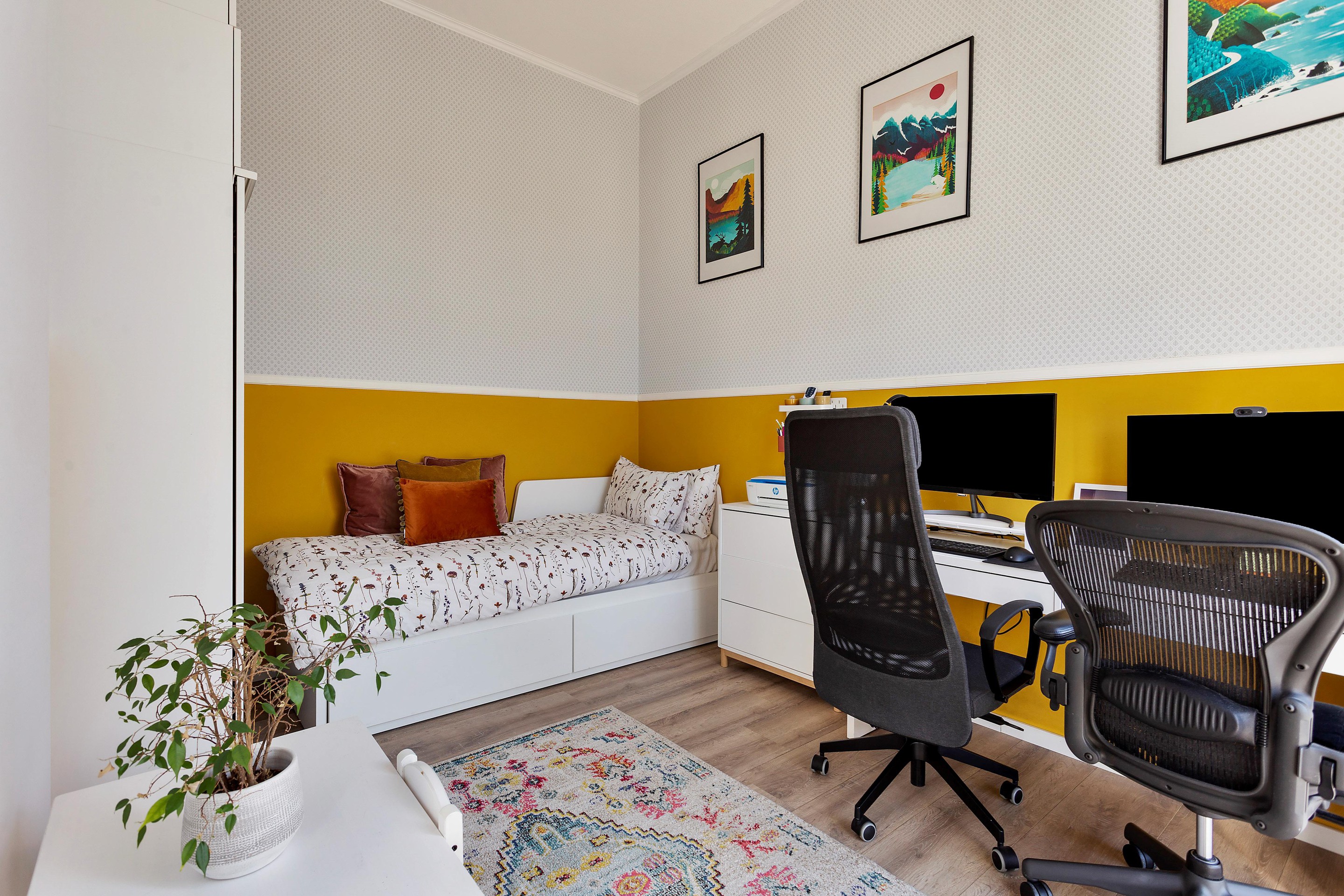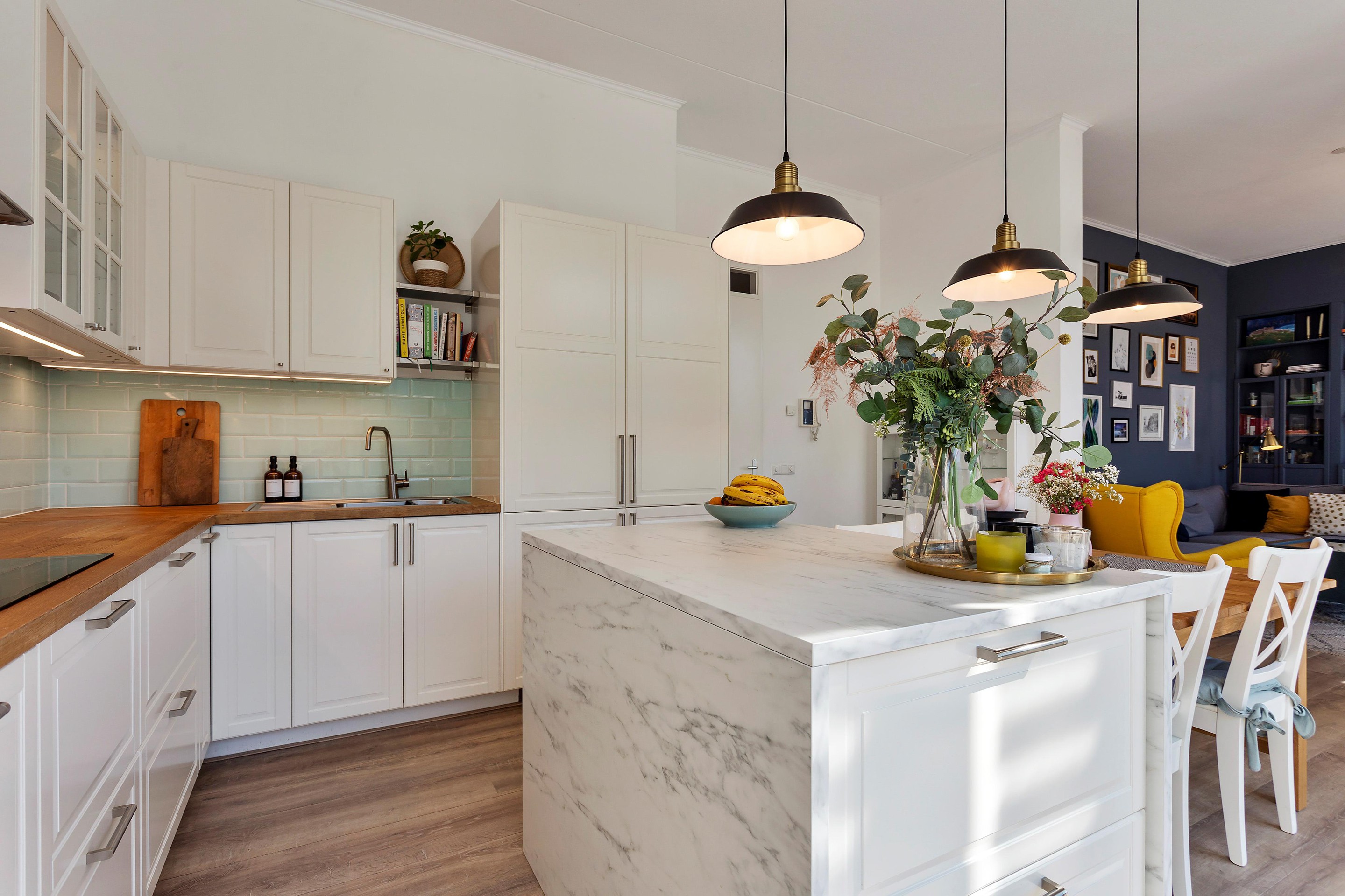 The spacious living room is bright and atmospheric, also with French doors leading outside. Next to the living room is an extra room that can serve perfectly as a bedroom, home office, or nursery.