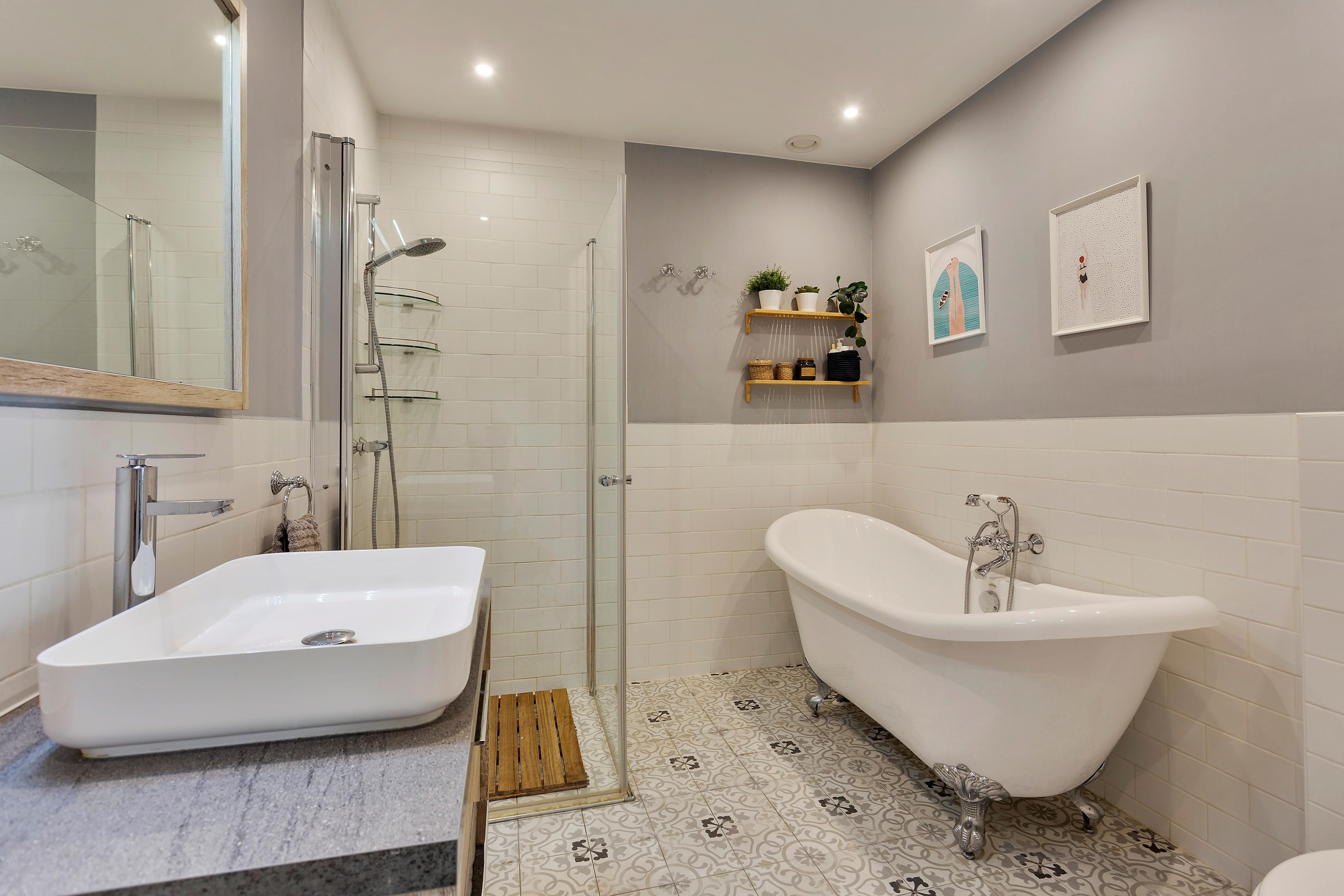 De trap in de hal brengt je naar de eerste verdieping. Op de overloop vind je een handige kast met wasmachine. De badkamer is stijlvol ingericht met een vrijstaand bad op pootjes, douchecabine, hangend toilet en een fraai wastafelmeubel. De twee ruime slaapkamers op deze verdieping bieden allebei toegang tot een heerlijke loggia, een fijne plek om je dag ontspannen af te sluiten met een drankje.