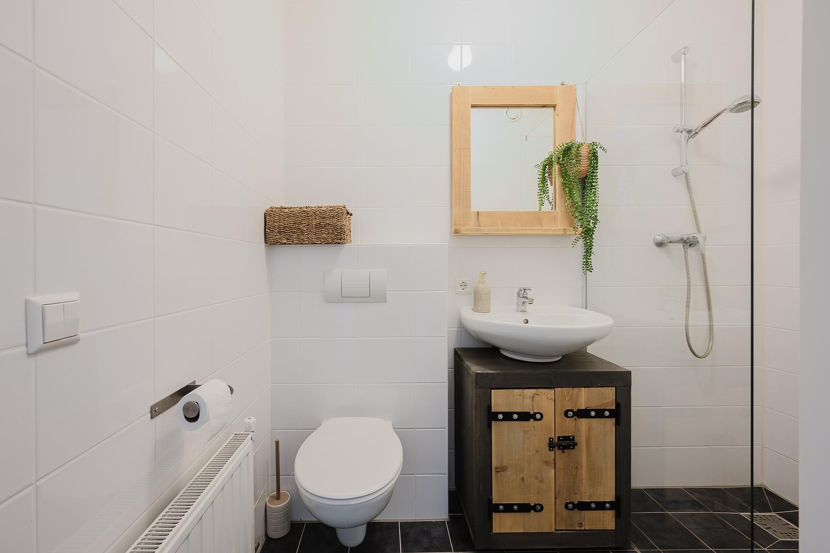 De moderne badkamer is volledig betegeld en uitgerust met een ruime inloopdouche, een wastafelmeubel en een hangend toilet.