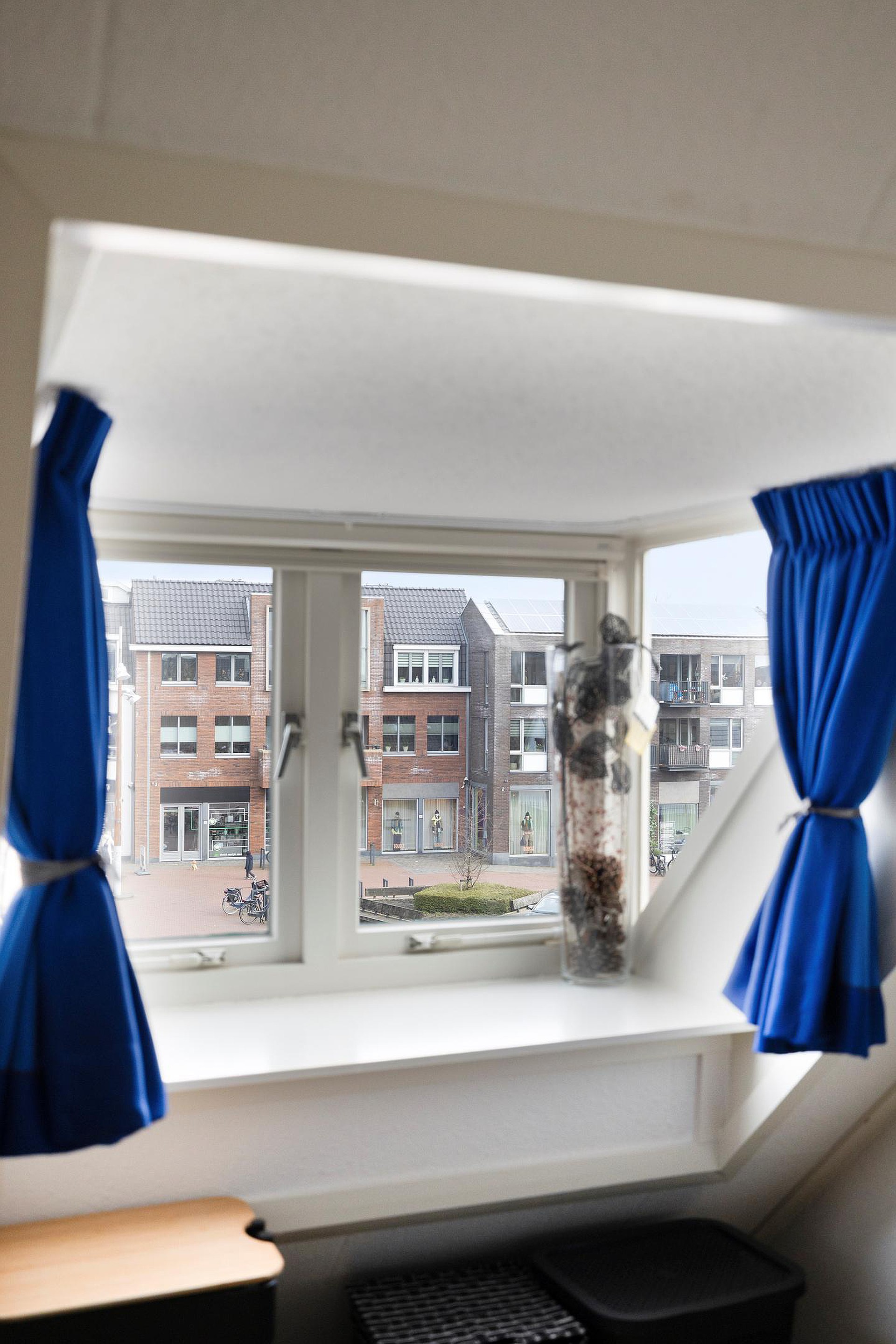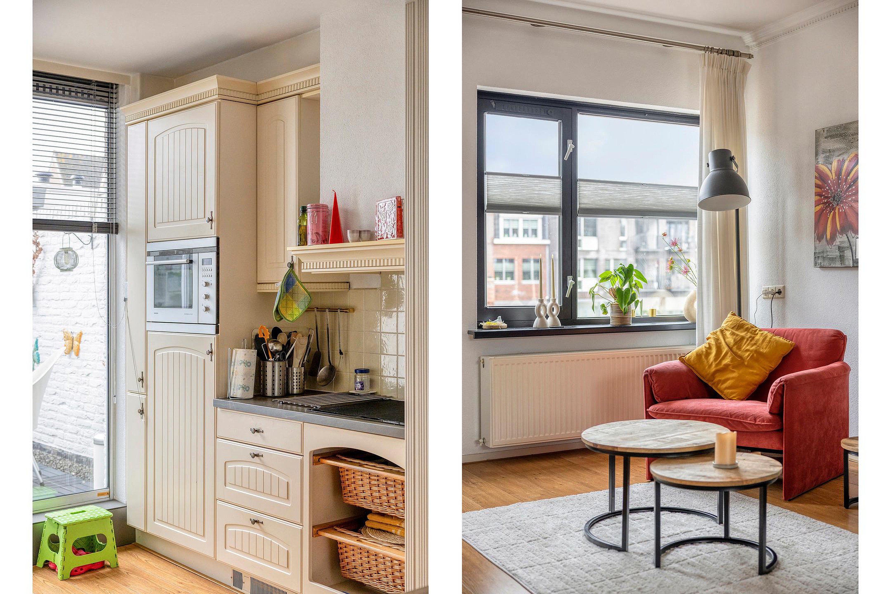 Binnen valt meteen op hoe verzorgd en eigentijds het geheel aanvoelt. De woonkamer is een heerlijke plek om thuis te komen, met vanuit hier een vrij uitzicht over het winkelgebied rond het Zeilmakersplein. Dat geeft net dat beetje levendigheid, terwijl je binnen gewoon rustig je eigen ruimte hebt. Aansluitend vind je de complete keuken: praktisch ingericht en helemaal klaar voor dagelijks gebruik.