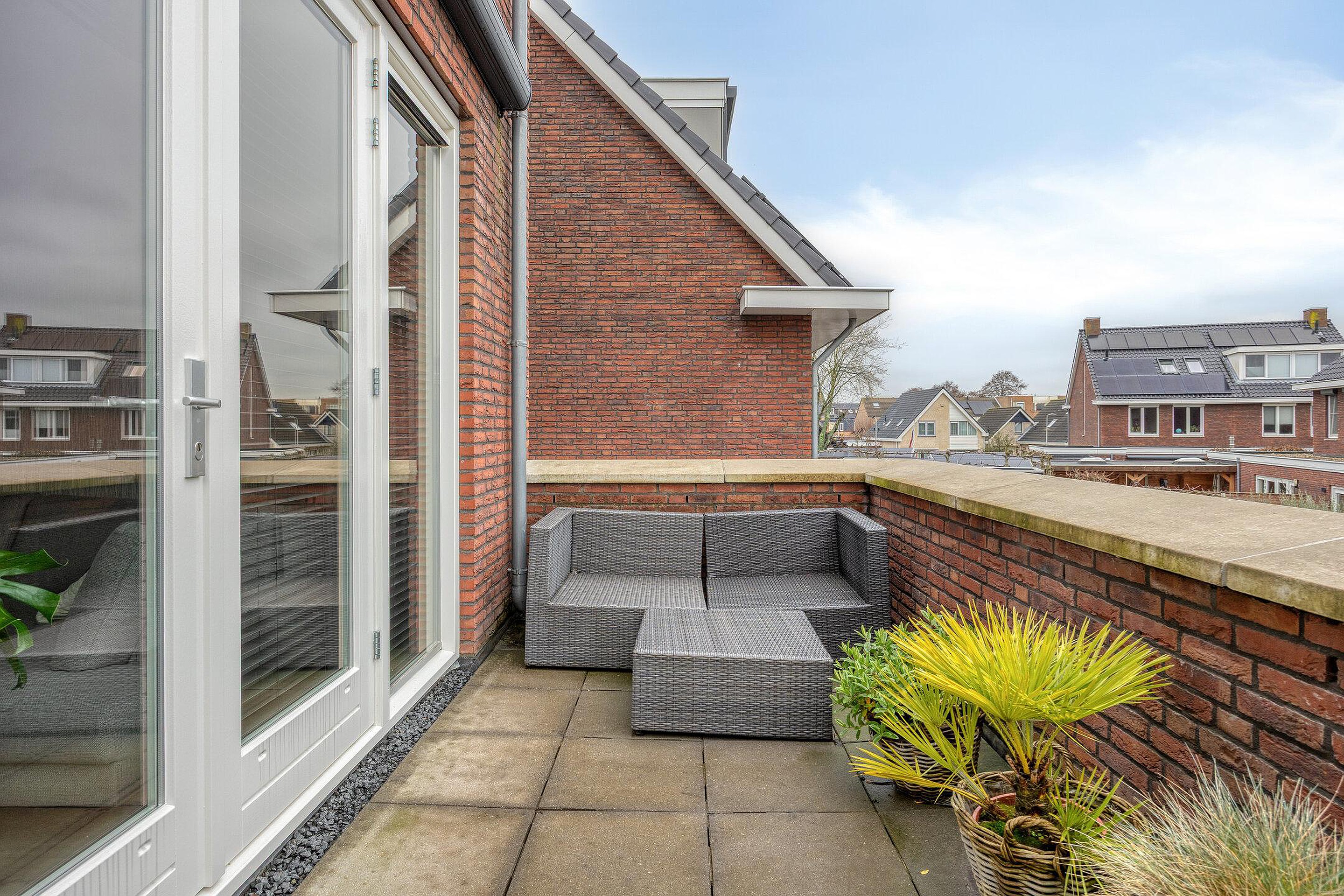 Via de trap bereik je de overloop met toilet. Het toilet is voorzien van een wandcloset en fontein. De woonkamer is heerlijk licht en ruimtelijk. De openslaande deuren geven toegang tot het zonnige dakterras, gelegen op het zuidoosten van circa 11 m2. Dit is een heerlijke plek om te ontspannen.