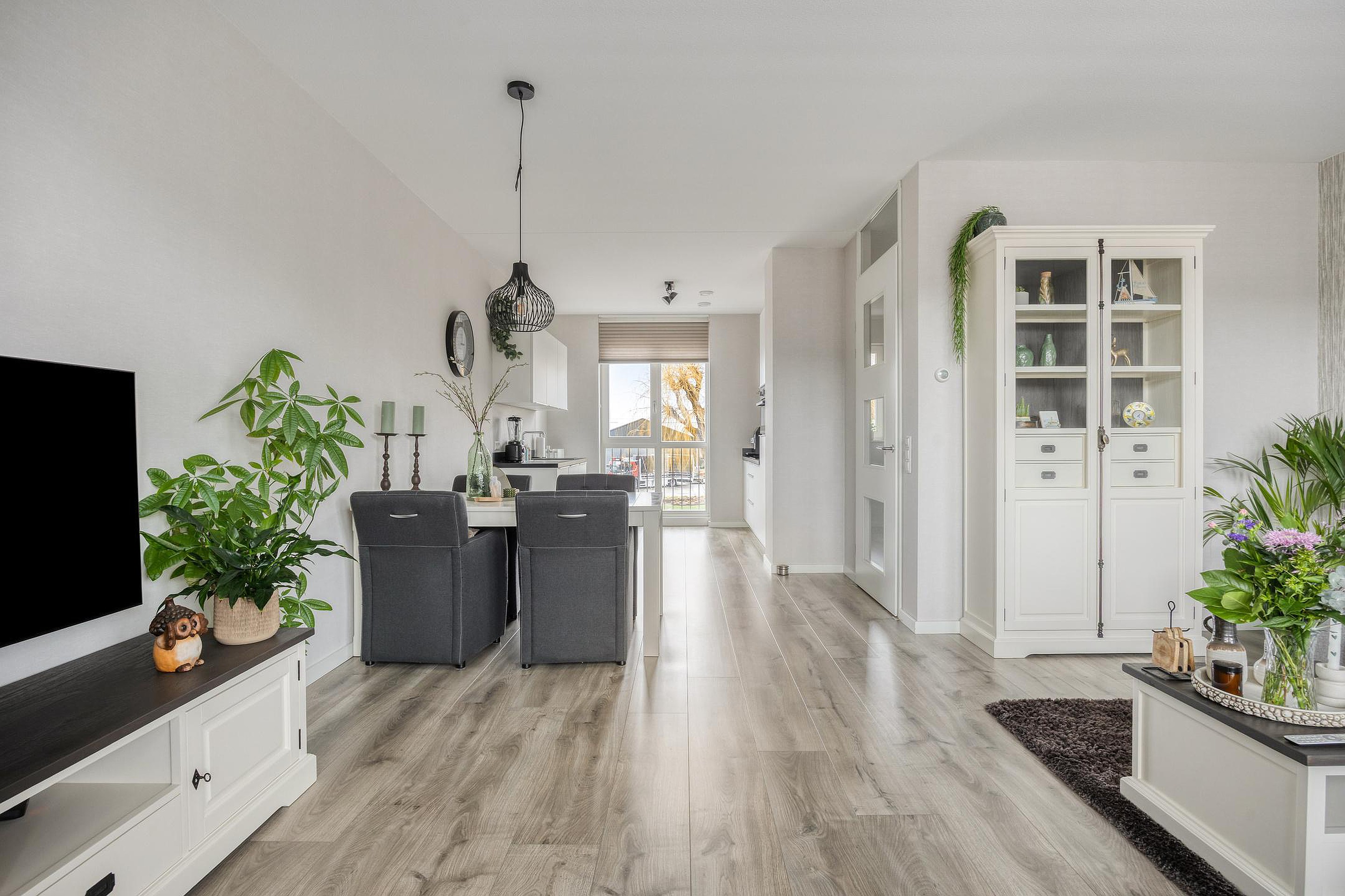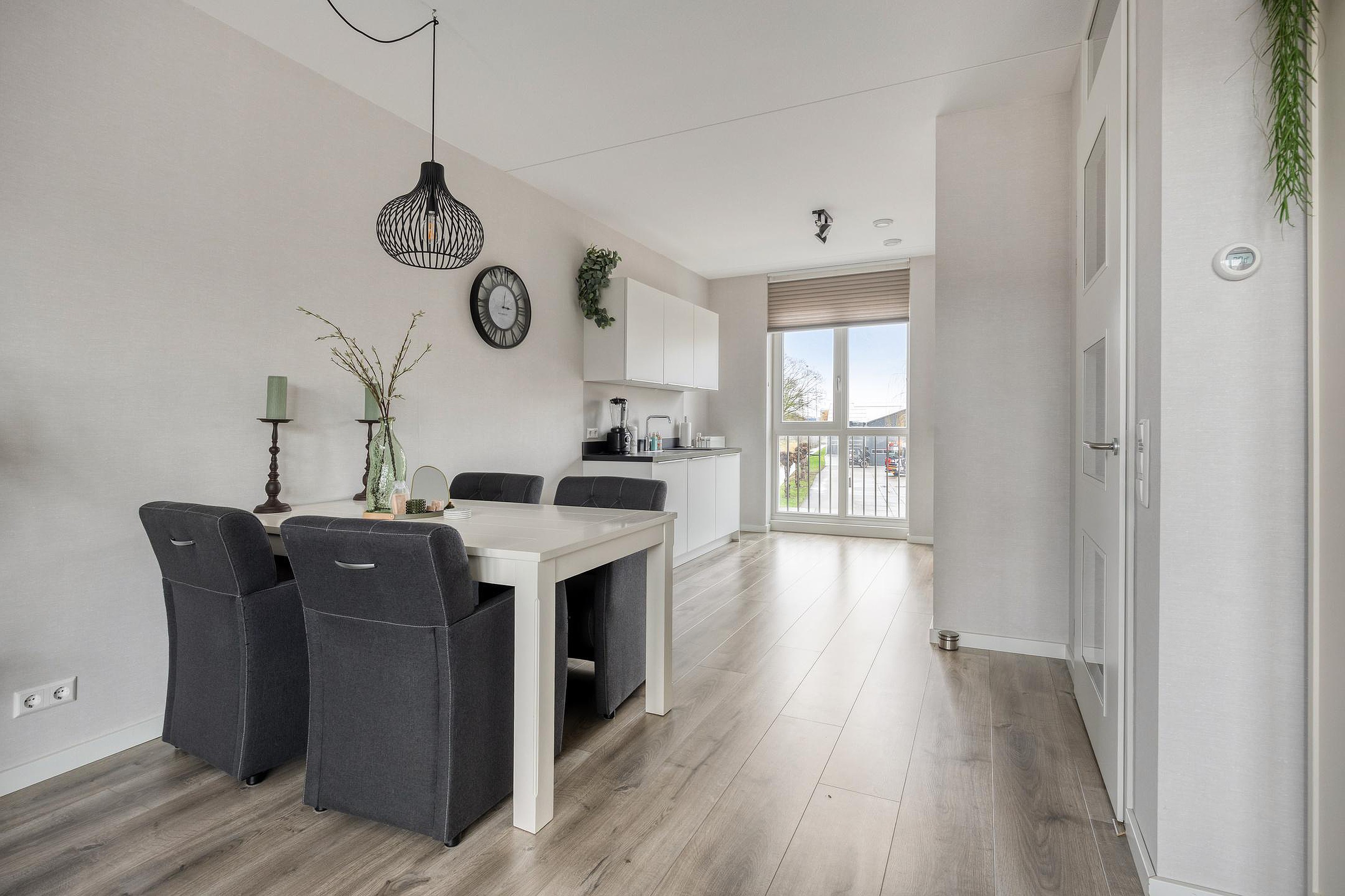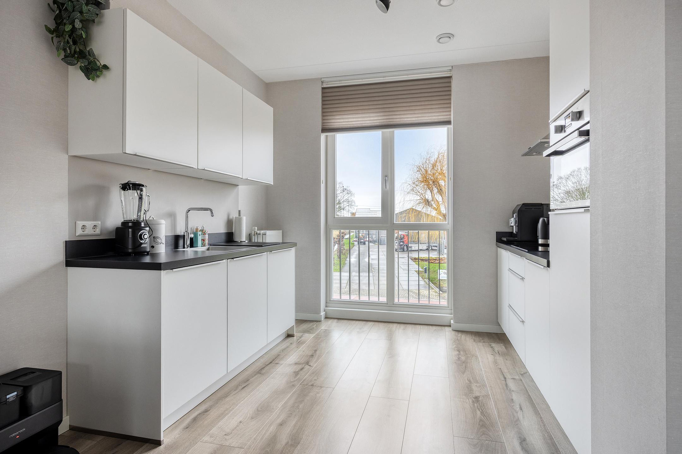 De moderne keuken is royaal opgezet en is voorzien van een inductiekookplaat , afzuigkap, koelkast, combi-oven en vaatwasser. De keuken is heerlijk licht door het hoge raam en staat in open verbinding met de woonkamer. Dit zorgt voor een zeer prettige leefruimte.