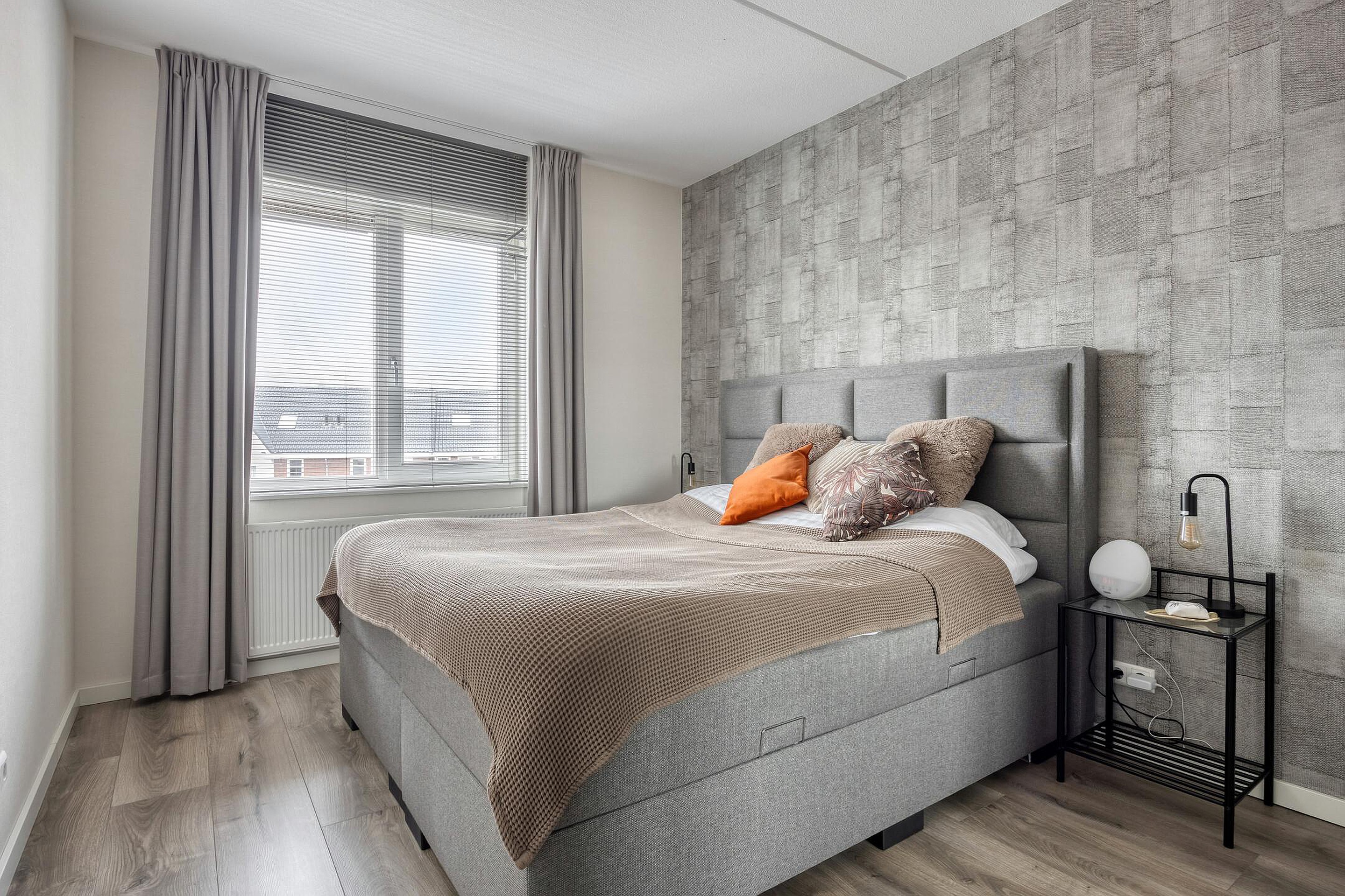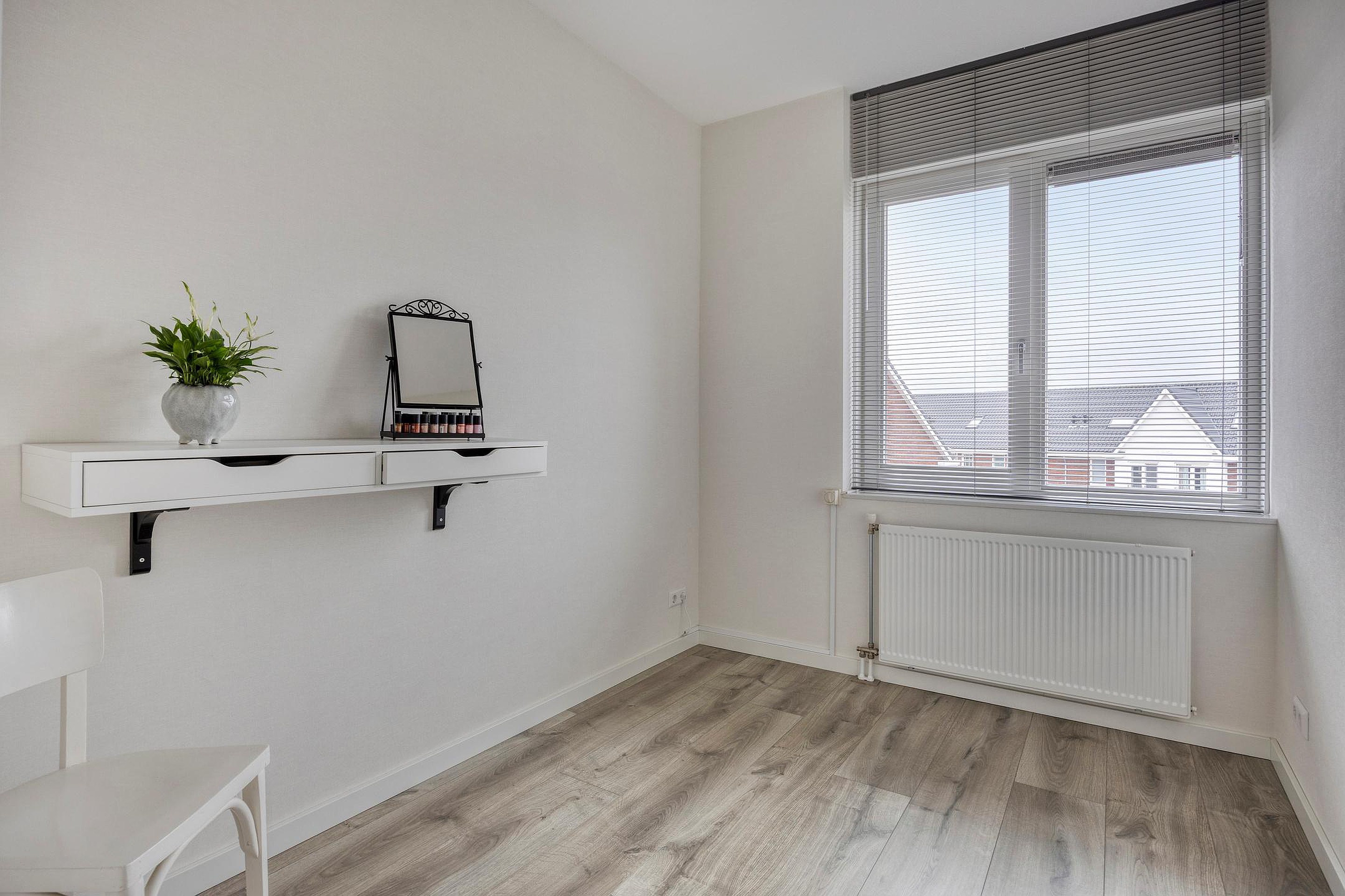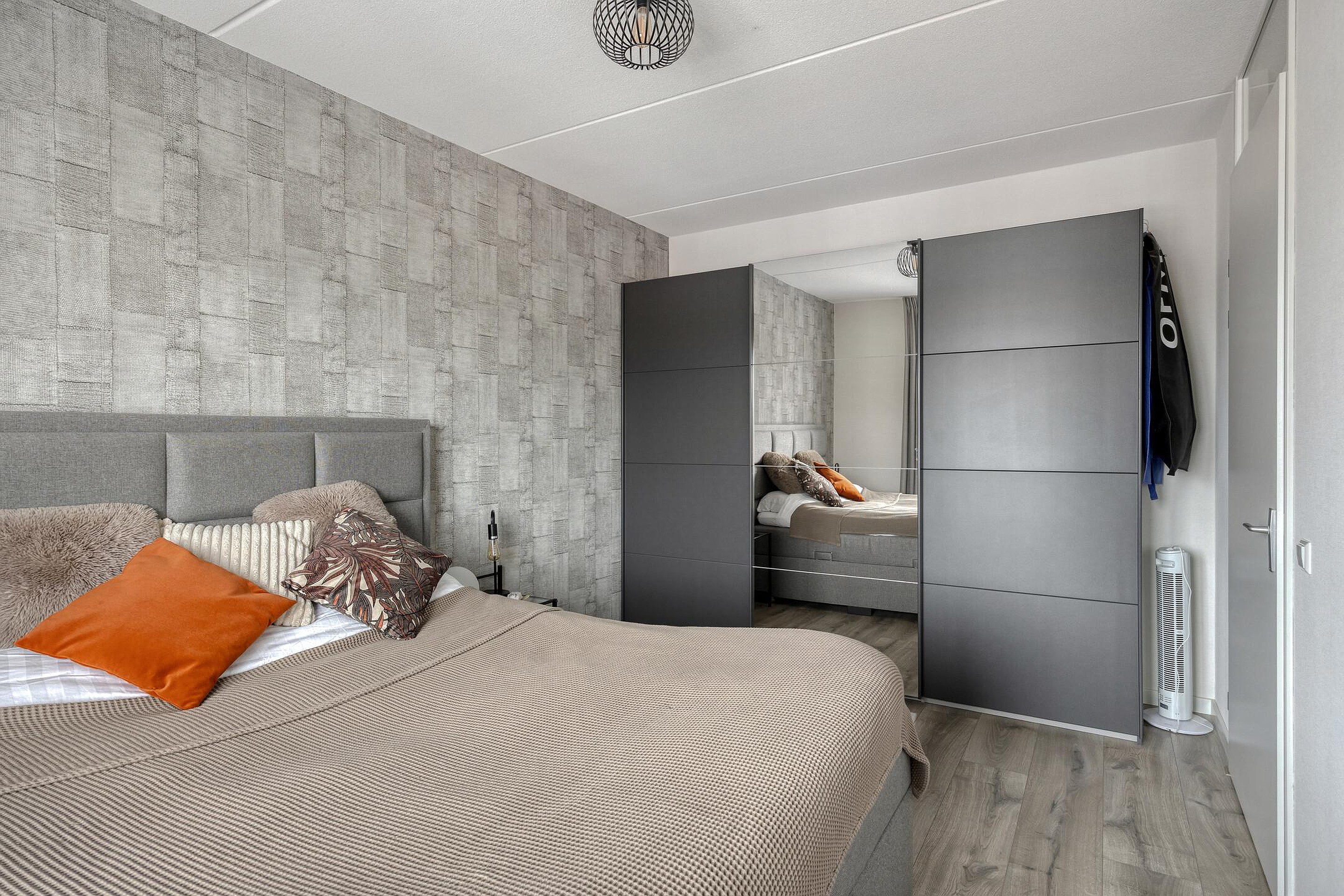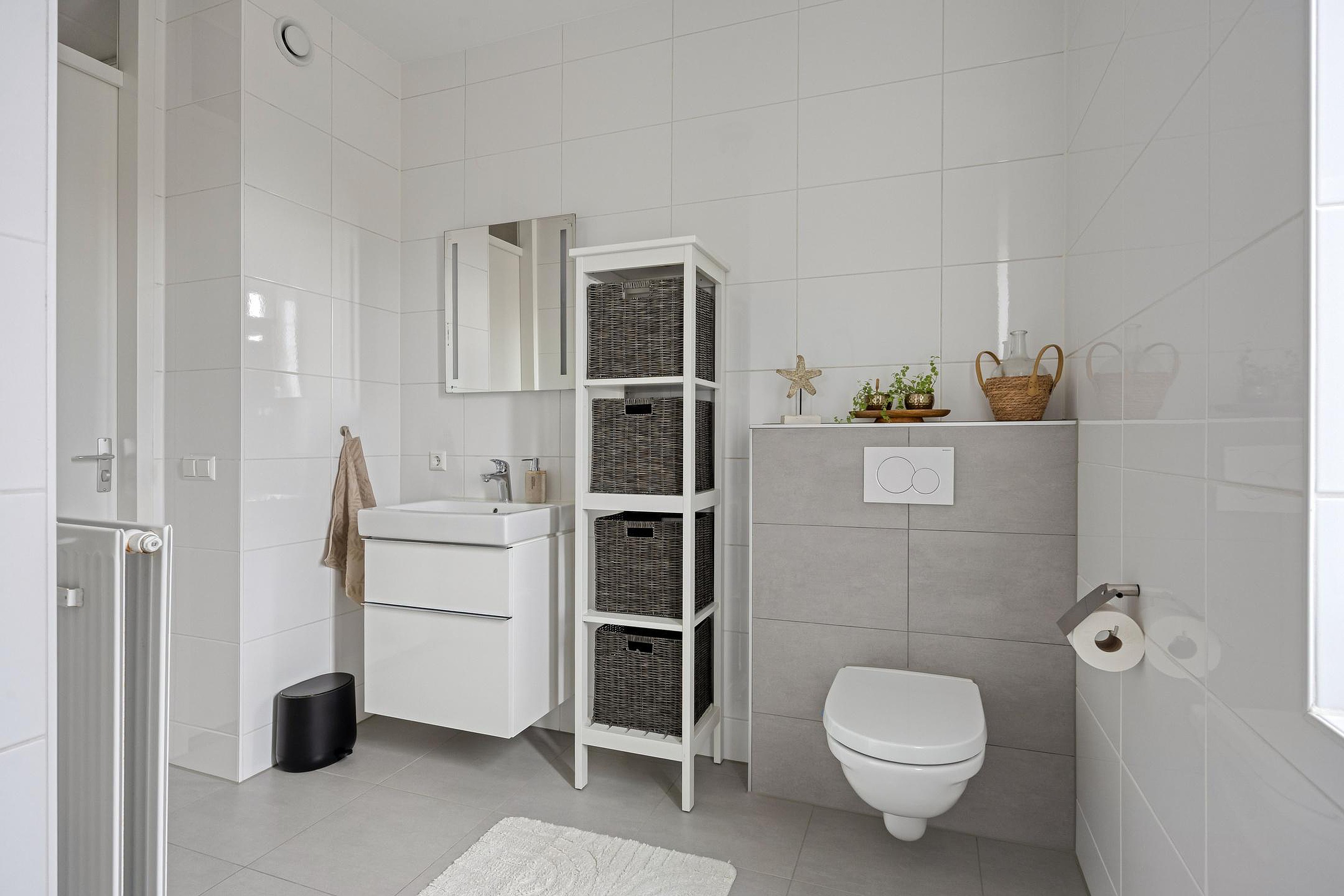 De overloop biedt toegang tot een praktische wasmachinekast, drie slaapkamers en de badkamer. De hoofdslaapkamer biedt eveneens ruimte voor een schuifkastenwand. Aan de achterzijde van de woning zijn de slaapkamers voorzien van elektrisch bedienbare screens. De badkamer is modern afgewerkt en is voorzien van een wastafelmeubel, wandcloset en een inloopdouche.