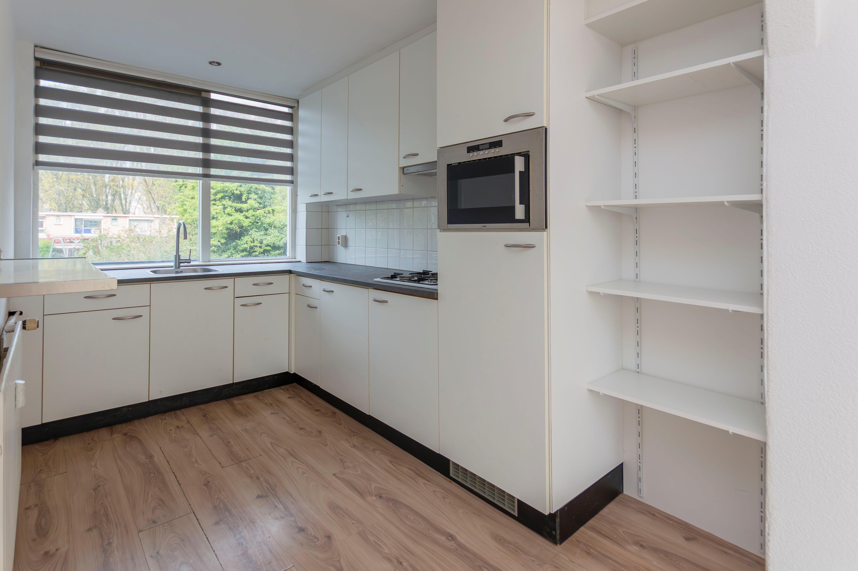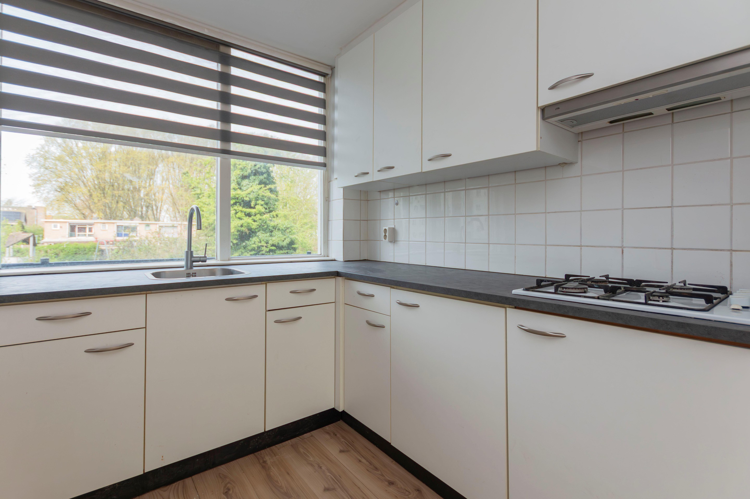 De open keuken is aan de voorzijde gelegen en is ruim opgezet en uitgevoerd in een nette witte kleurstelling met een donker werkblad. Met volop kastruimte en diverse inbouwapparatuur, waaronder een gaskookplaat, afzuigkap en oven, is dit een praktische en prettige plek om te koken.
