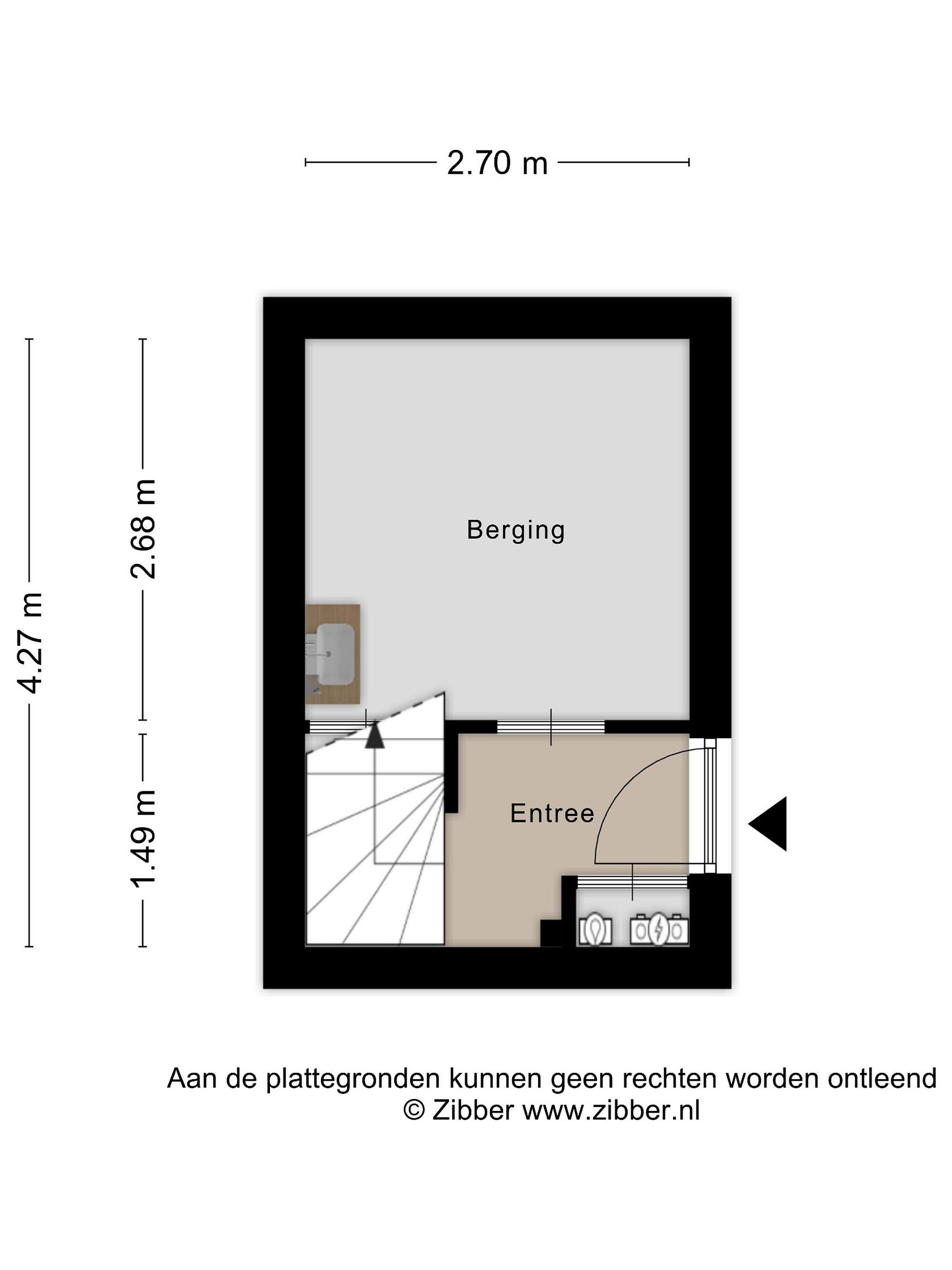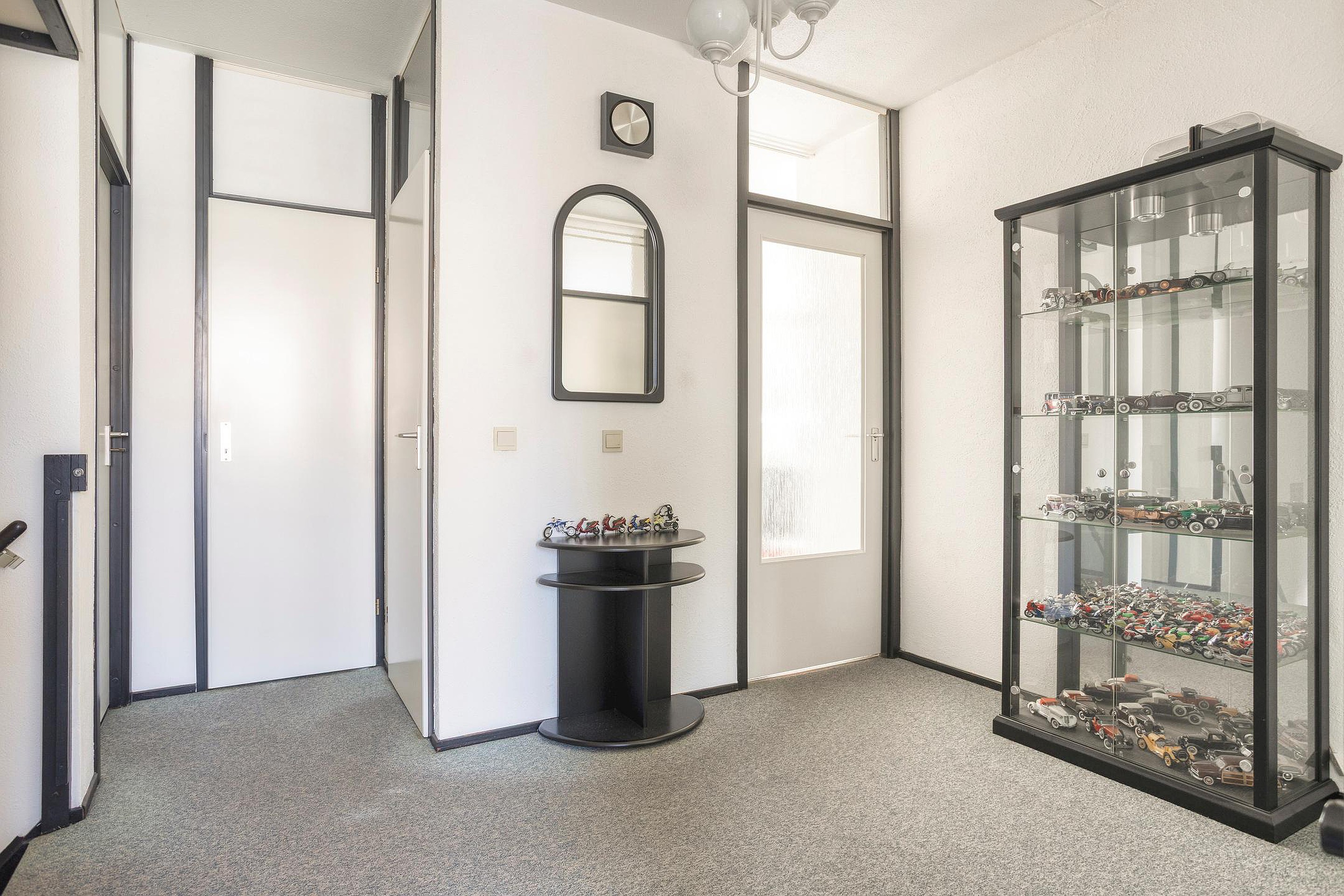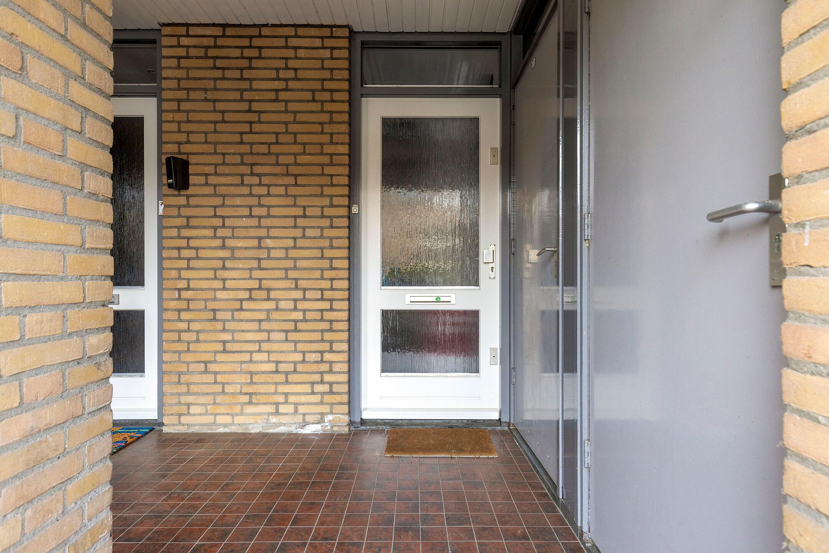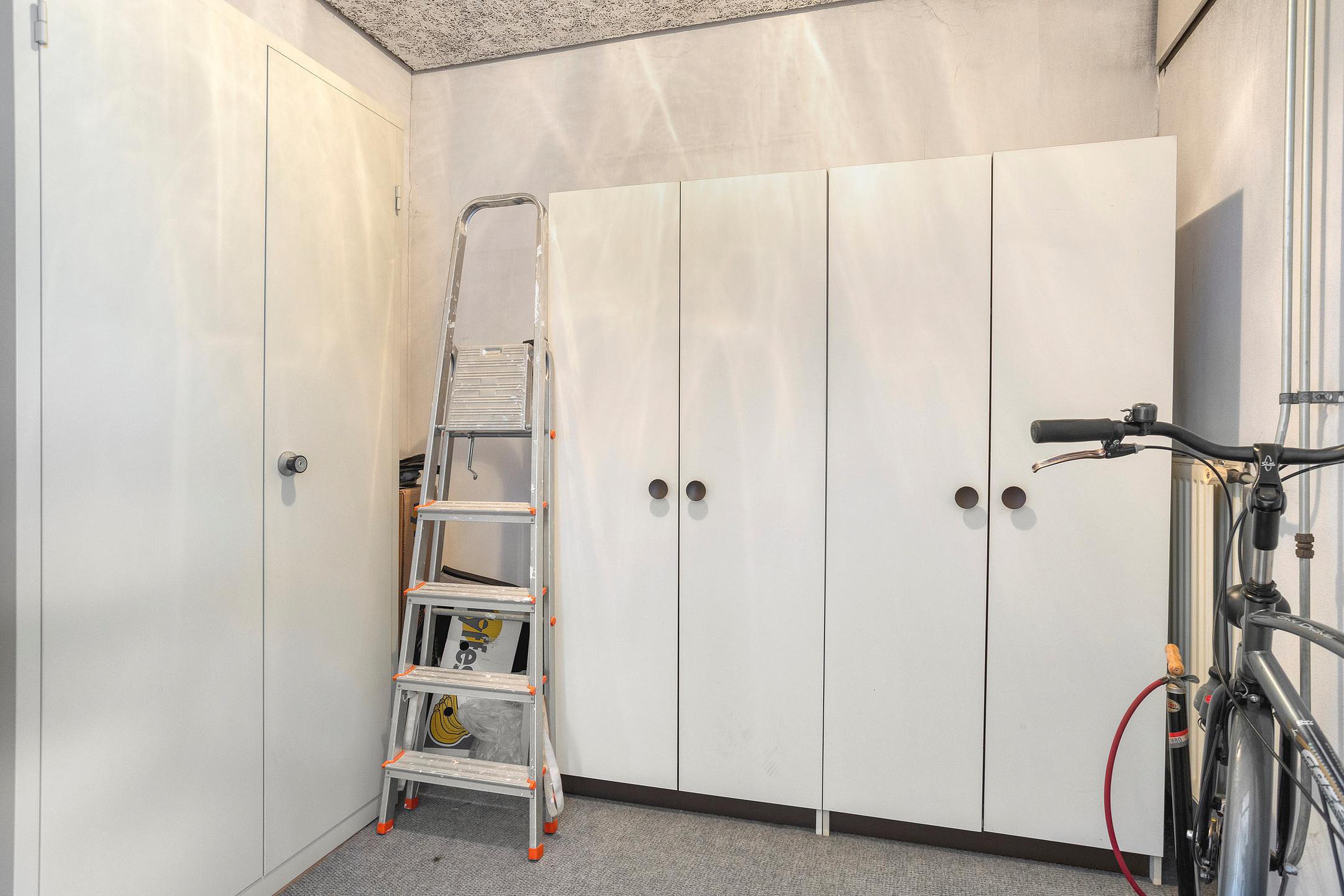 Afgesloten entree met toegang tot de interne berging met verwarming en wastafel en trapopgang naar de woonverdieping.