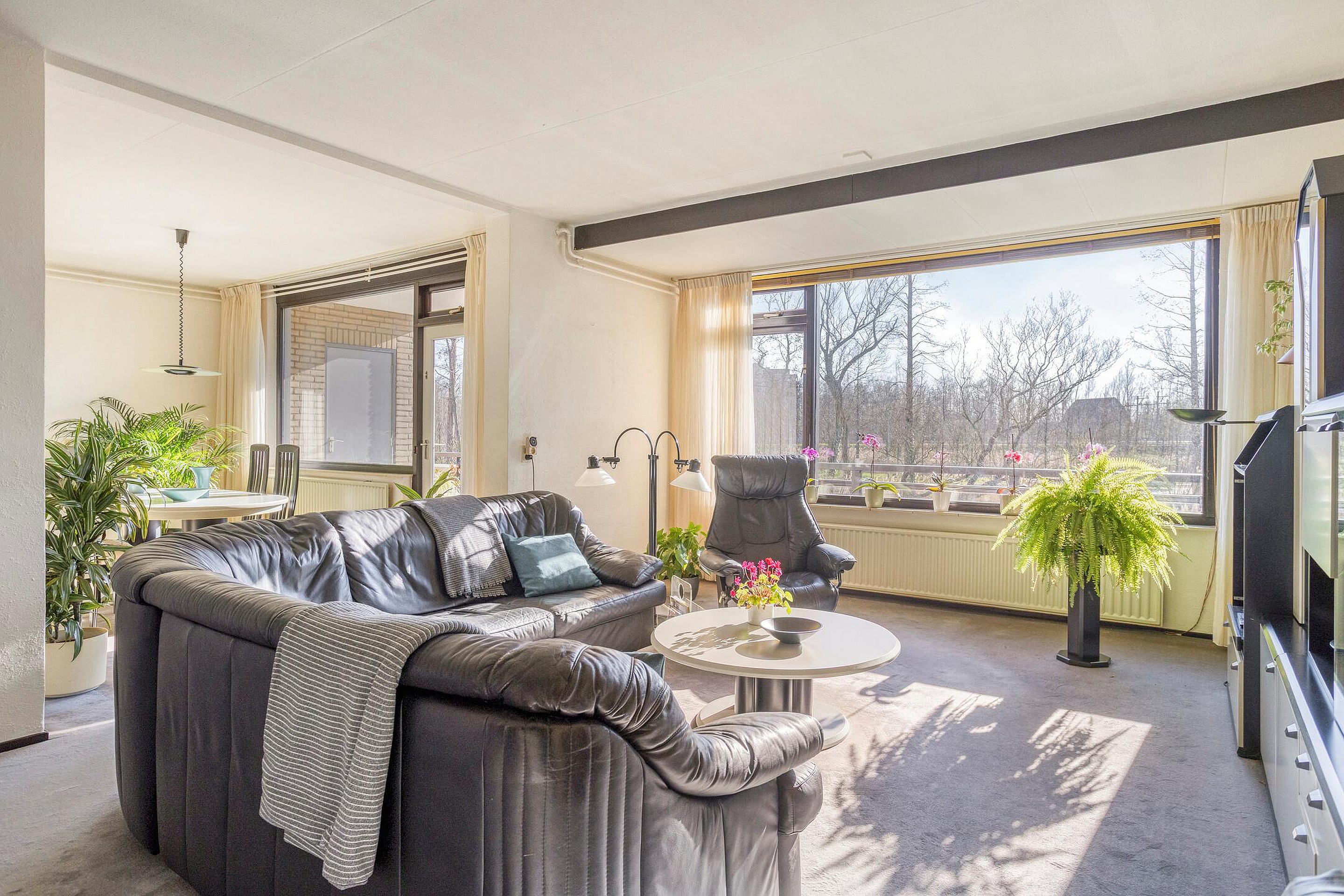 De woning beschikt over een prettige indeling met een ruime woonkamer, twee slaapkamers, een halfopen keuken en een badkamer met ligbad en douche. Het geheel is keurig onderhouden, maar vraagt om enige modernisering.