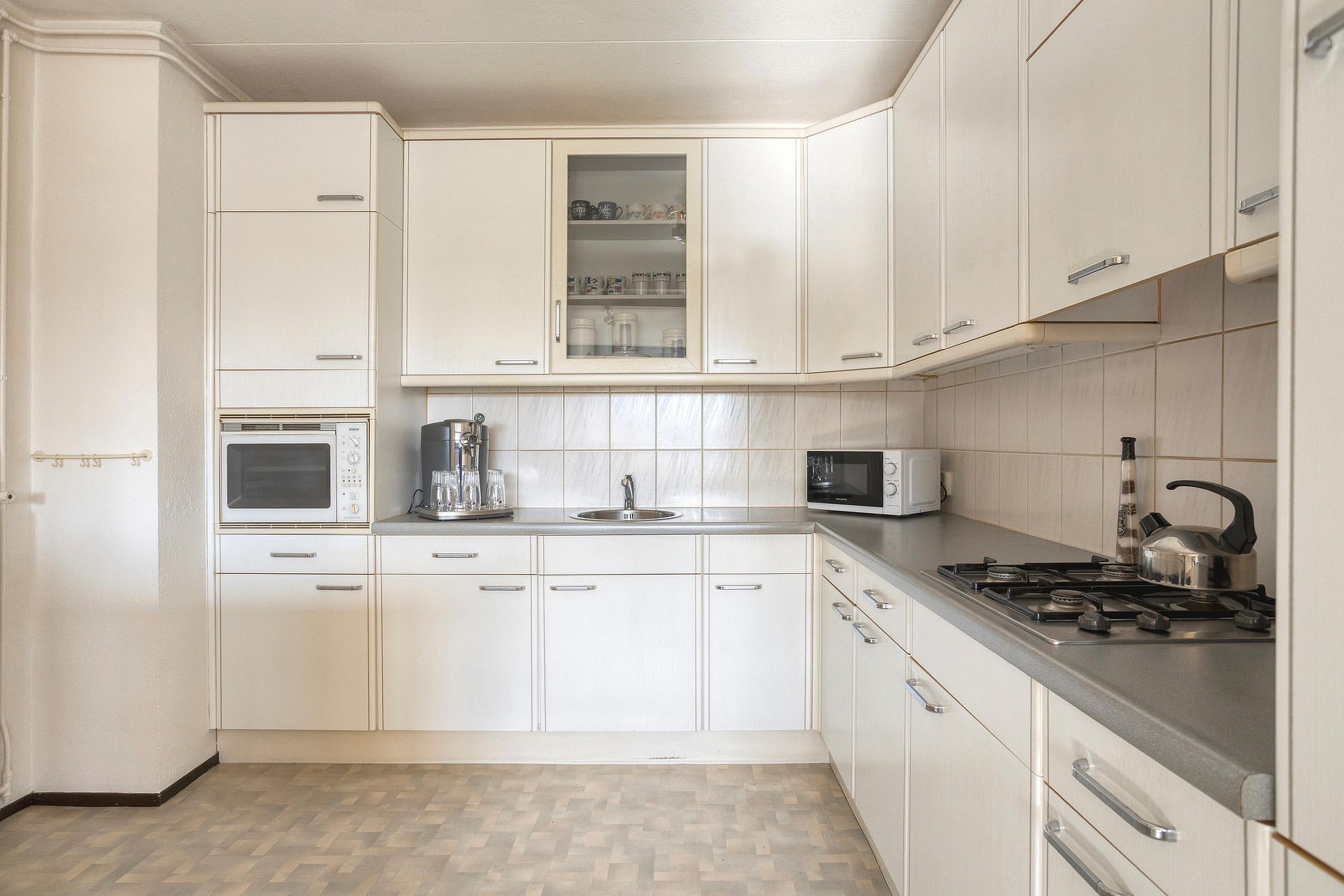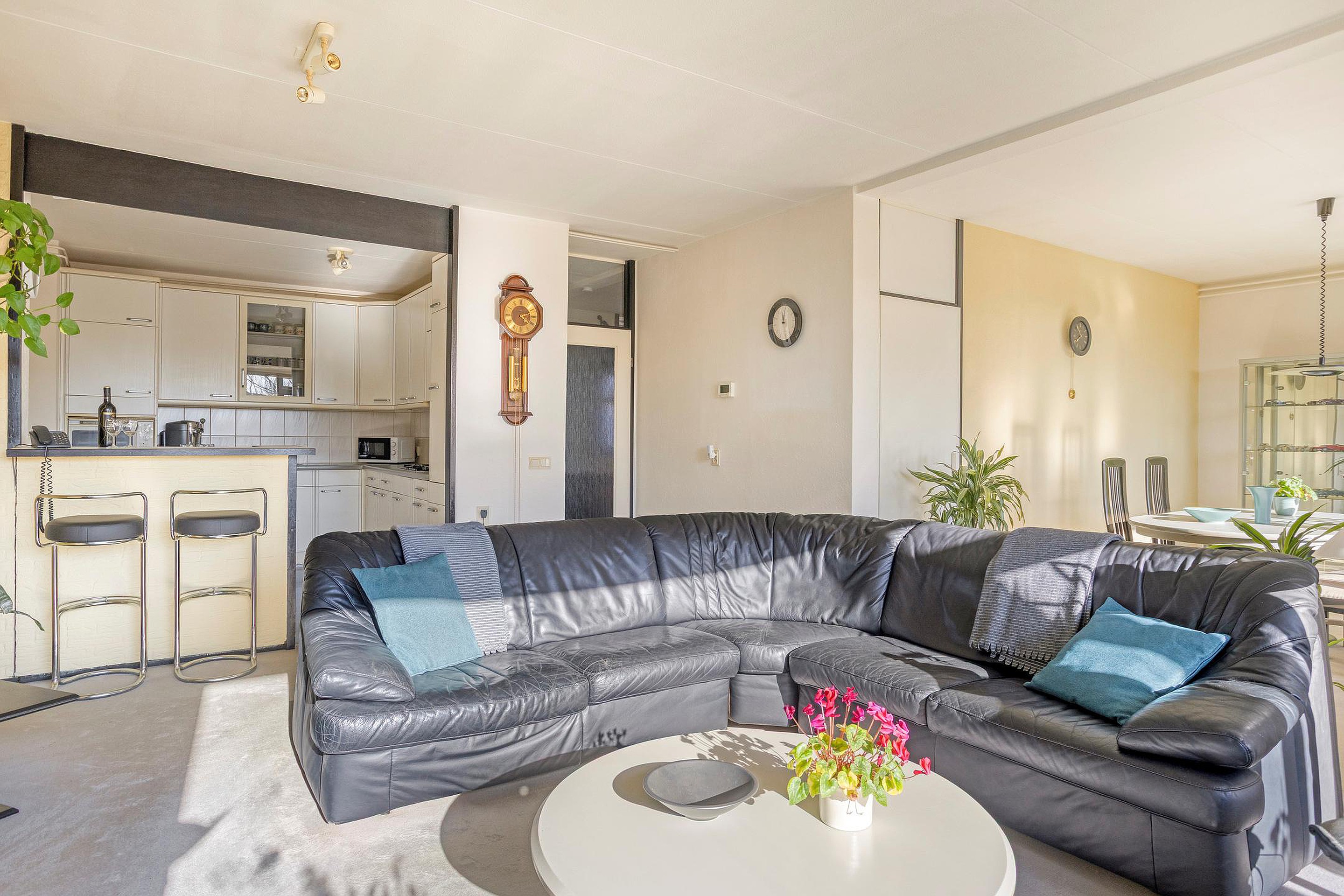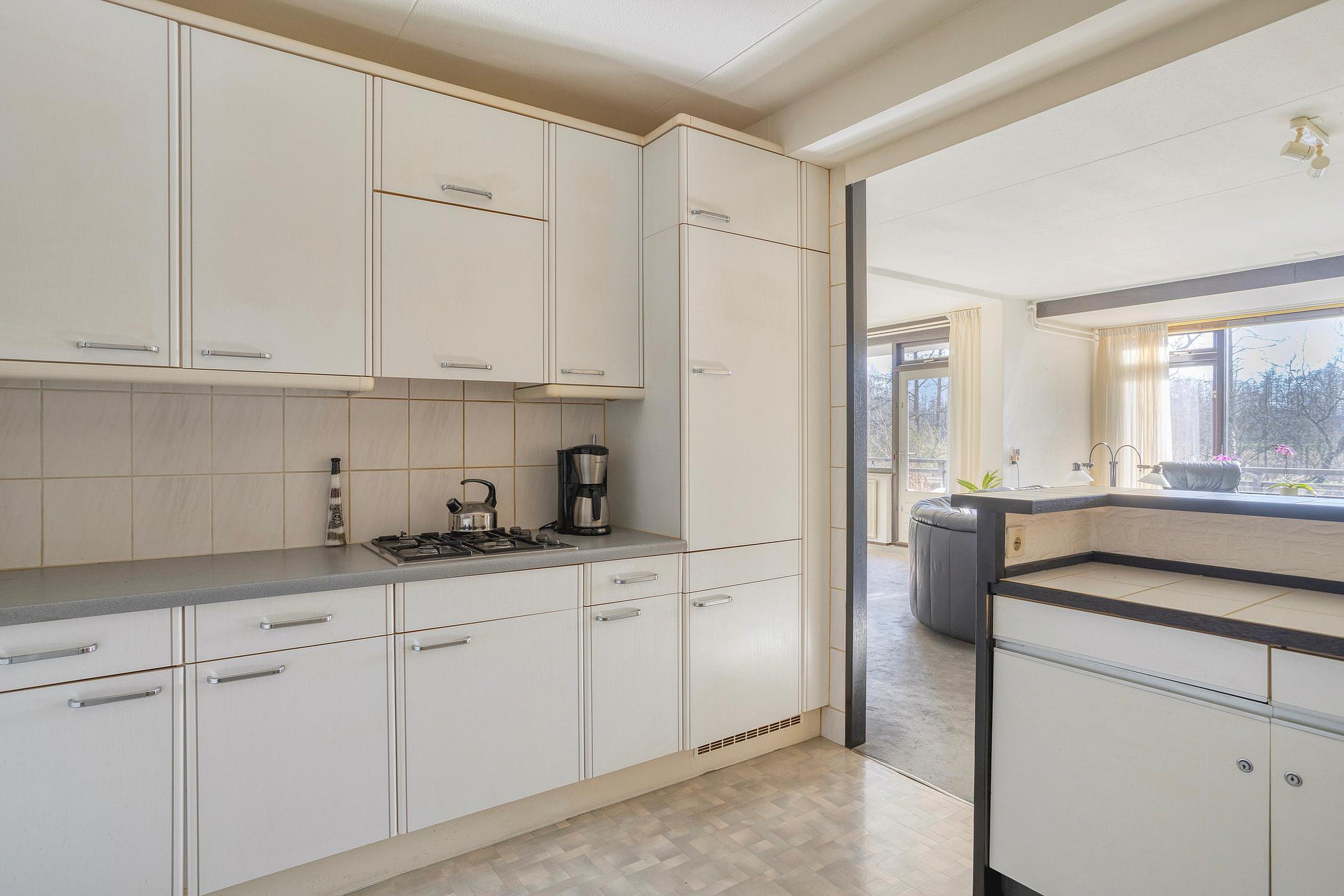 De woonkamer is heerlijk licht dankzij de gunstige ligging op het zuidoosten. Er is een zitkamer en een eetkamer en indien gewenst kunnen hier weer 2 kamers gecreëerd worden. Vanuit de eetkamer is er toegang tot het balkon van ca. 8 m2, voorzien van een vaste kast. De halfopen keuken in hoekopstelling beschikt over diverse inbouwapparatuur, waaronder een koelkast, vriezer, oven en gaskookplaat, en heeft een leuk barretje.