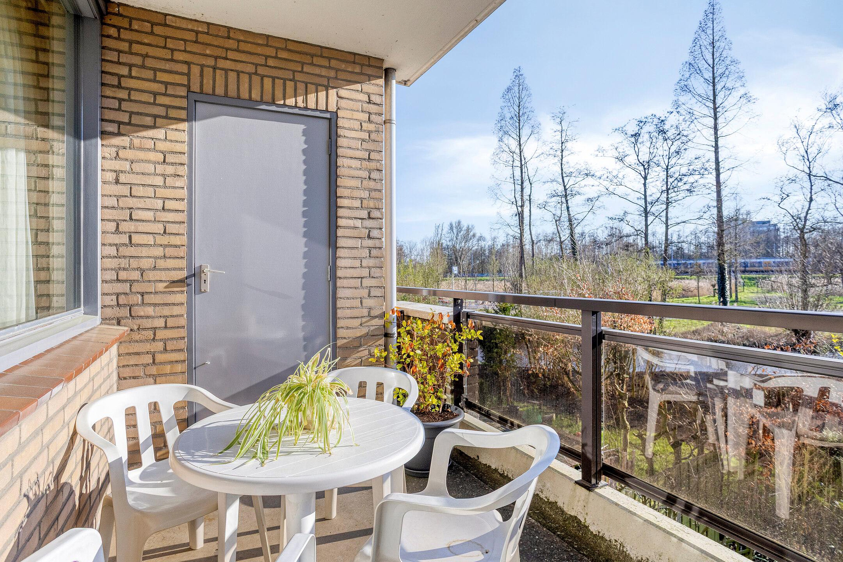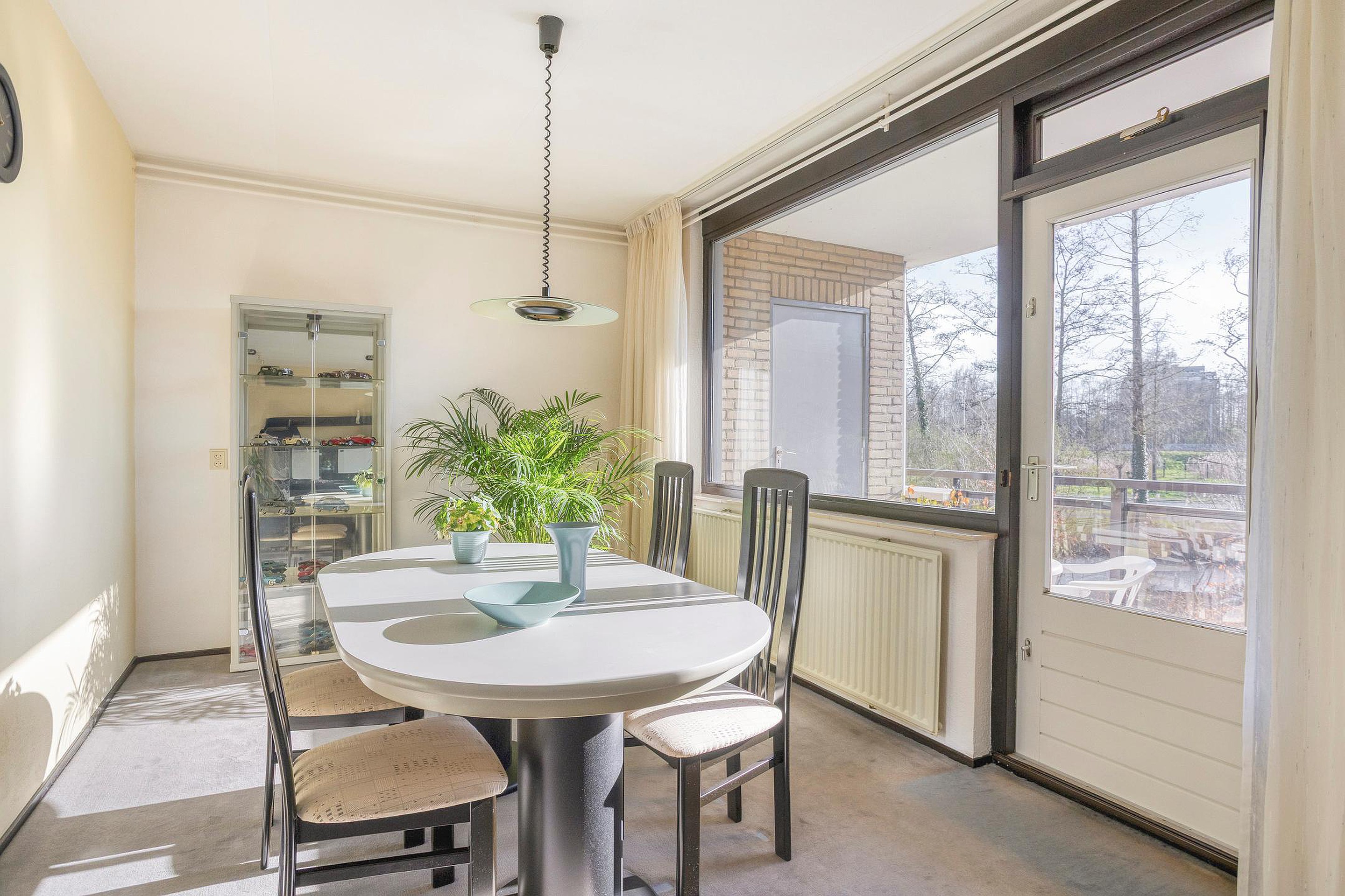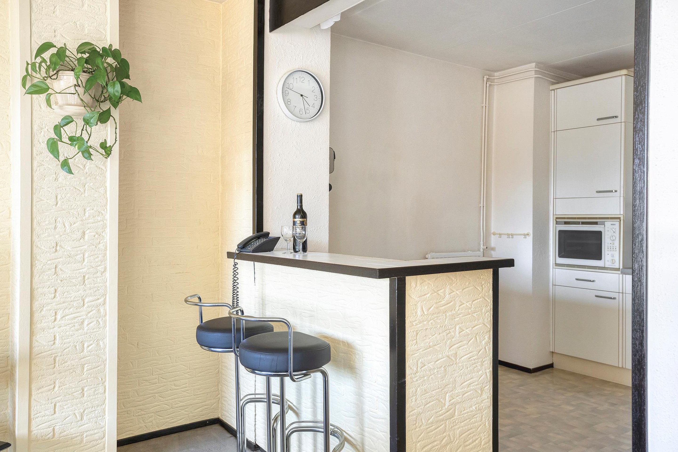 De woonkamer is heerlijk licht dankzij de gunstige ligging op het zuidoosten. Er is een zitkamer en een eetkamer en indien gewenst kunnen hier weer 2 kamers gecreëerd worden. Vanuit de eetkamer is er toegang tot het balkon van ca. 8 m2, voorzien van een vaste kast. De halfopen keuken in hoekopstelling beschikt over diverse inbouwapparatuur, waaronder een koelkast, vriezer, oven en gaskookplaat, en heeft een leuk barretje.