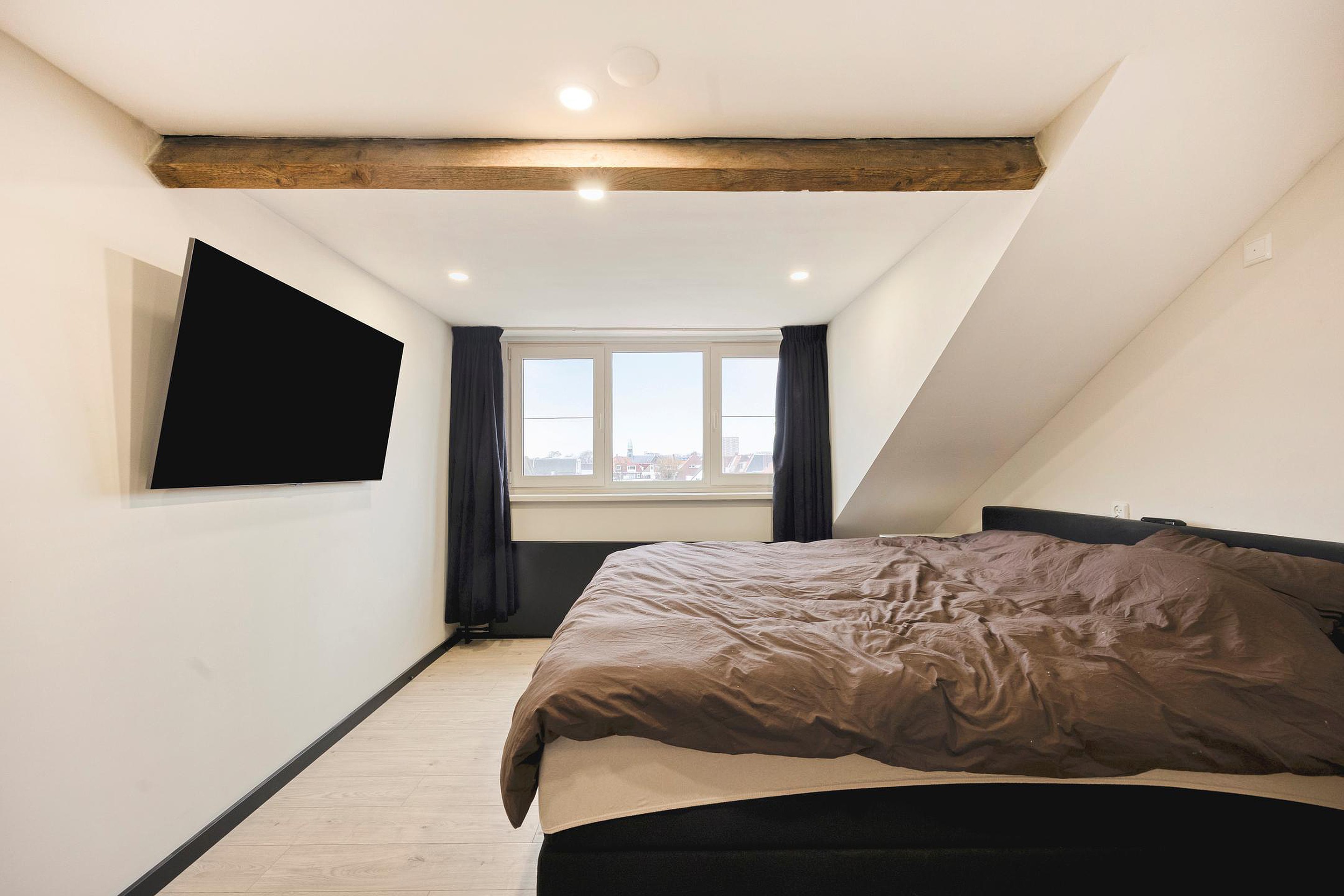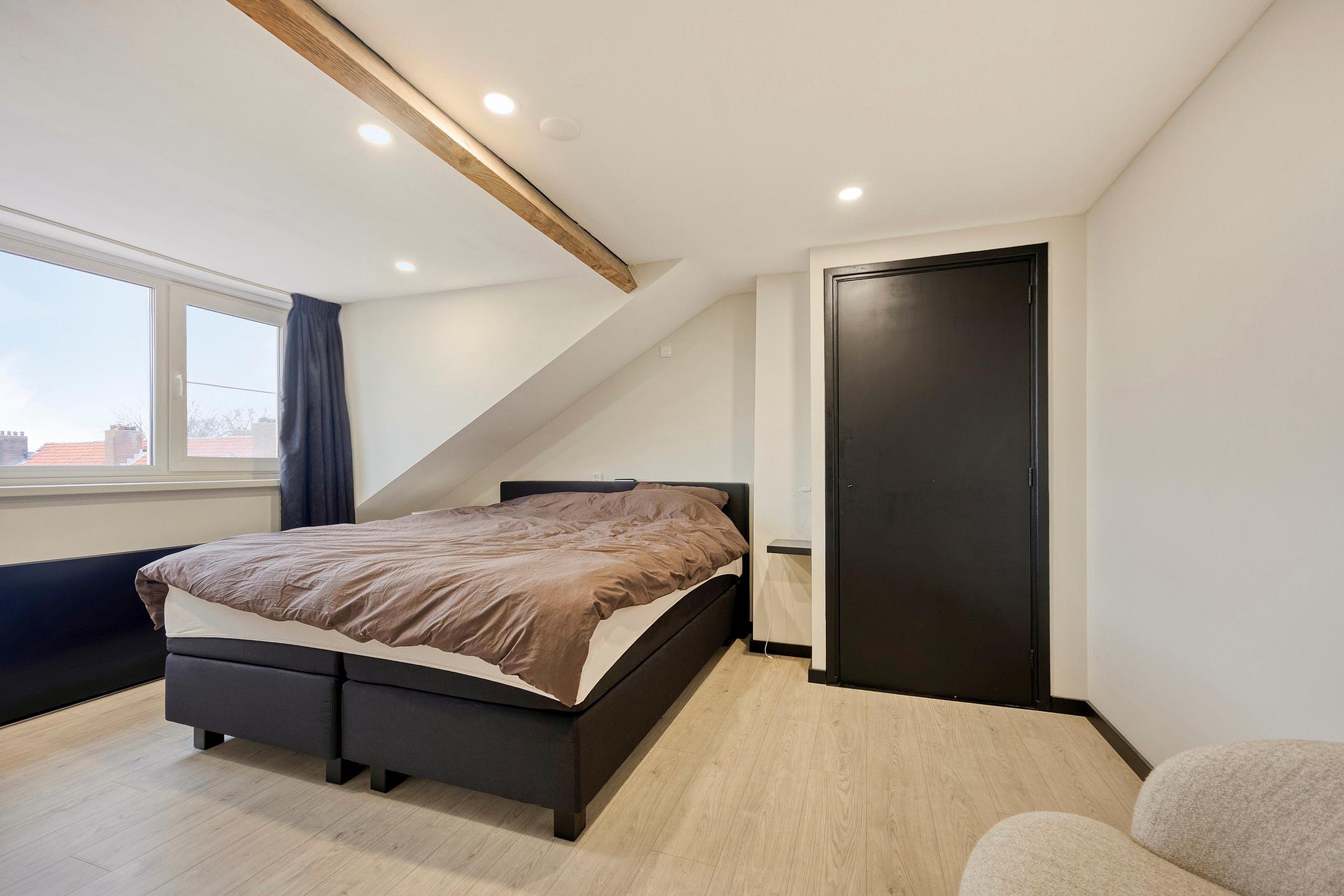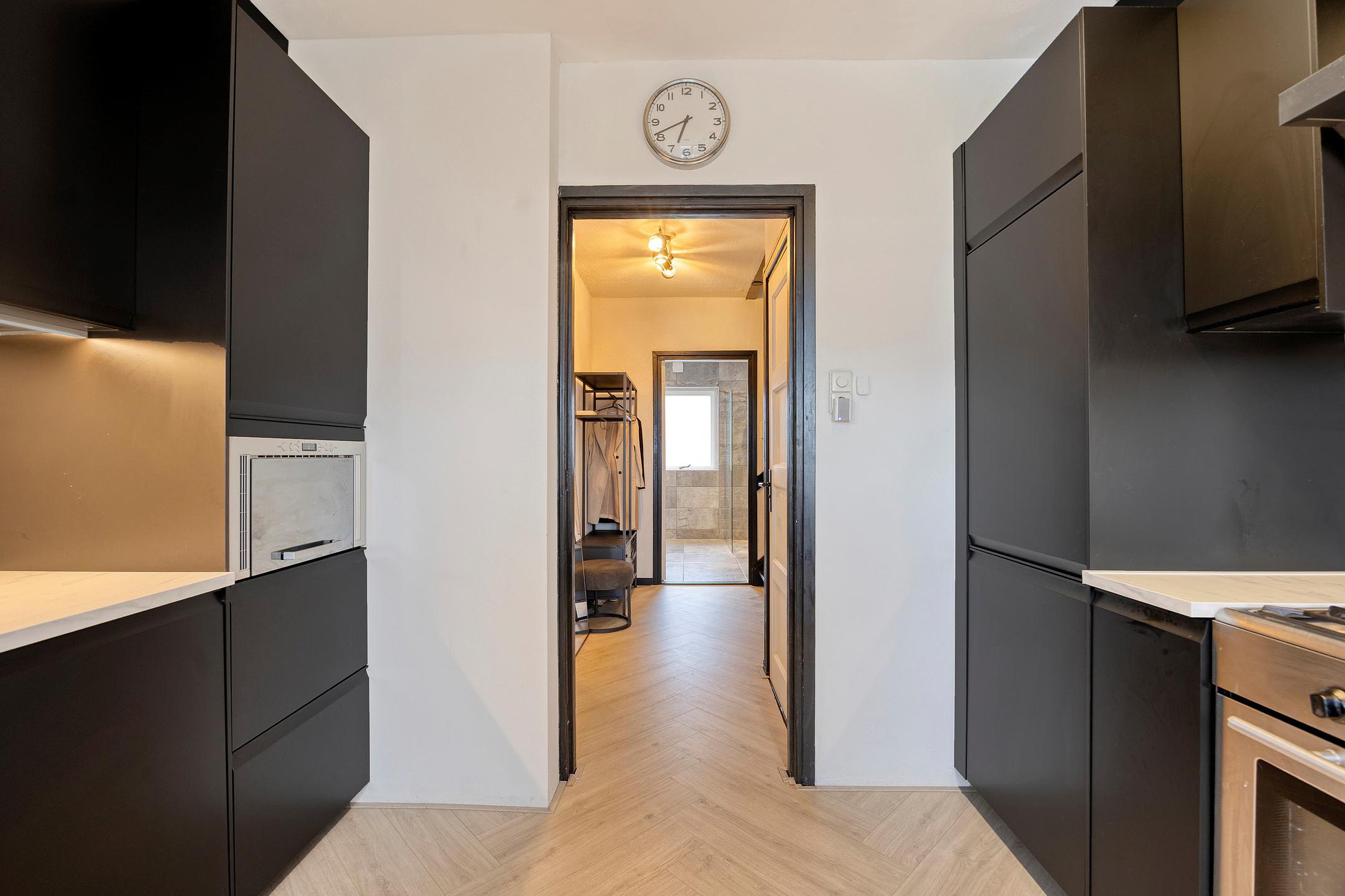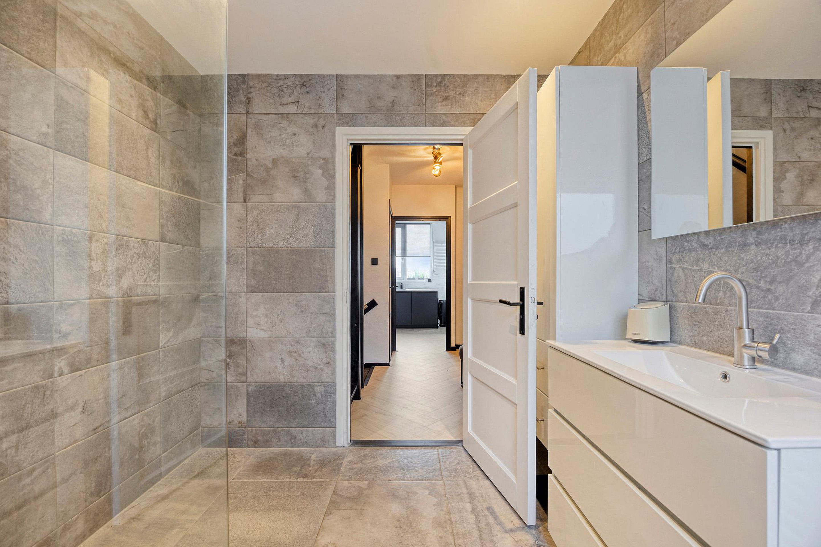 1e verdieping: overloop, toilet, ruime doorzonwoonkamer met een elektrische haard en een loopdeur naar het grote dakterras (N/W), recente en luxe keuken met diverse inbouwapparatuur en een 2e loopdeur naar het dakterras, moderne badkamer met een inloopdouche met een glaswand en wastafelmeubel, separaat toilet.