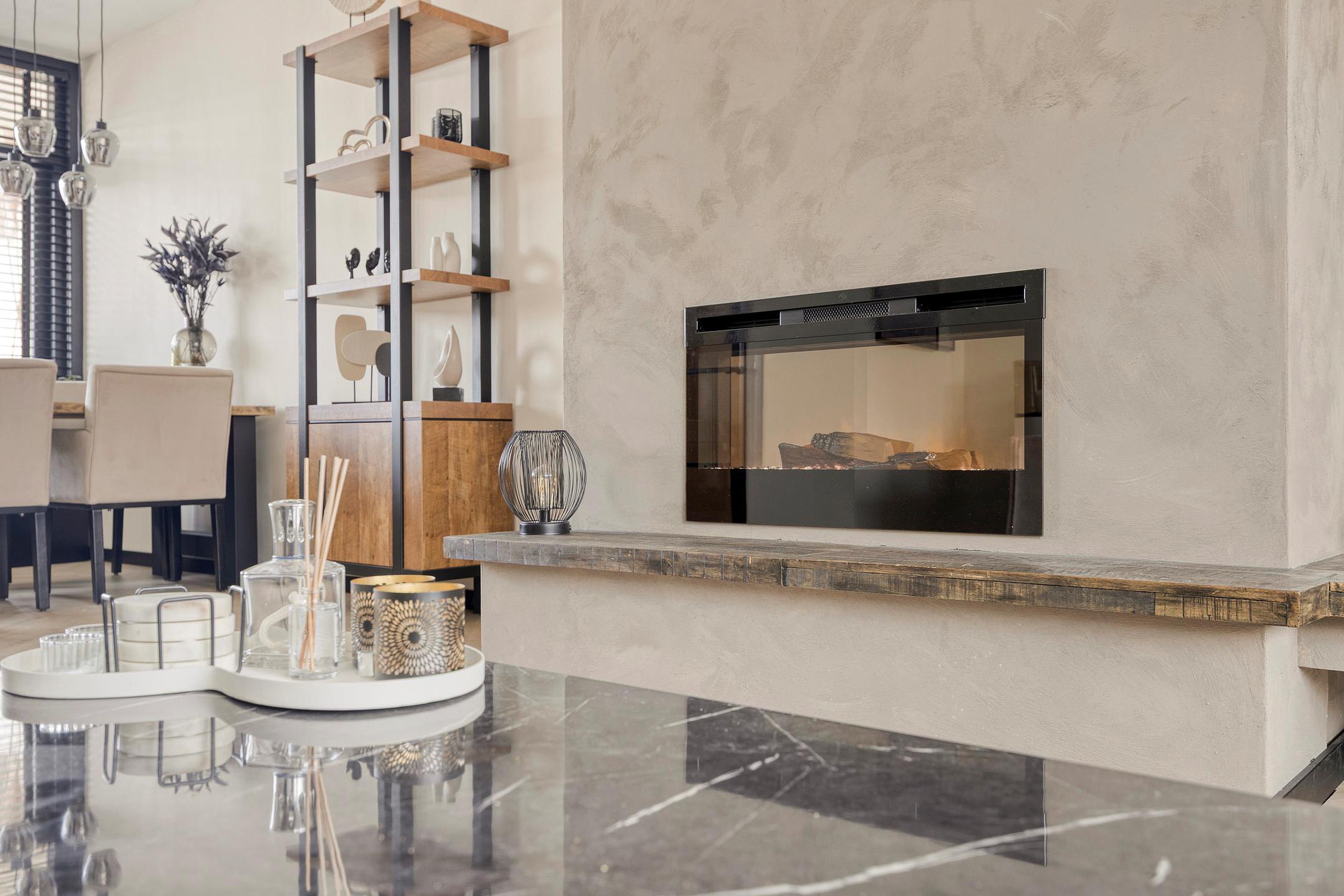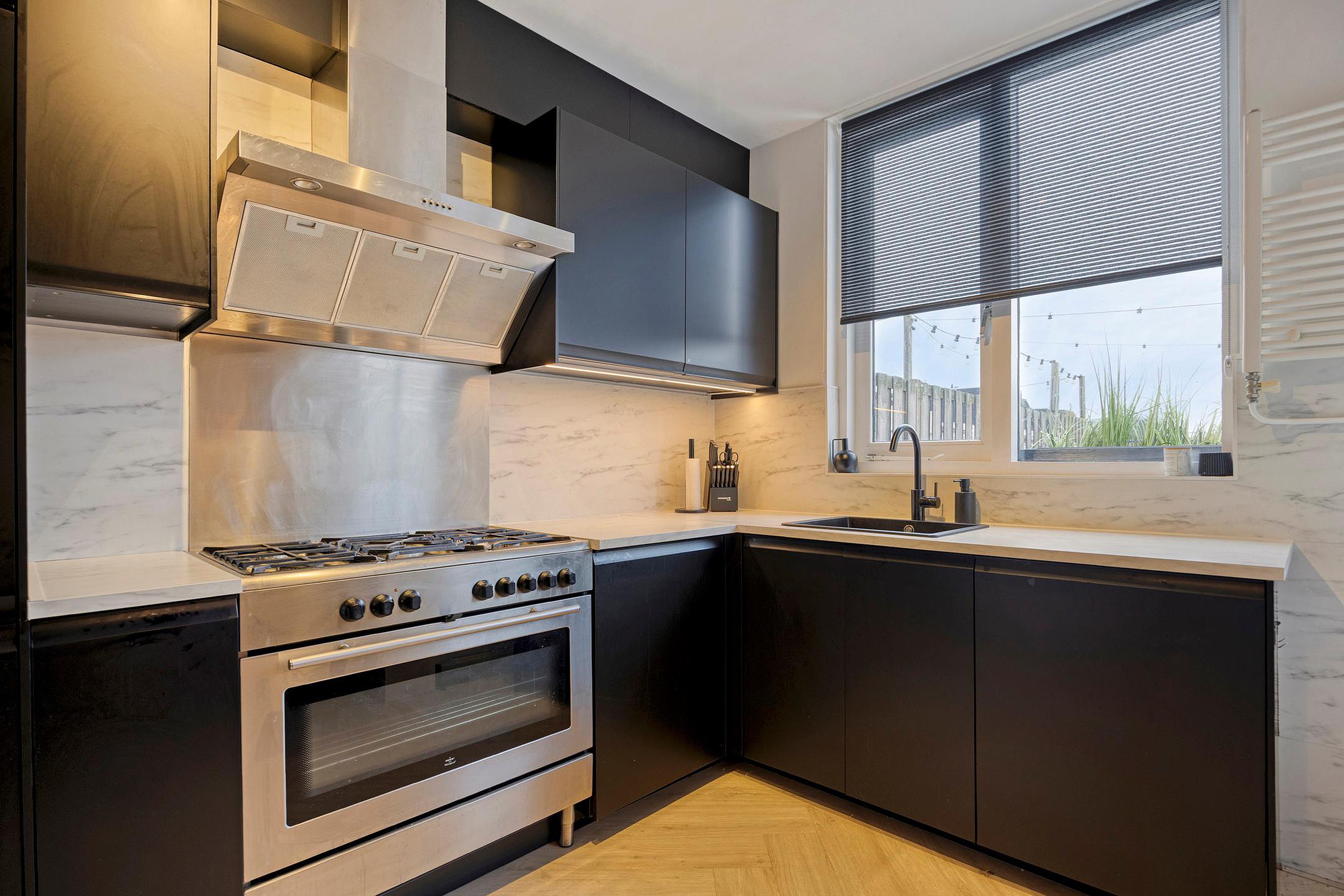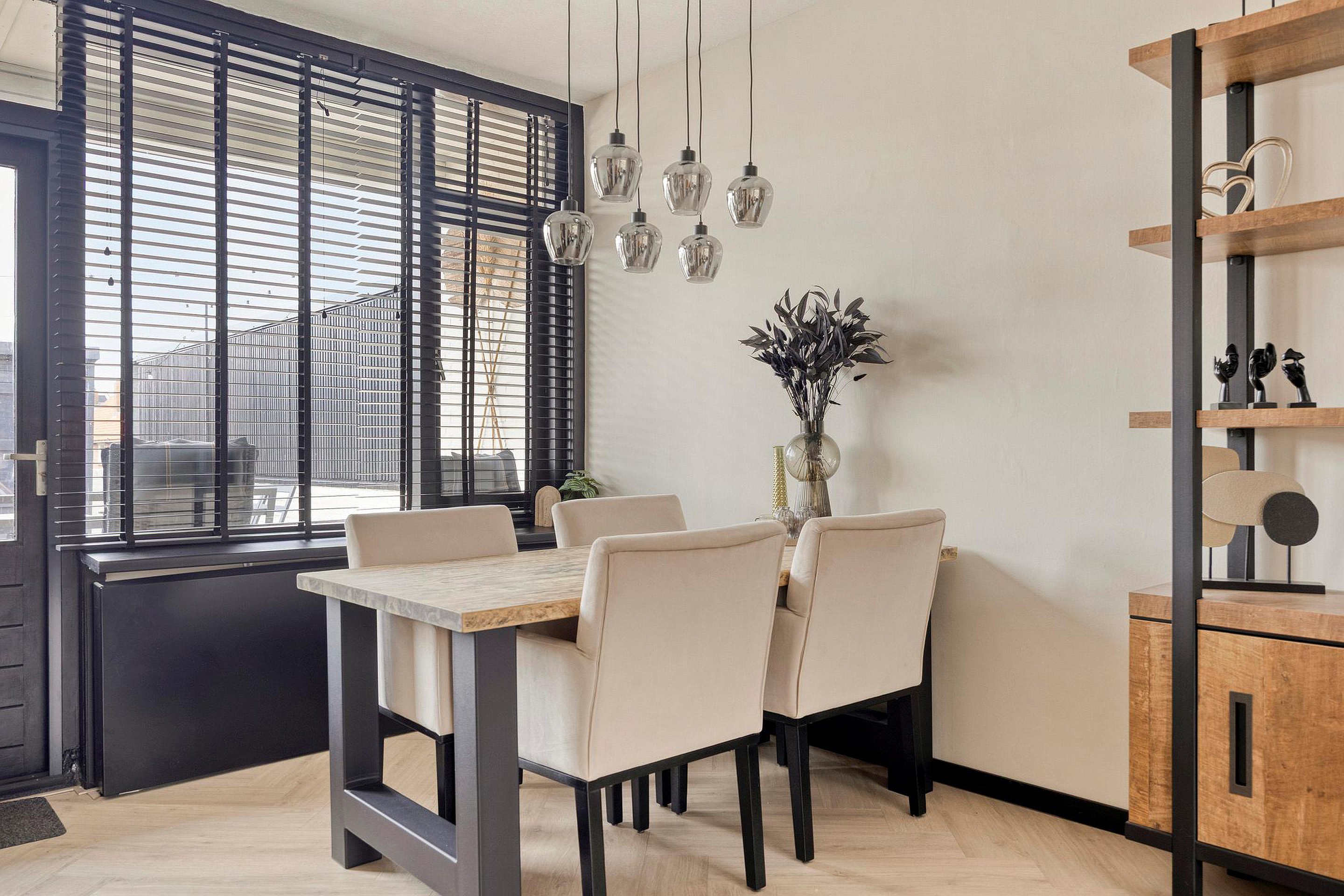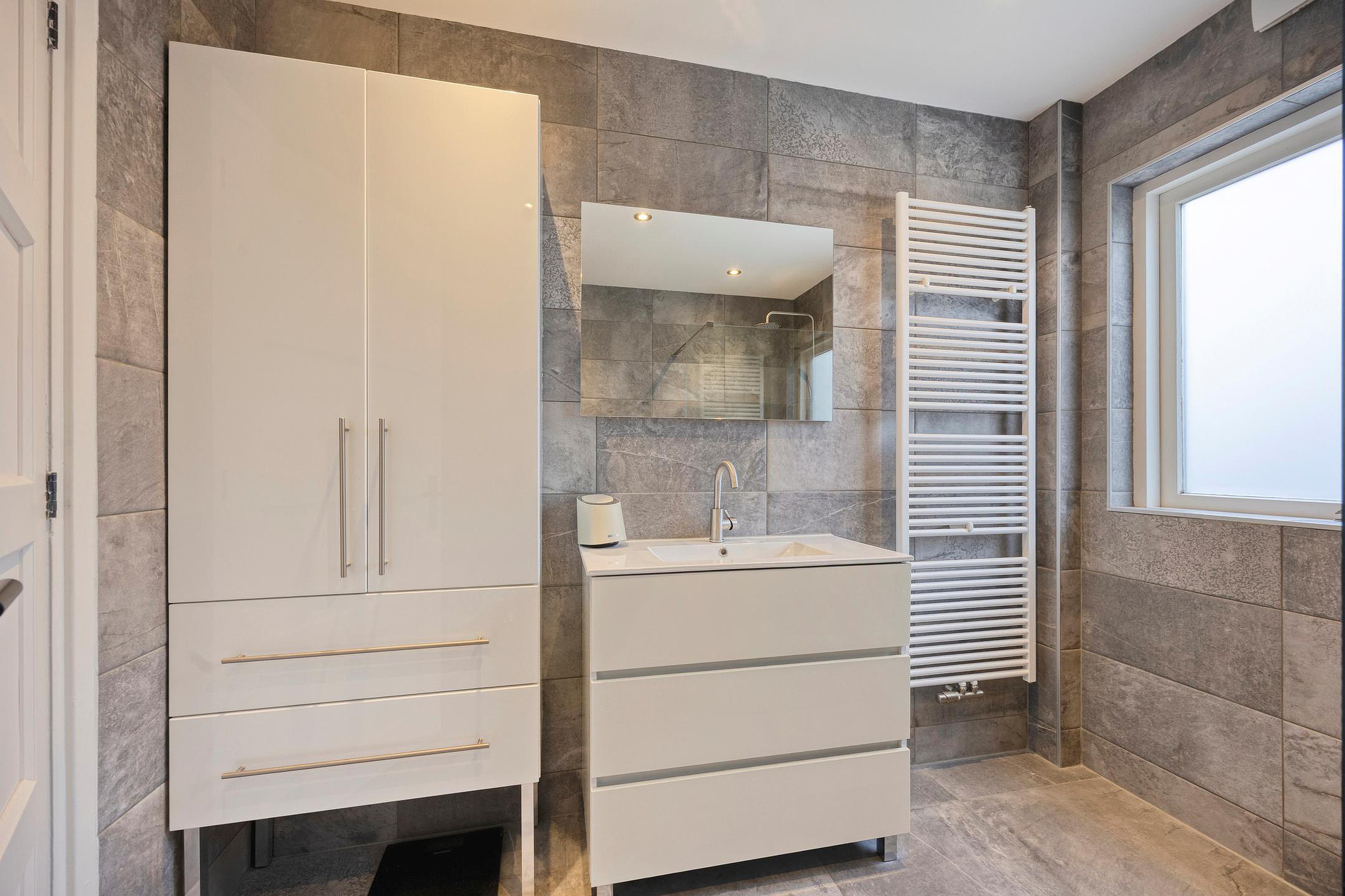 1e verdieping: overloop, toilet, ruime doorzonwoonkamer met een elektrische haard en een loopdeur naar het grote dakterras (N/W), recente en luxe keuken met diverse inbouwapparatuur en een 2e loopdeur naar het dakterras, moderne badkamer met een inloopdouche met een glaswand en wastafelmeubel, separaat toilet.
