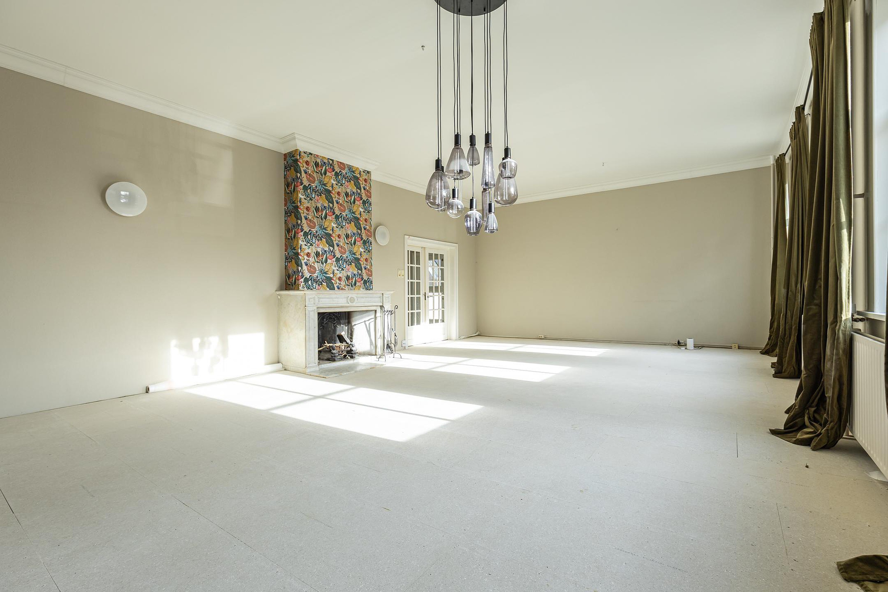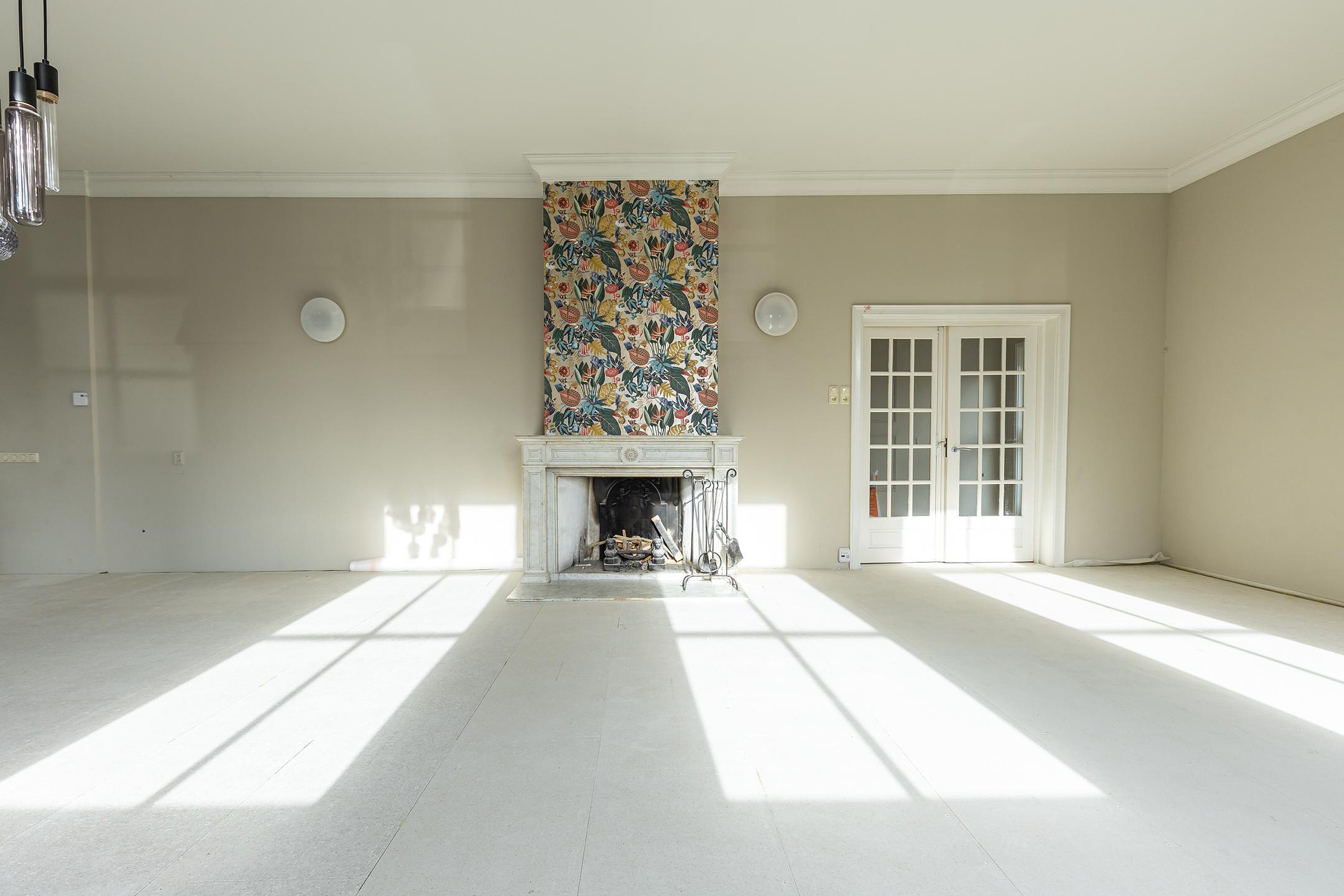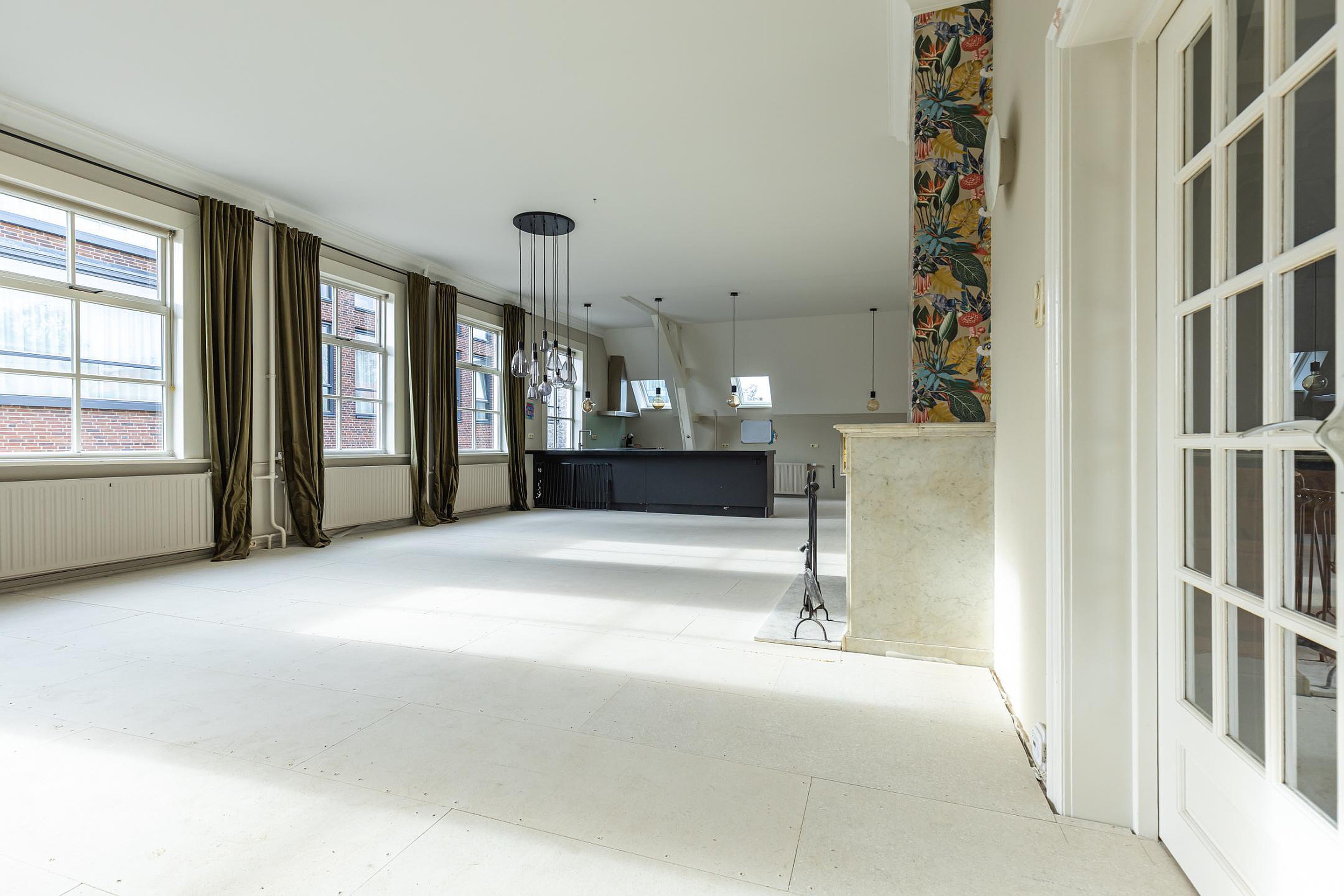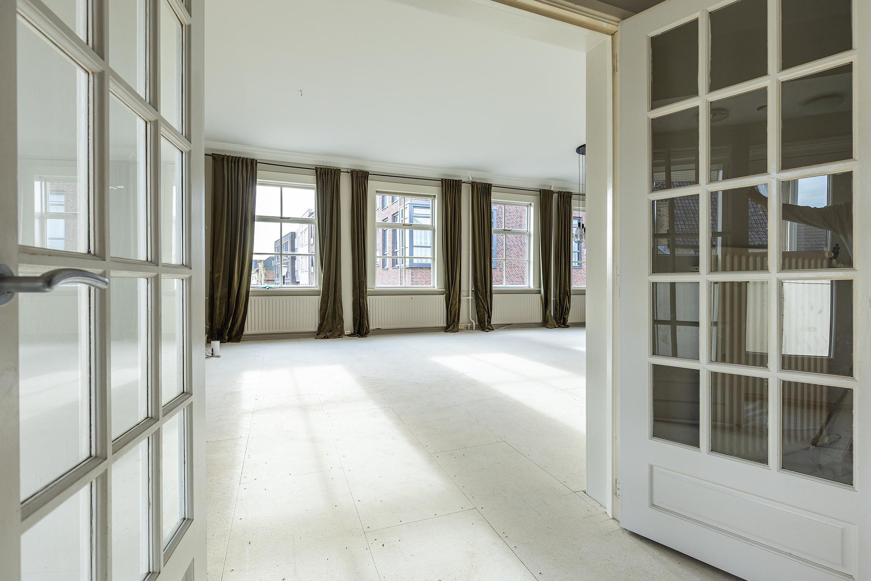 Aan de voorzijde ligt de indrukwekkende voormalige raadzaal, nu een royale woonkamer met hoge plafonds, veel licht en grote ramen. De volledige vloer is recent verwijderd en uitgevoerd met een vernieuwde, geïsoleerde en brandvertragende constructie. De woonlaag is hiermee direct klaar voor een nieuwe houten vloer of andere passende afwerking naar wens.