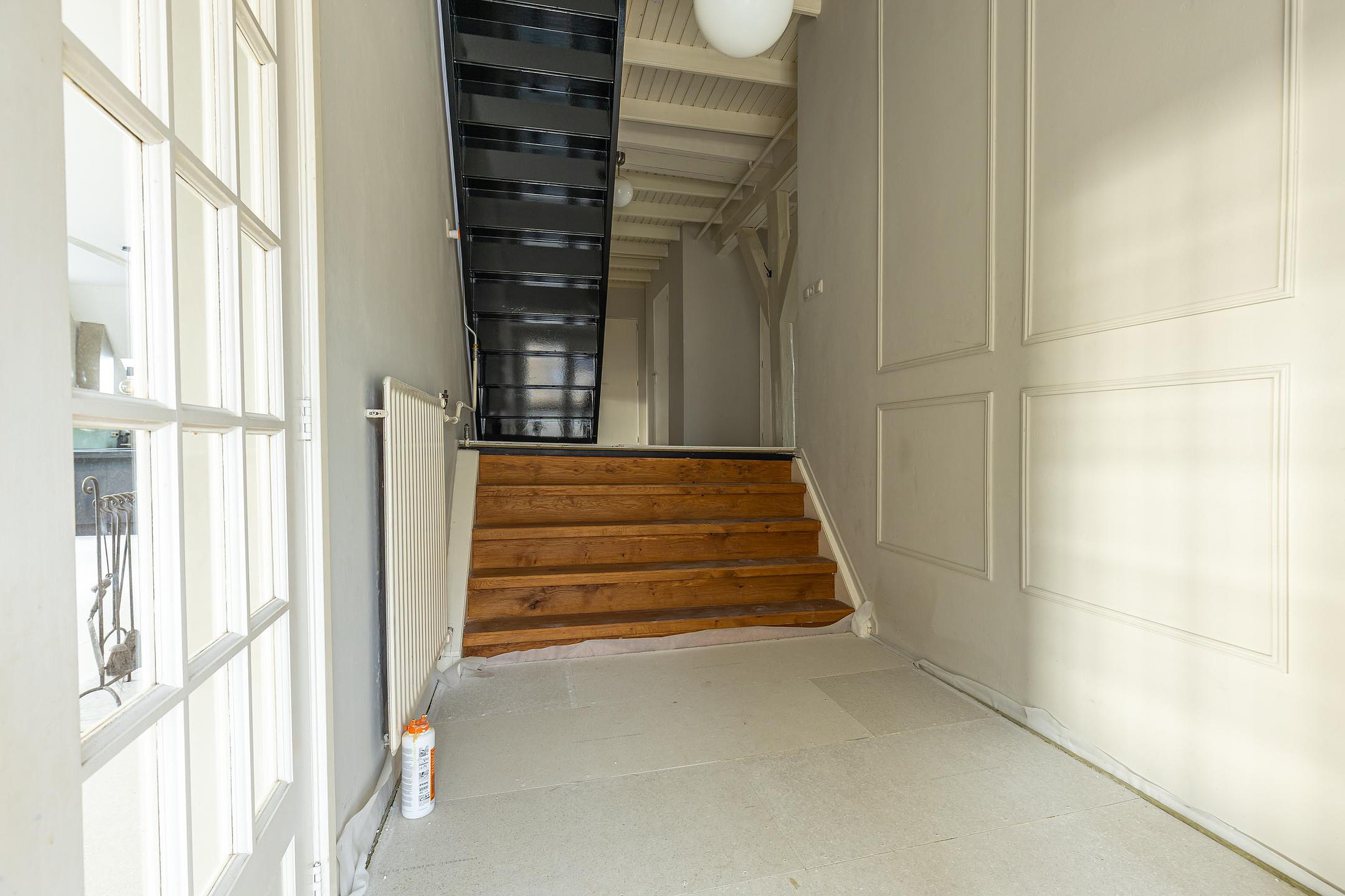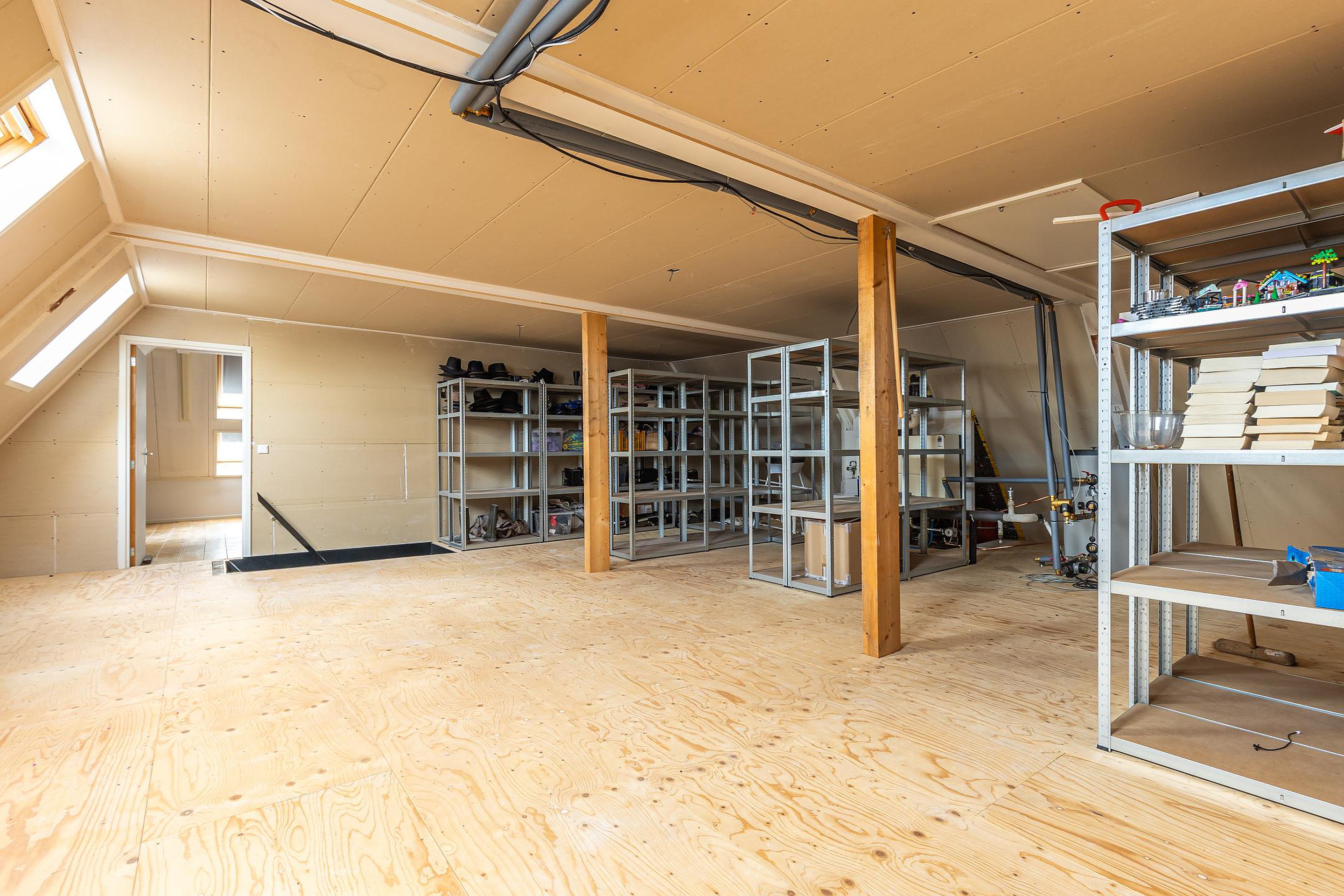 De vaste trap leidt naar de indrukwekkende zolderverdieping. De prachtige houten balkconstructie geeft deze verdieping direct sfeer. De voorzolder biedt volop ruimte voor opbergen, een werkplek of hobbyruimte.