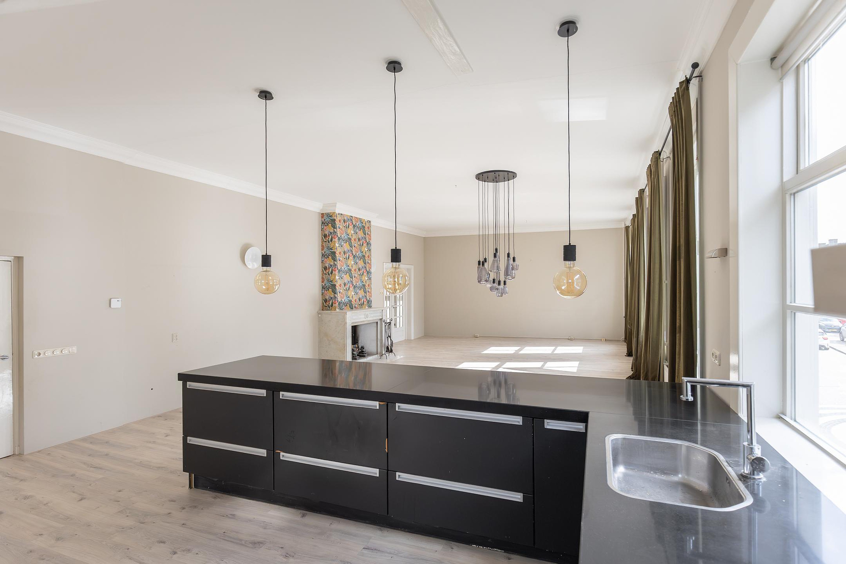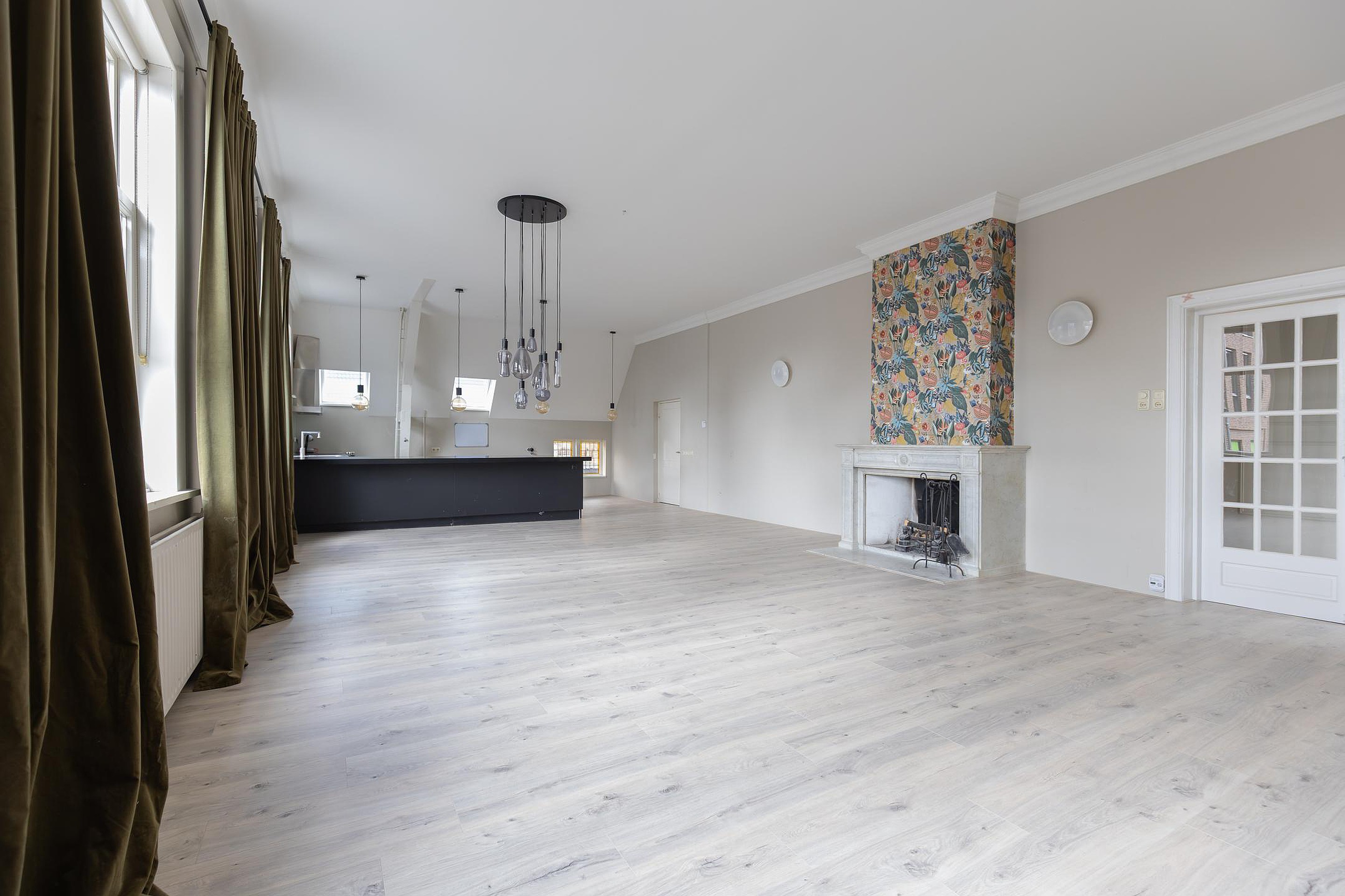 Aan de voorzijde ligt de indrukwekkende voormalige raadzaal, nu een royale woonkamer met hoge plafonds, veel licht en grote ramen. De volledige vloer is recent verwijderd en uitgevoerd met een vernieuwde, geïsoleerde en brandvertragende constructie. De woonlaag is hiermee direct klaar voor een nieuwe houten vloer of andere passende afwerking naar wens.